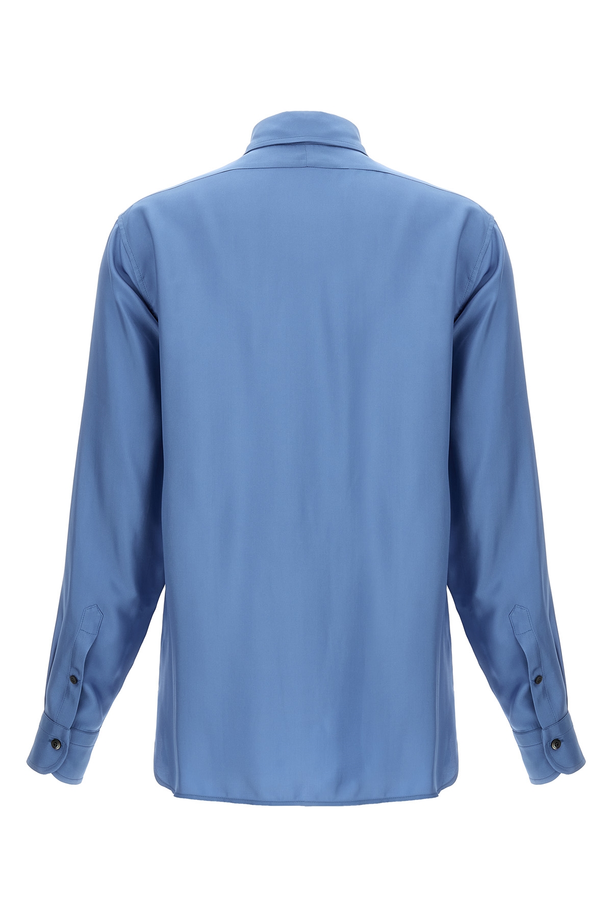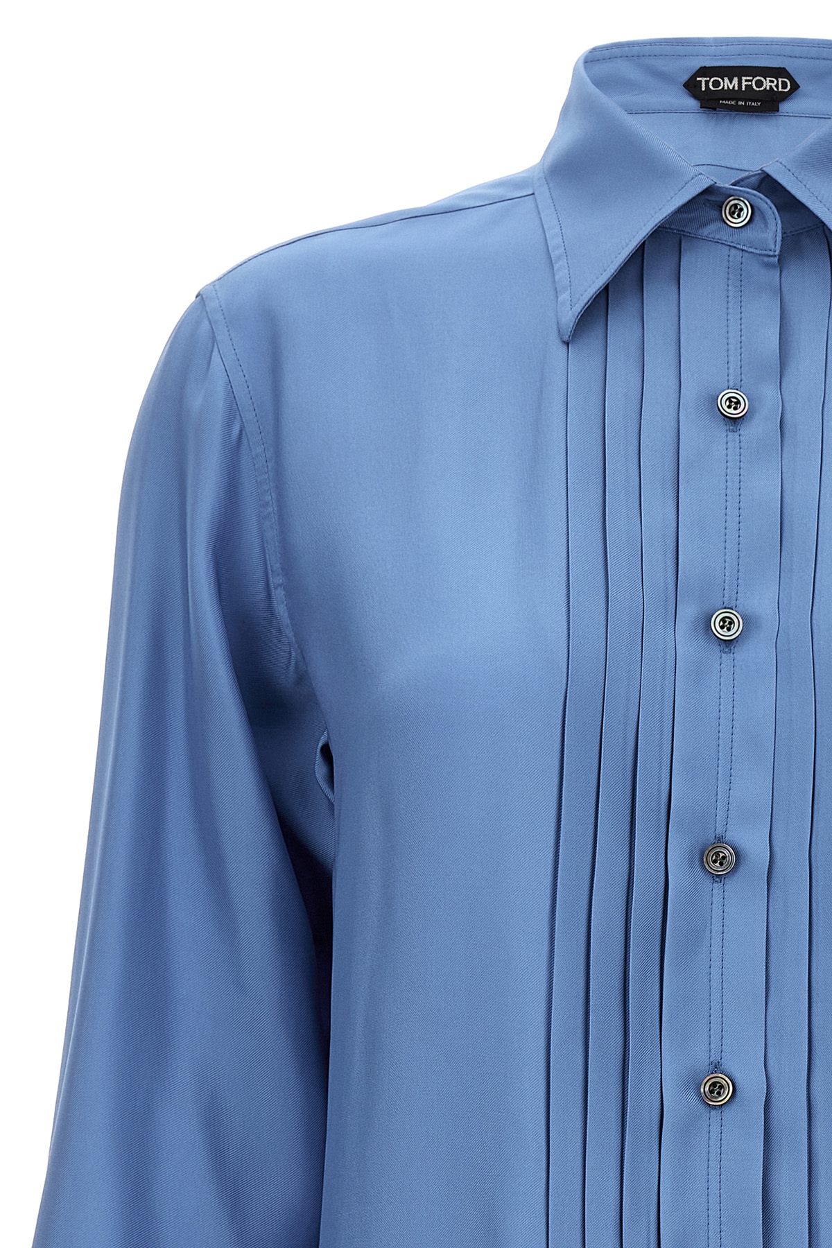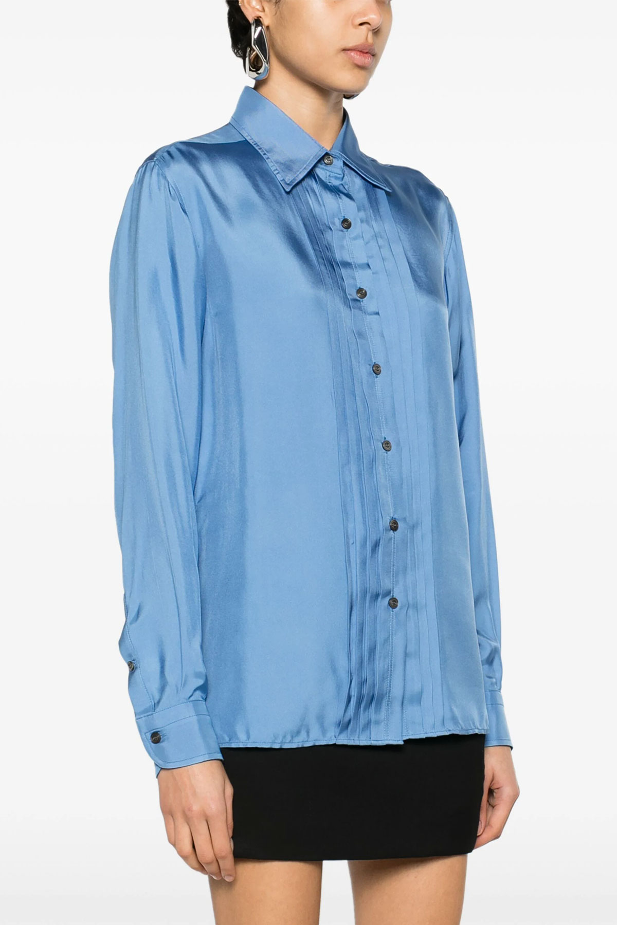 Viscose silk blend shirt with pleated plastron, button closure.
