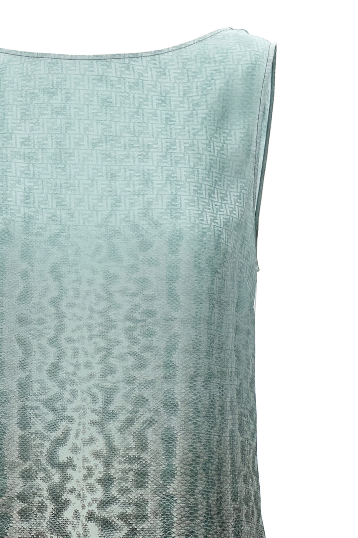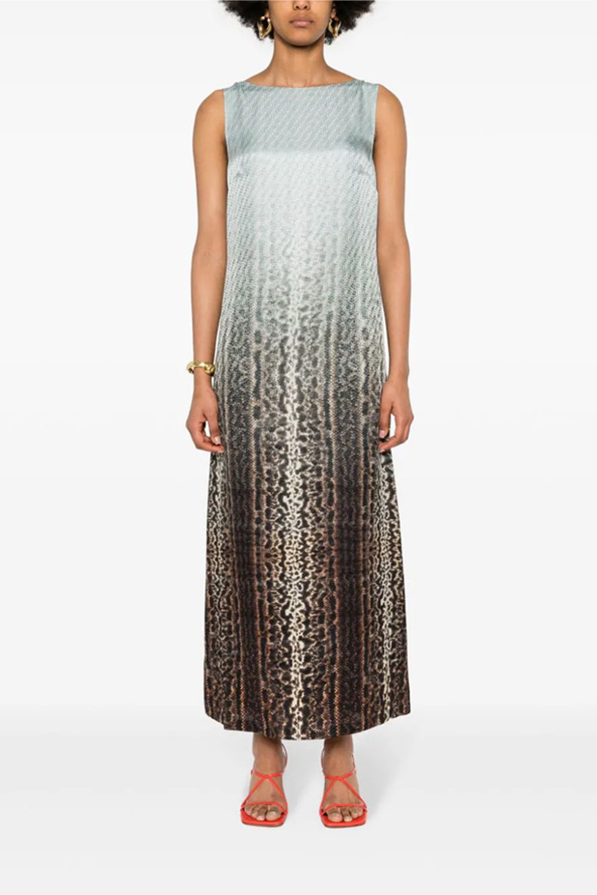 Sleeveless silk dress with animal print and degrade effect, midi with fluid skirt, bare back with metal lace detail.