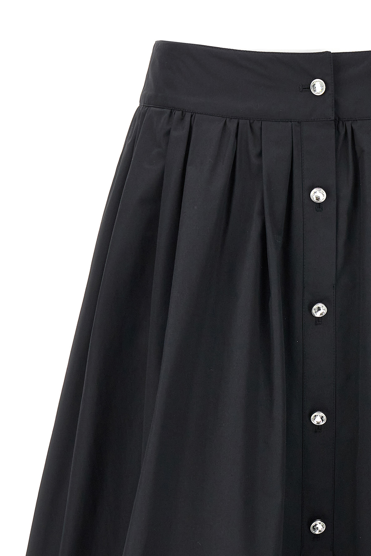 Nylon blend skirt with front closure, jewel buttons, pockets.