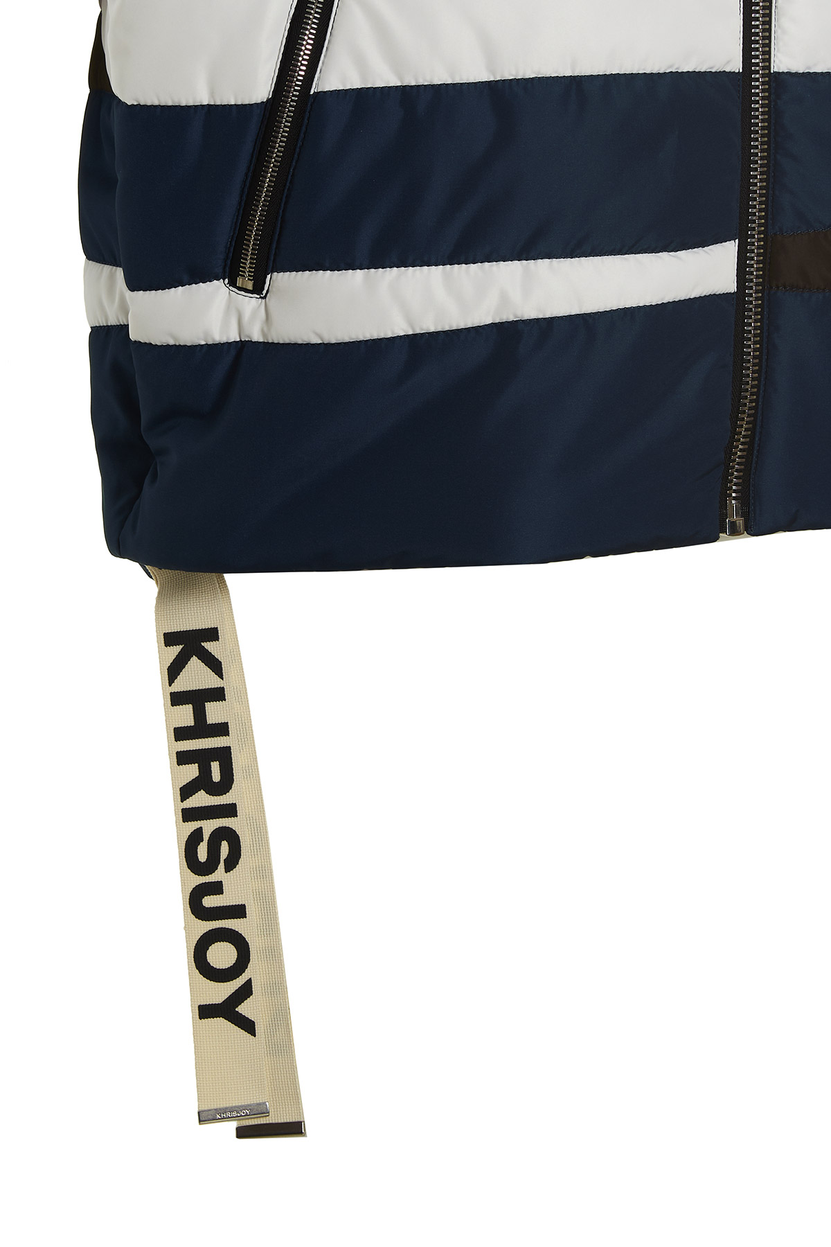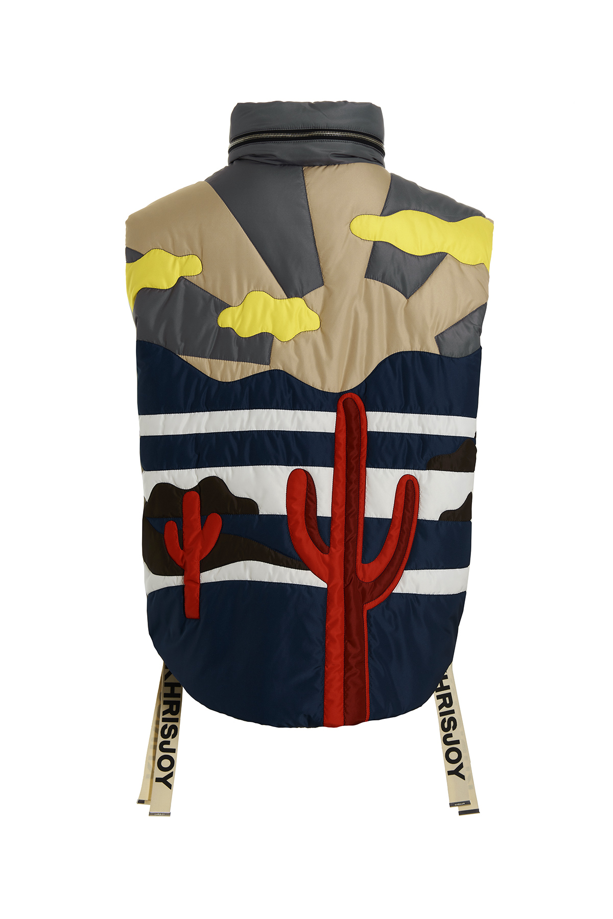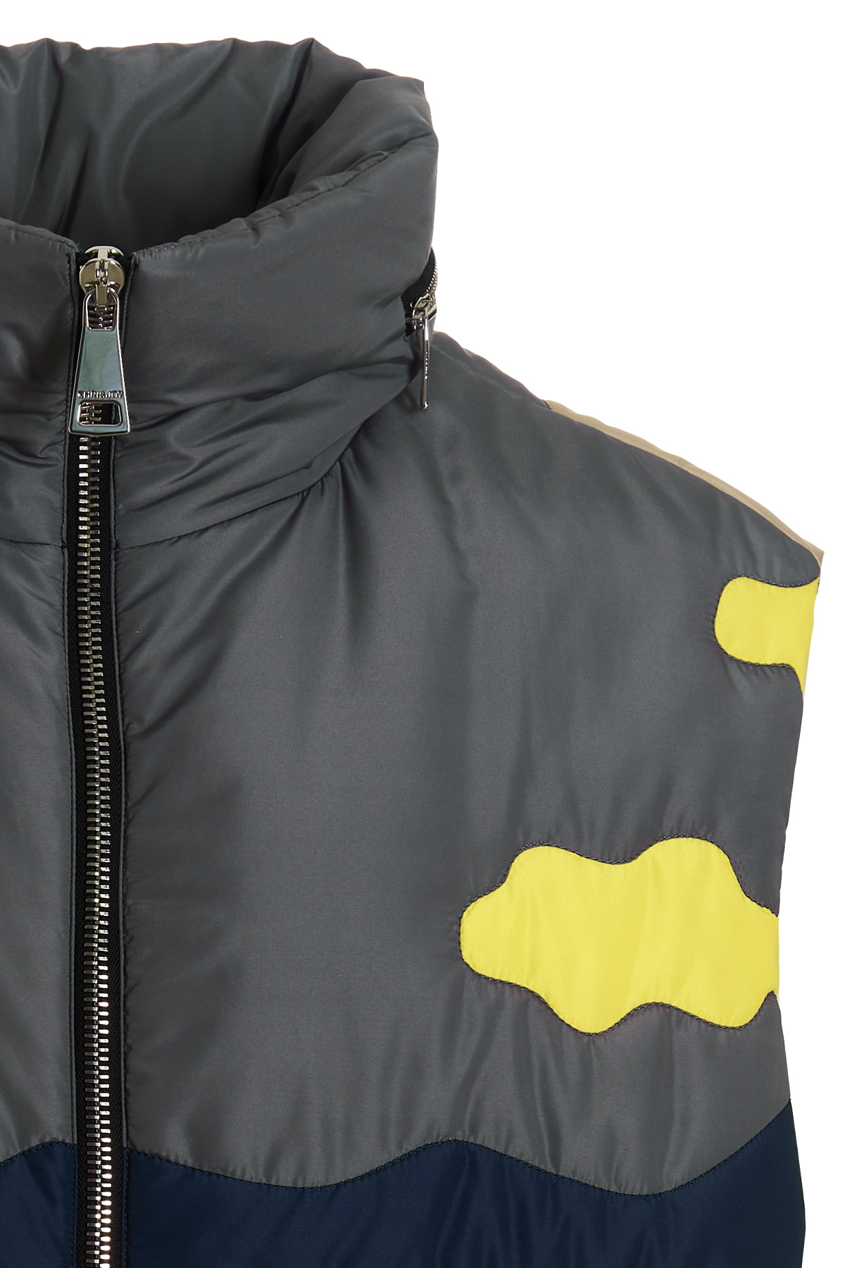 Cactus' oversize patchwork colorblock nylon vest with imbedded collar, front macro zip closure, two side zipped pockets, drawstring at the bottom with contrast logo, tech fabric lining and a rounded asymmetric hem.