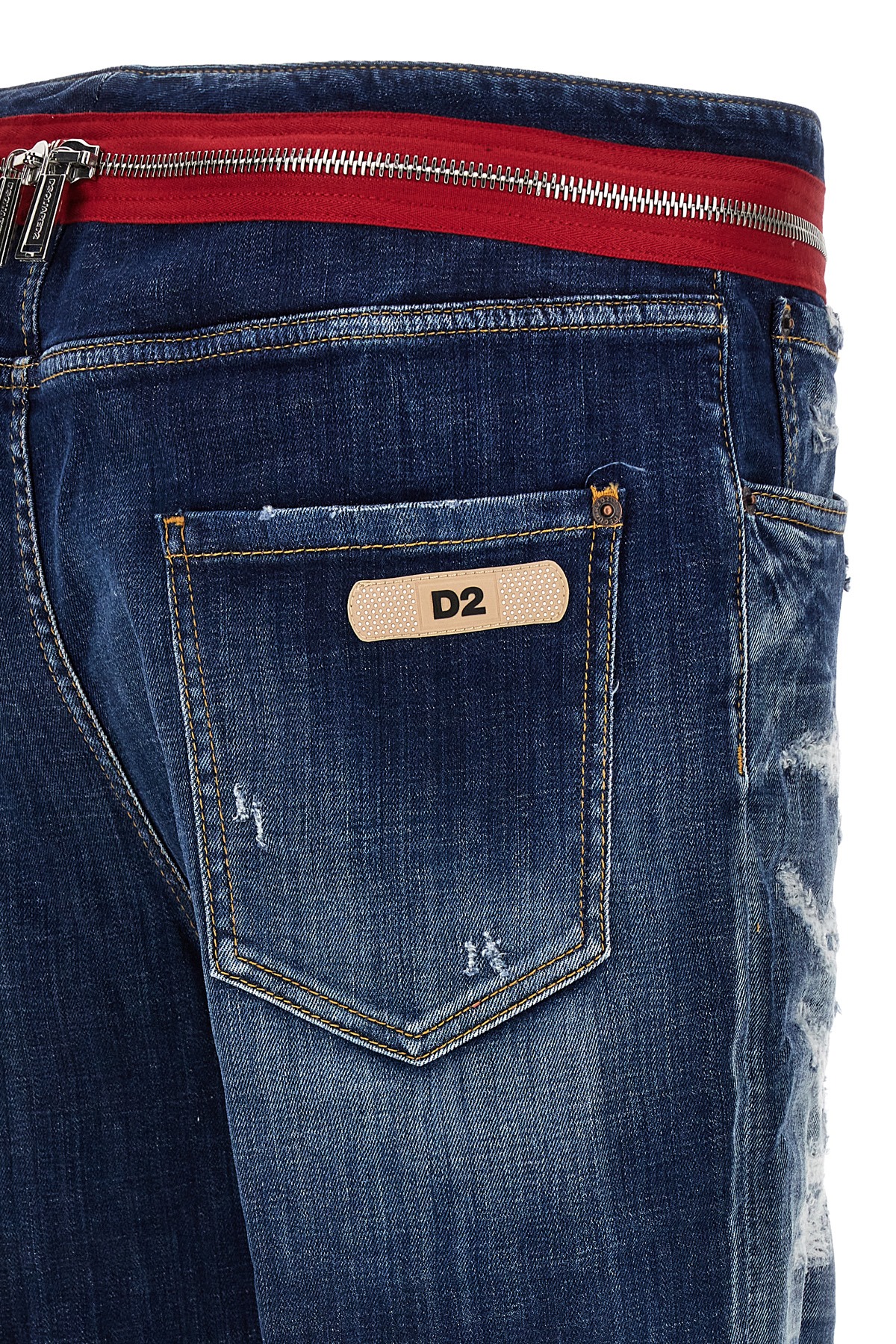 '642' stretch cotton denim jeans with destroyed effect details, button closure, five pockets, zip detail that opens at the waist, and back logo patch.