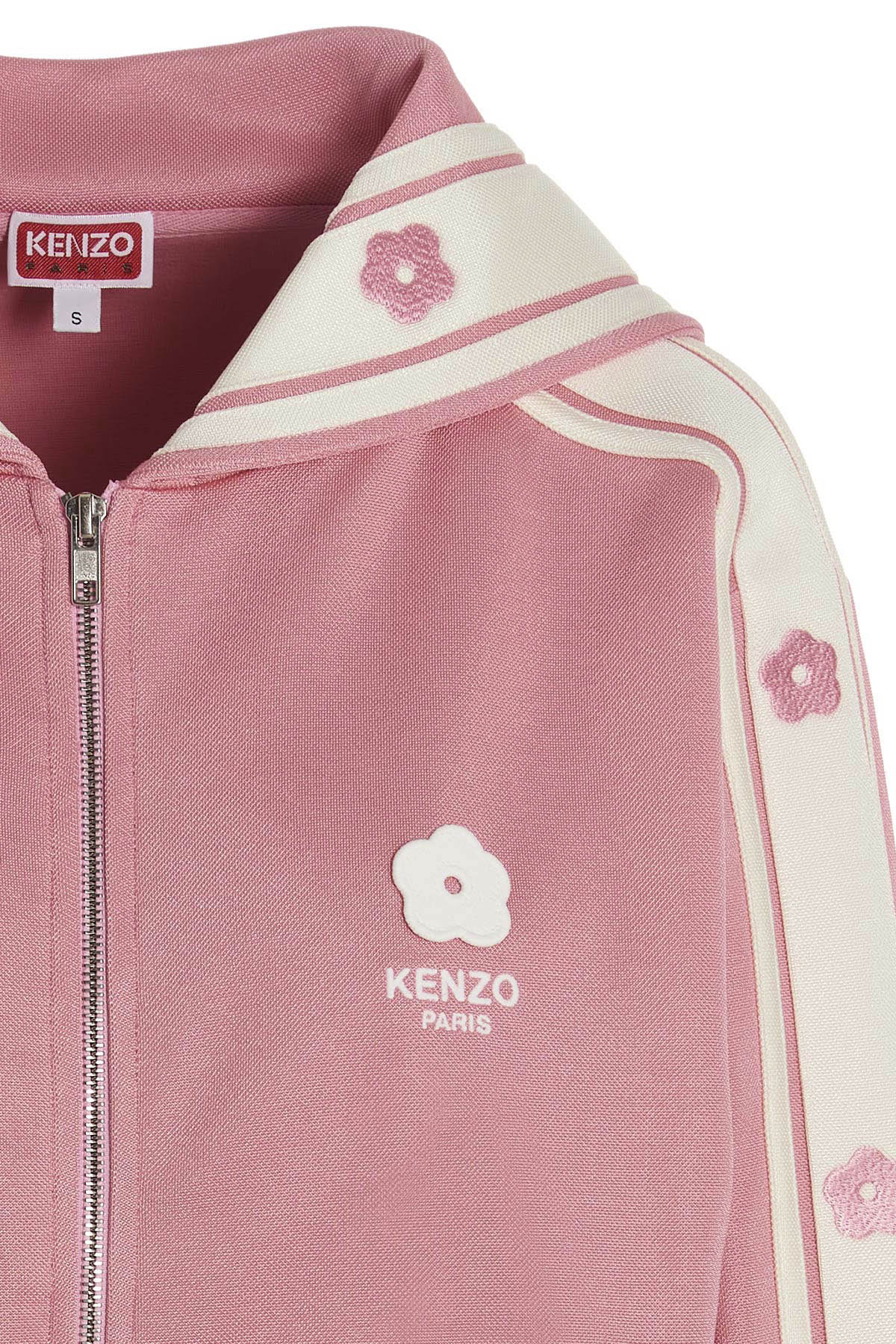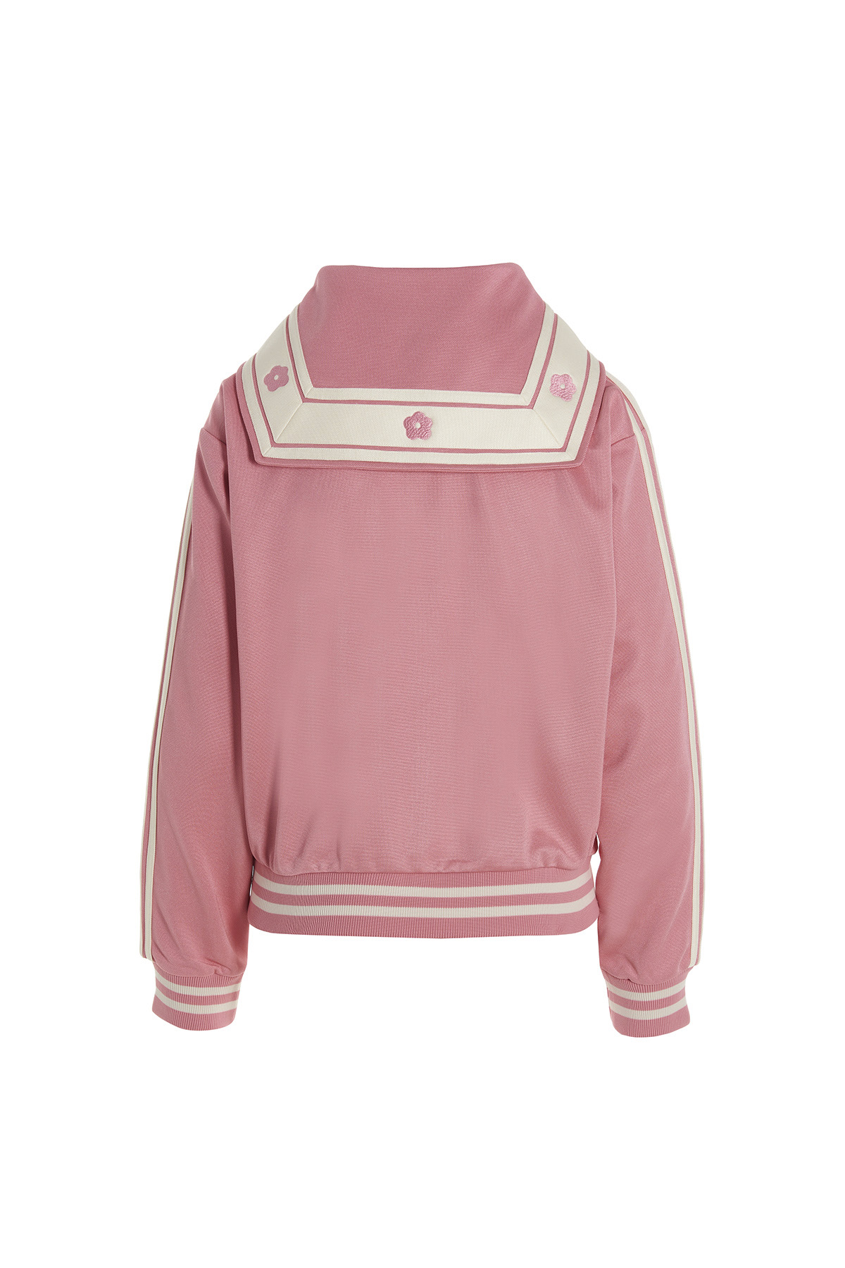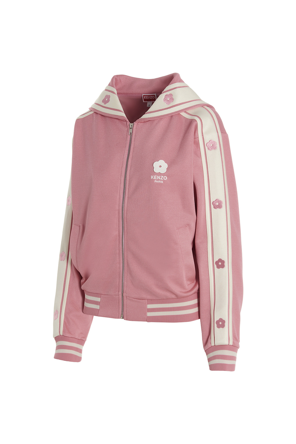 Tech fabric sweatshirt with wide bib on the back, front logo embroidery, maxi back embroidery, zip closure, pockets, long cuffed sleeves, contrast bands on the sleeves with embroideries.