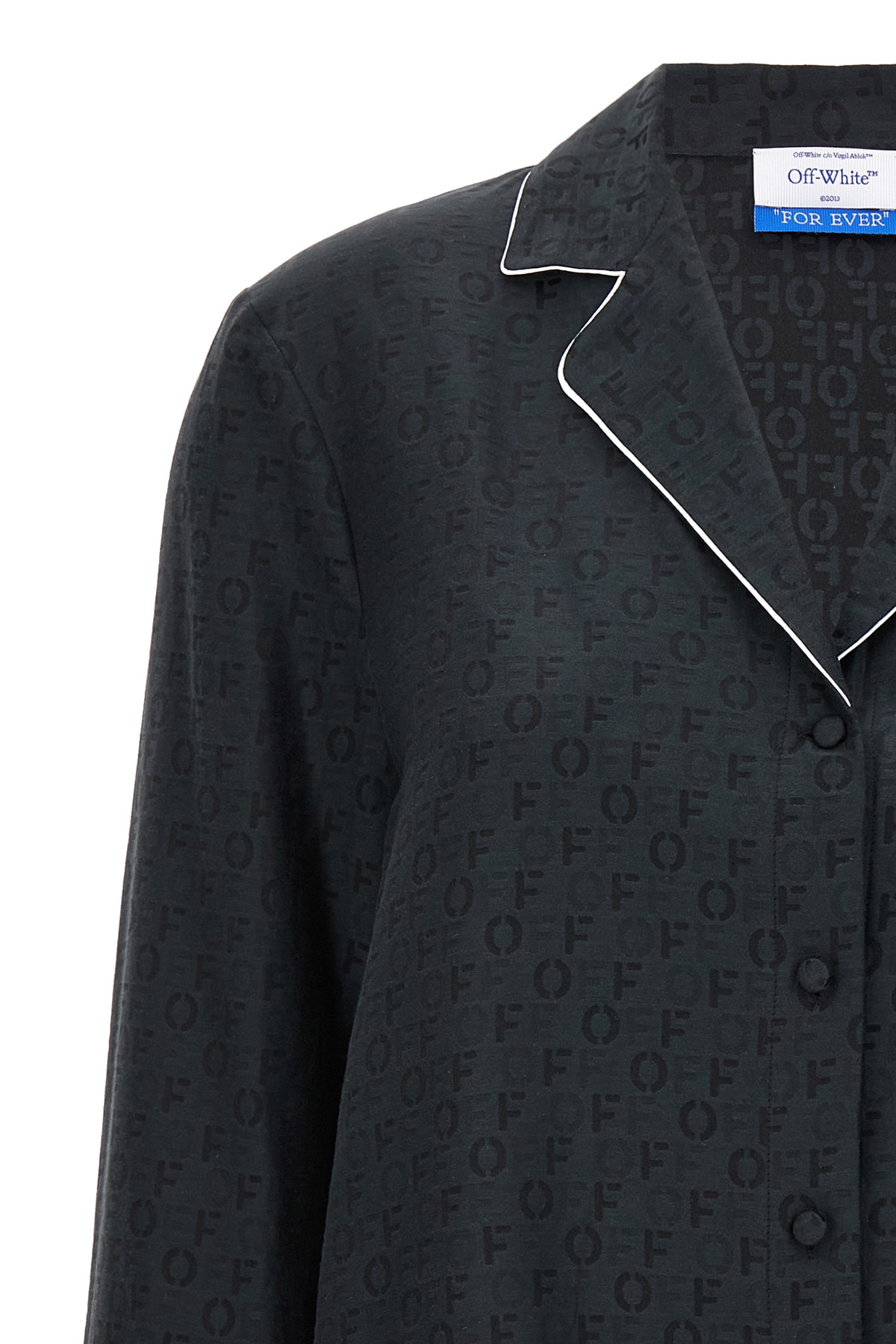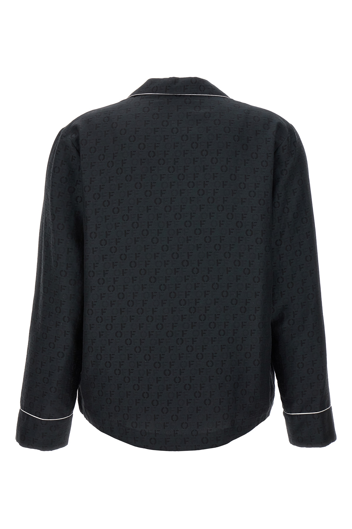 'Off Jaquard Pajama' silk and cotton blend shirt with all-over jacquard logo, front pocket, contrast piping, button closure, long sleeves.