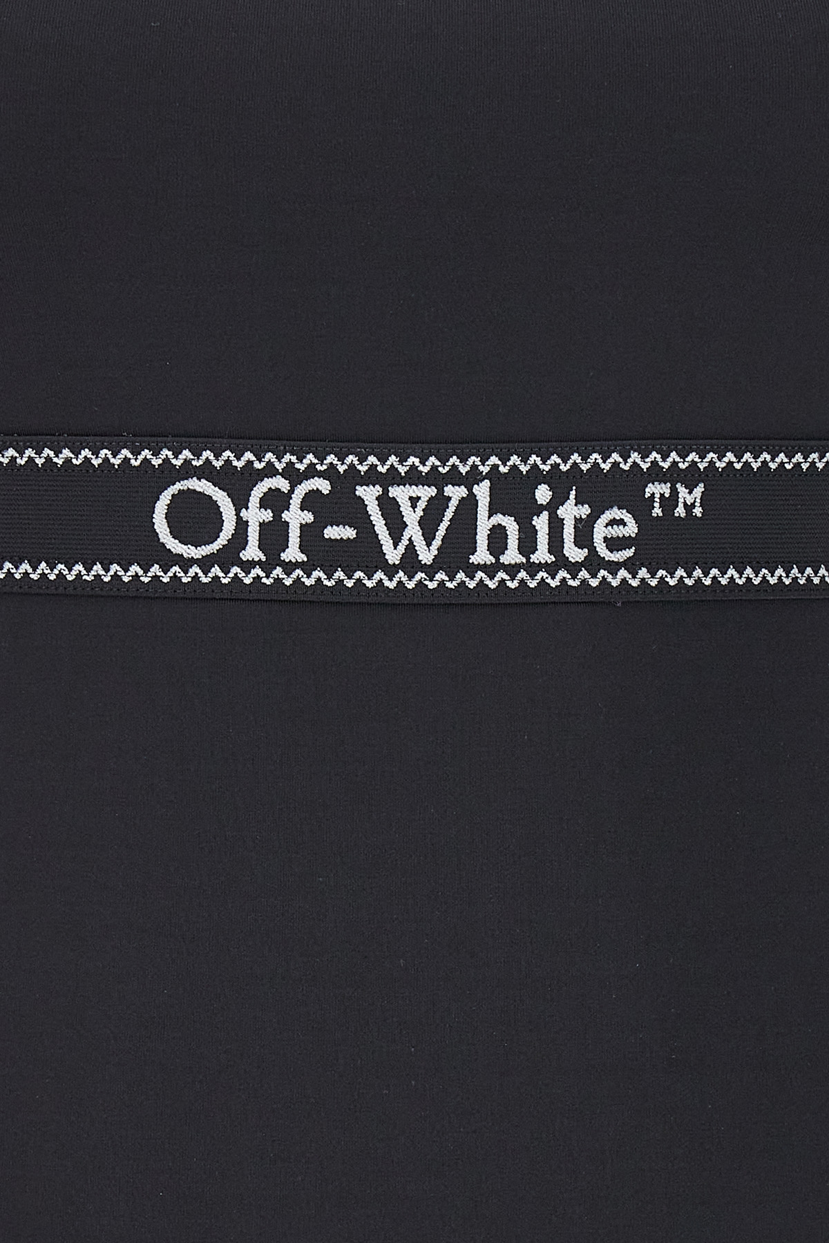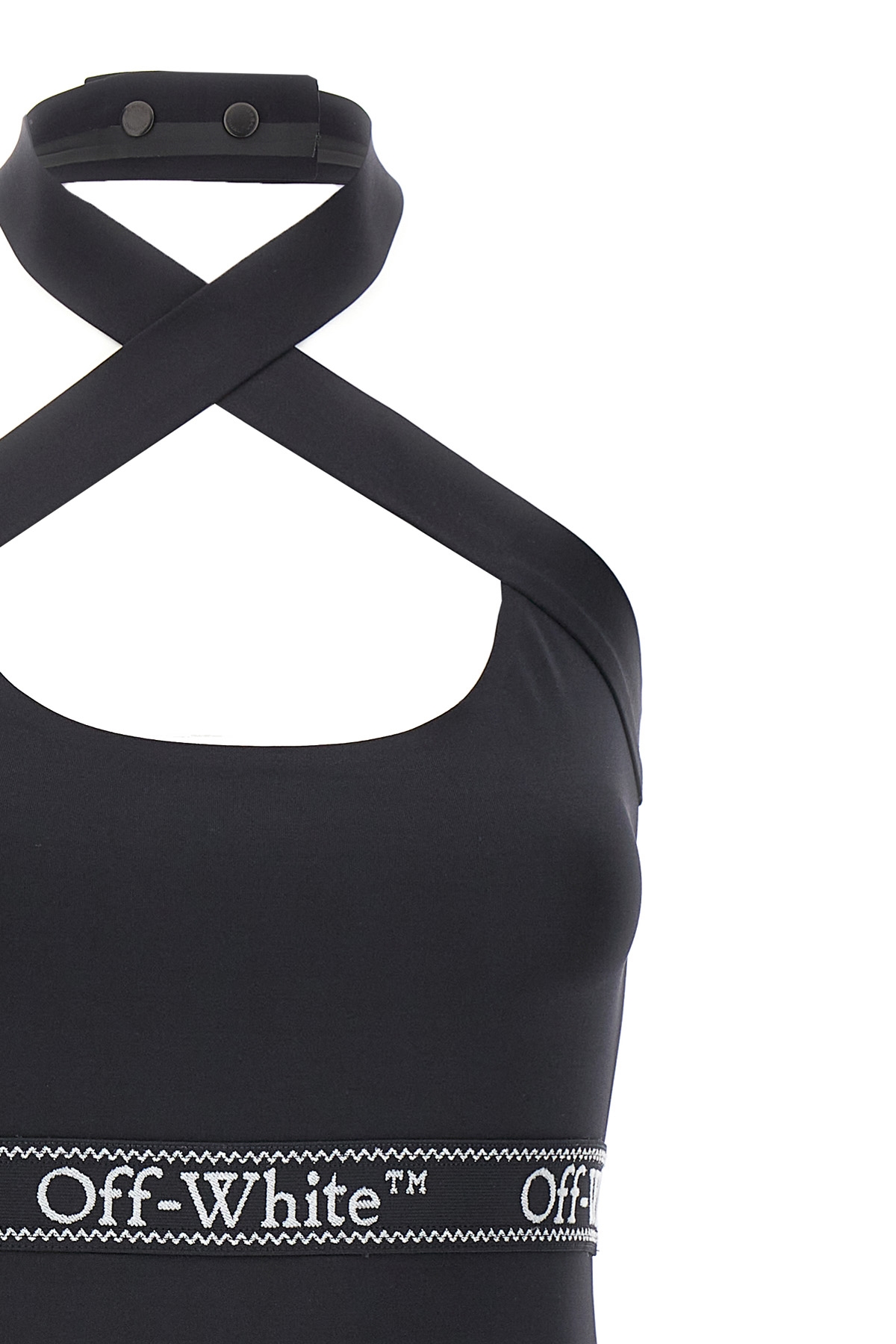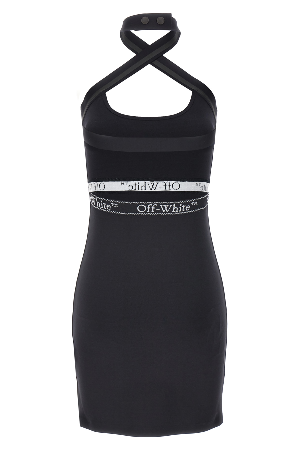 'Logoband Cross' dress in stretch fabric with contrasting logo elastic band, fastening at the neck, bare back with band.