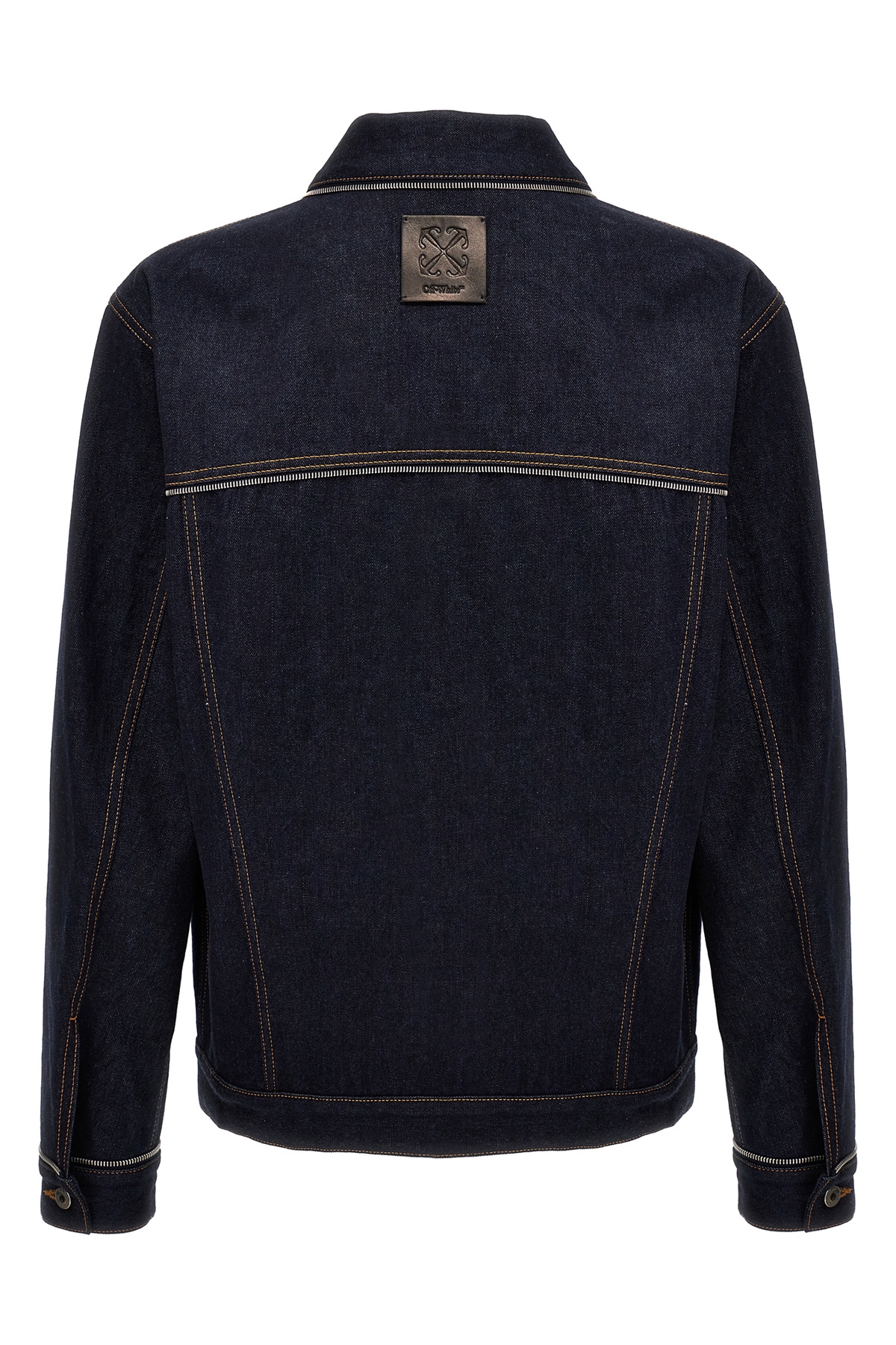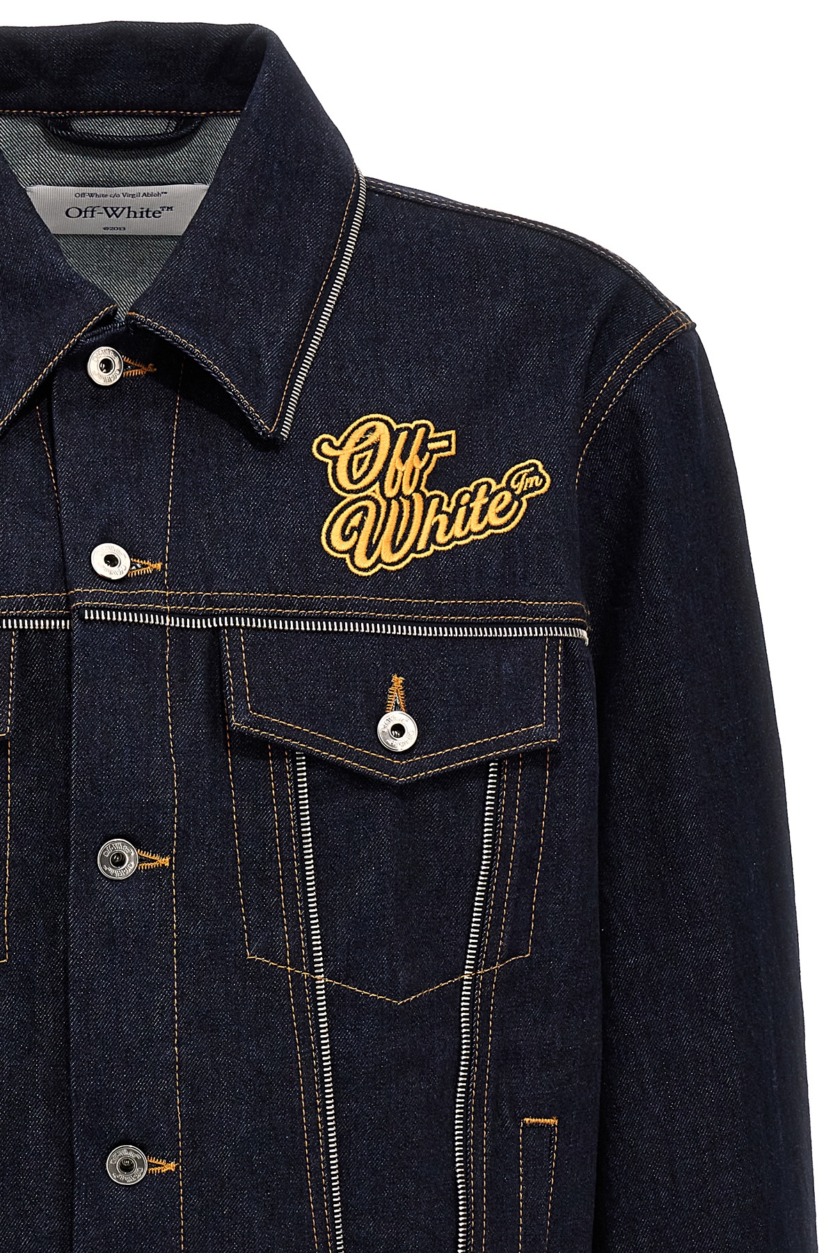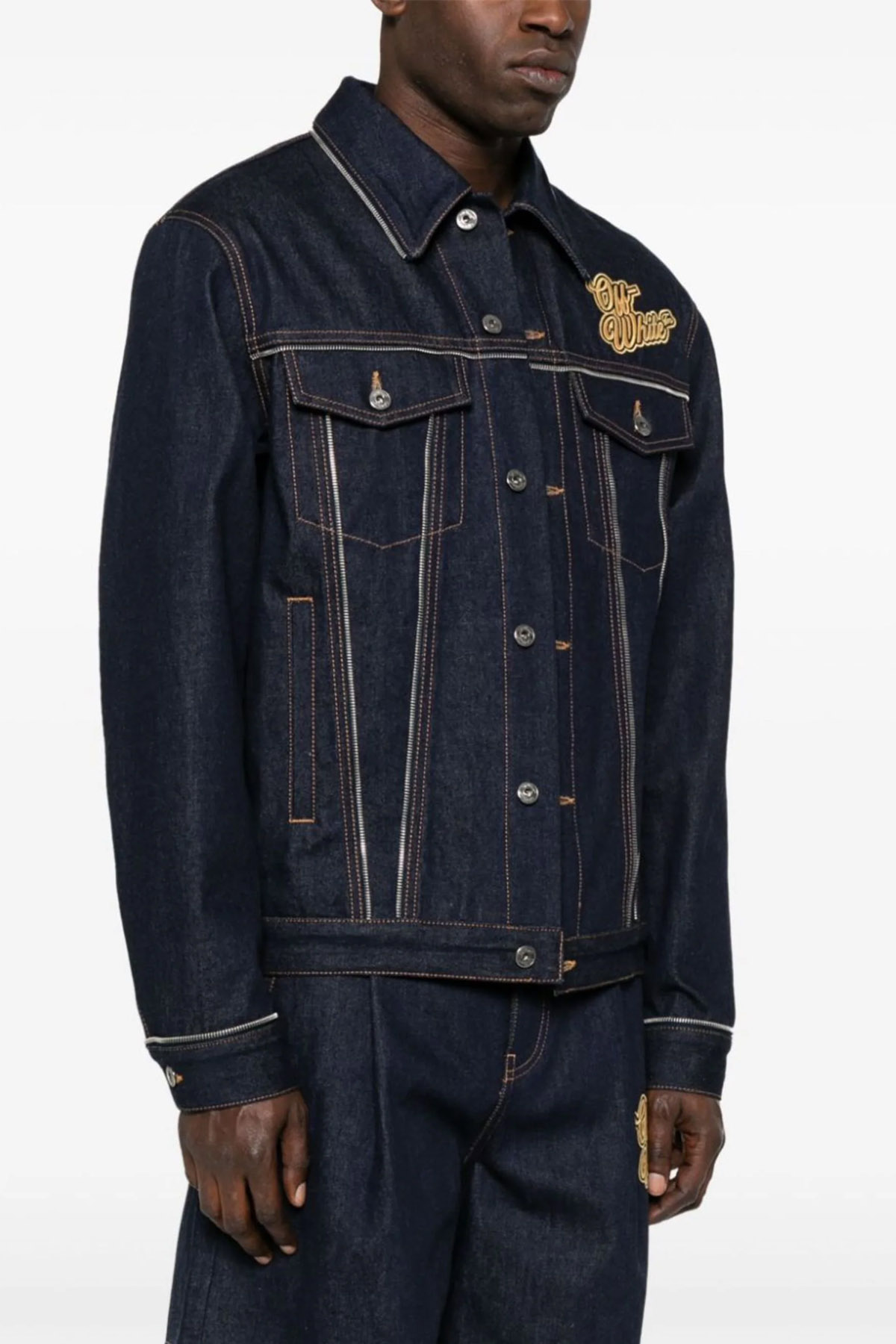 'Skate zip' cotton denim jacket with zip detail on the seams, button closure, front logo embroidery.