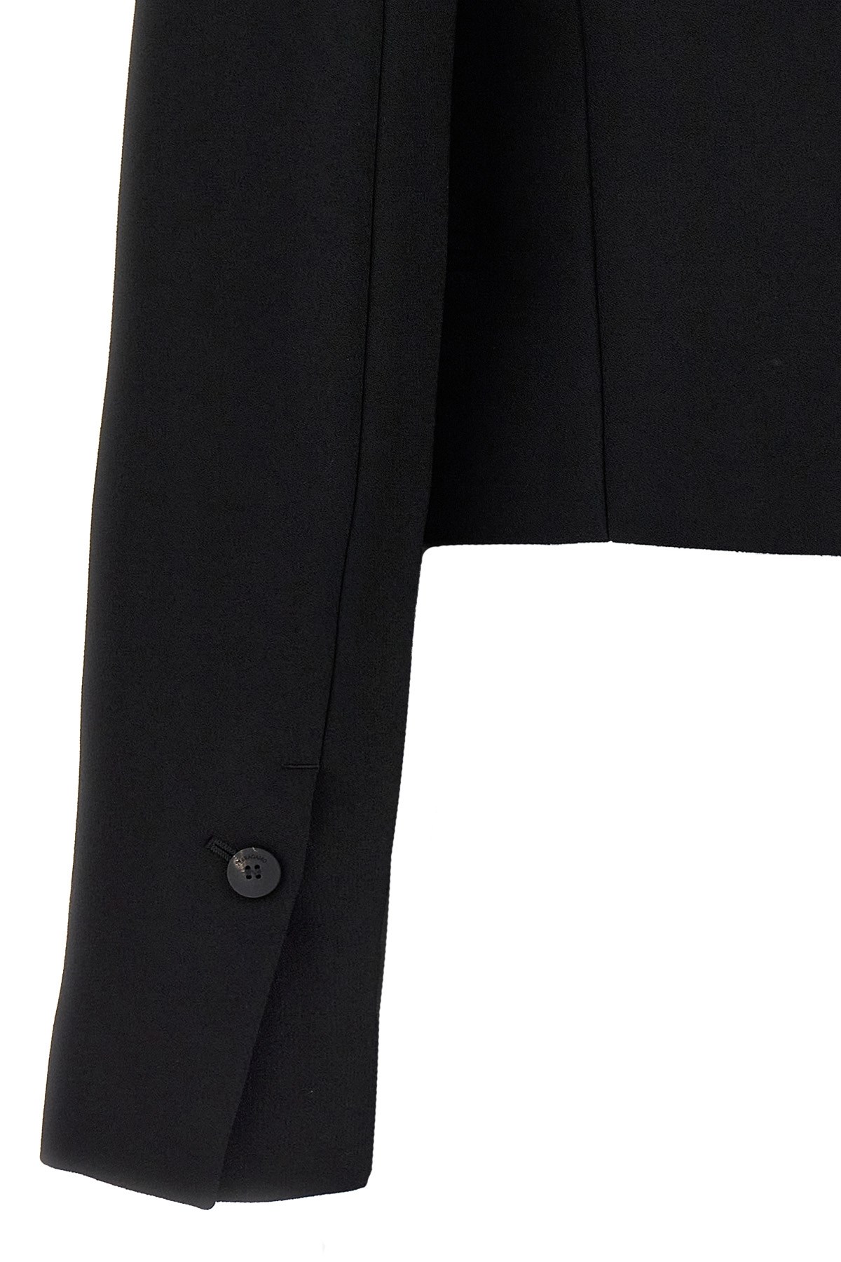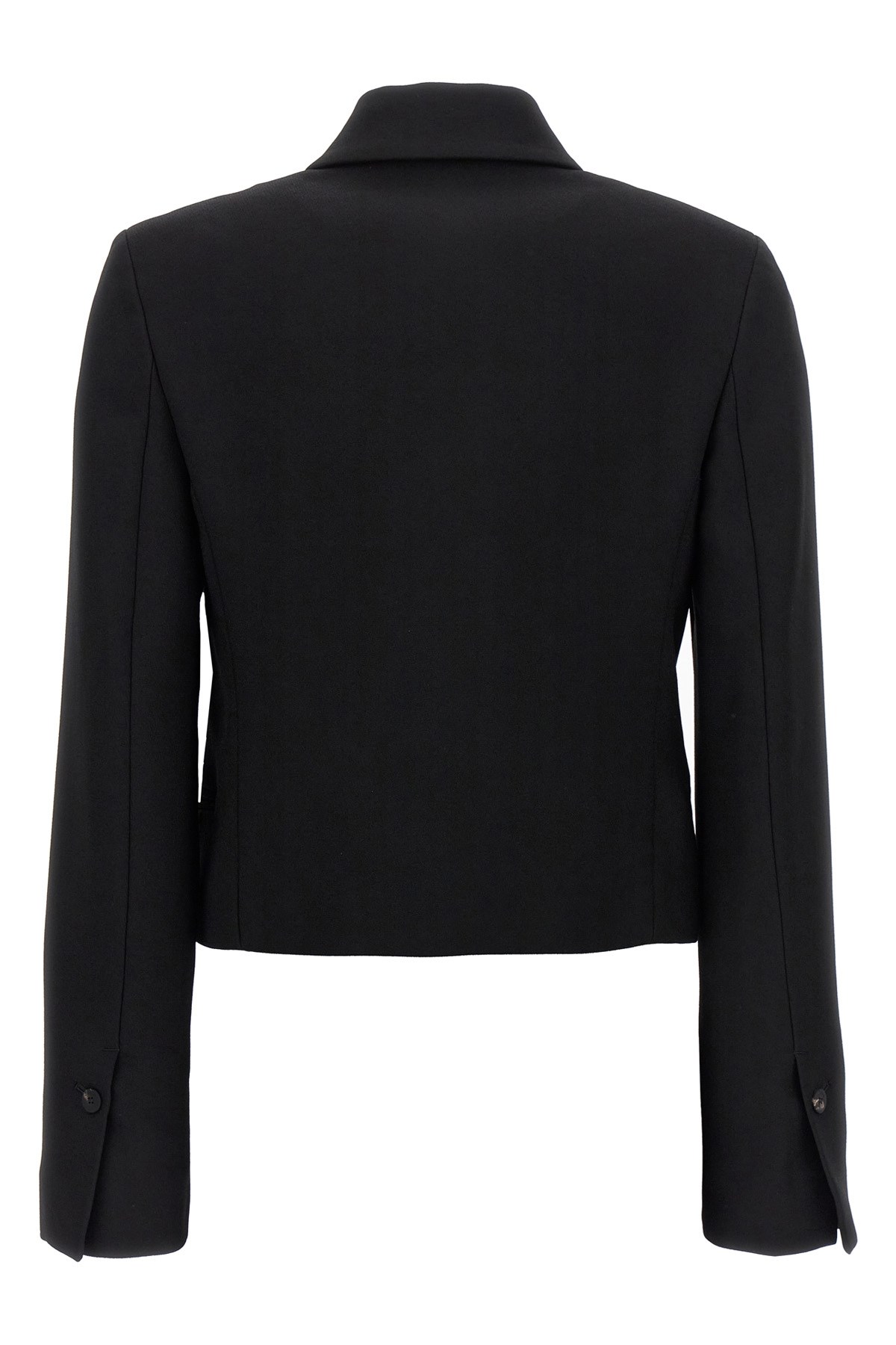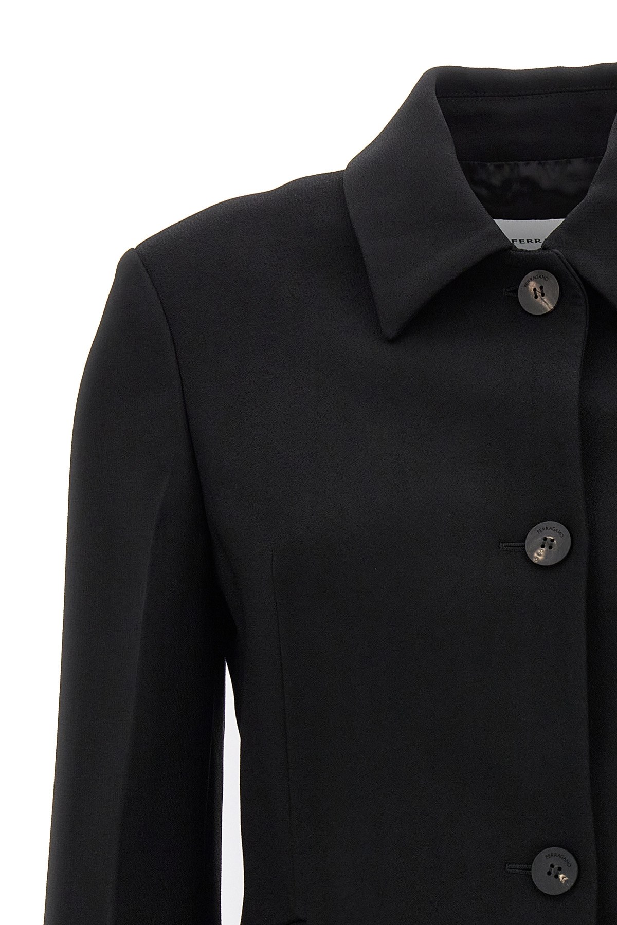 Single breasted viscose blend short jacket with button closure, shirt collar, pockets and long sleeves.