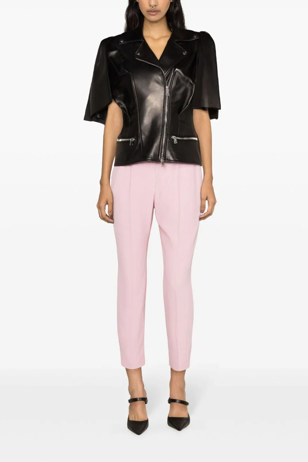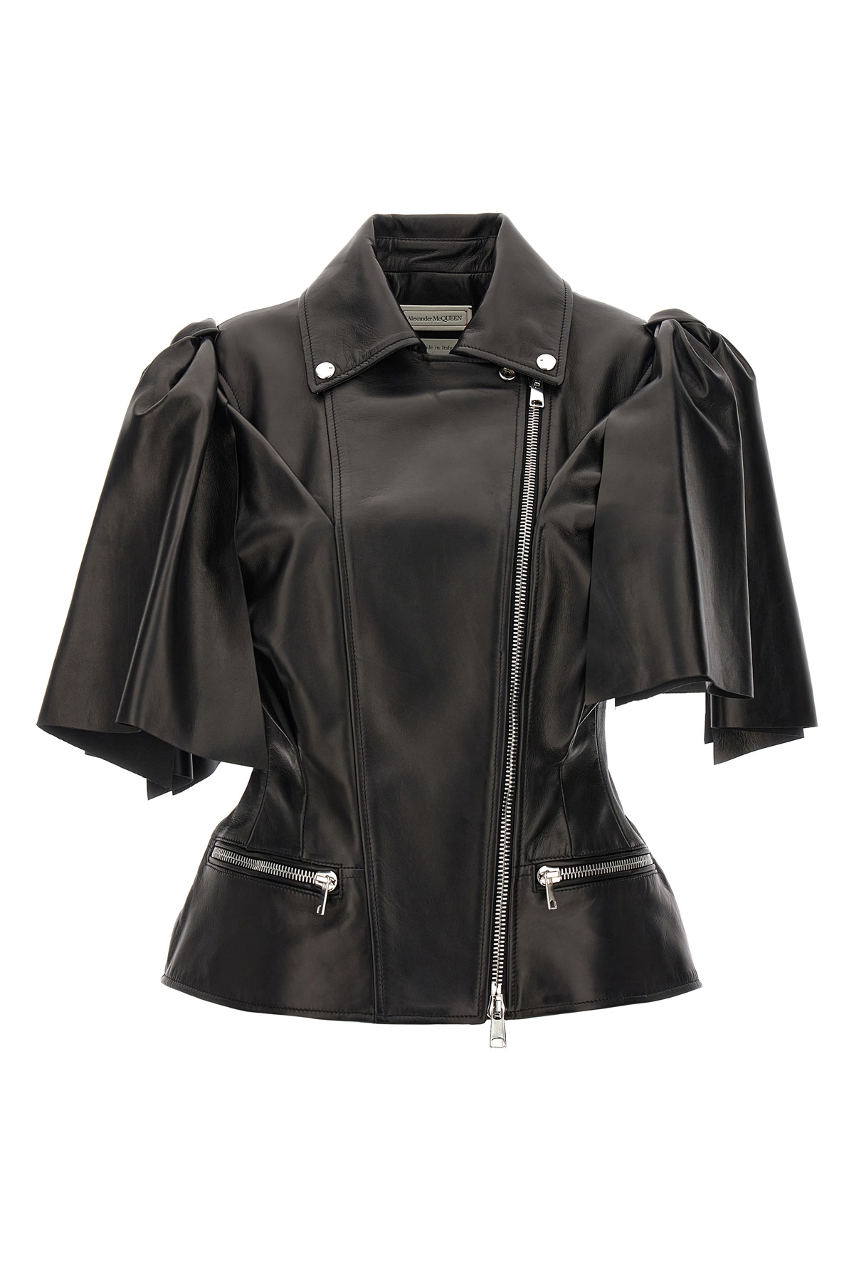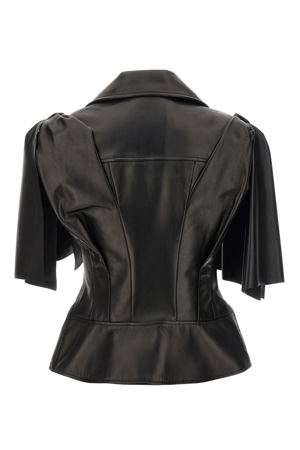 'Bow knot' leather biker vest with bow detail on the shoulders, asymmetric zip closure, and pockets.