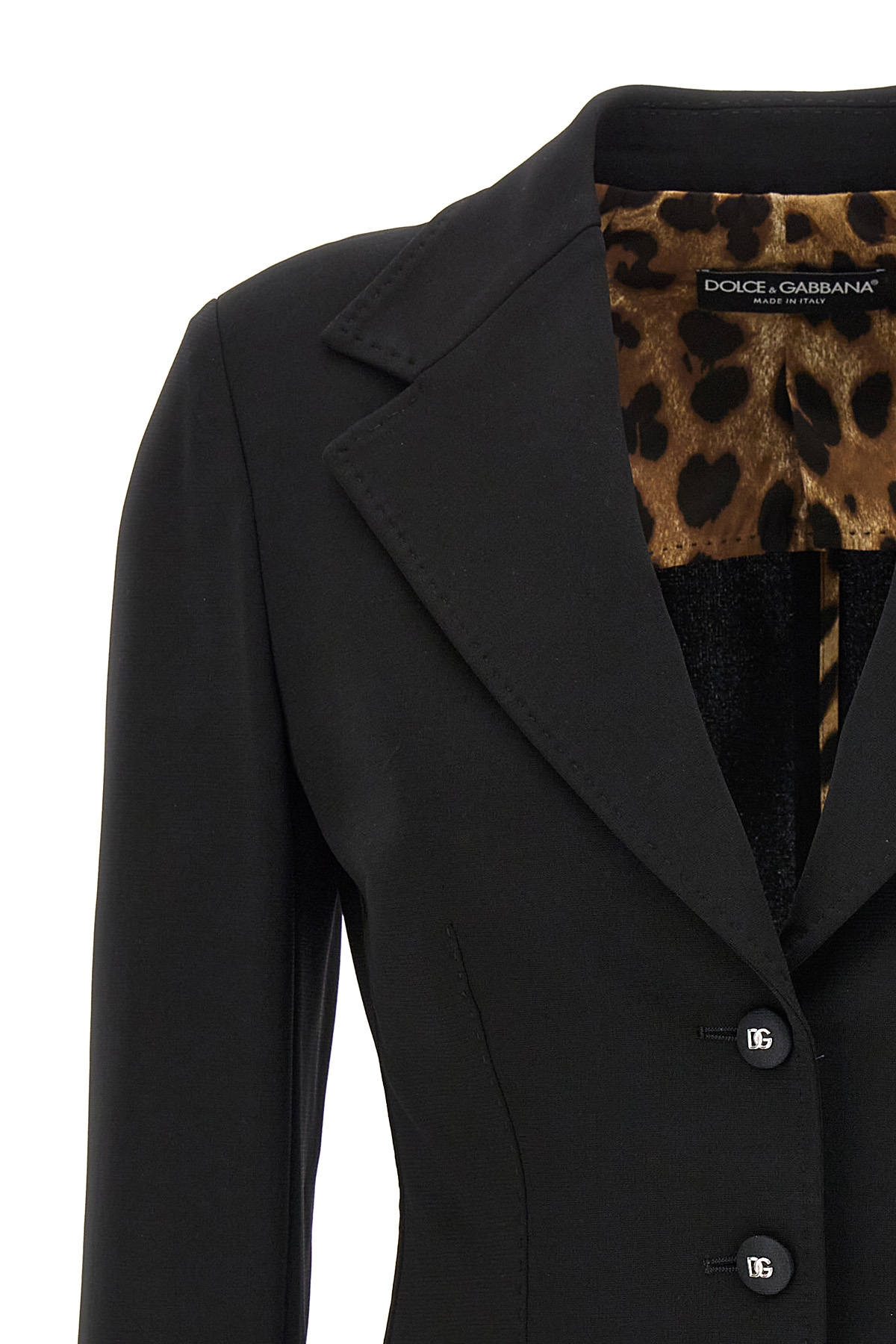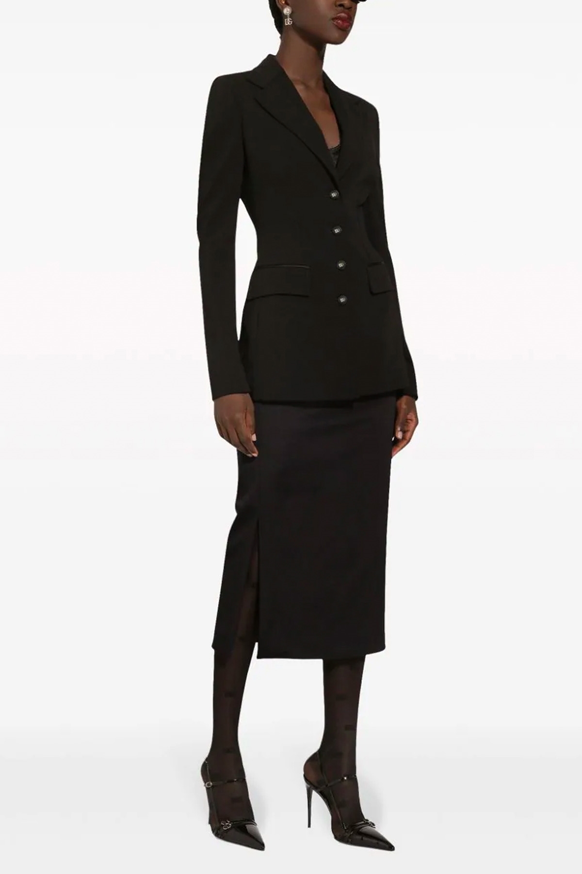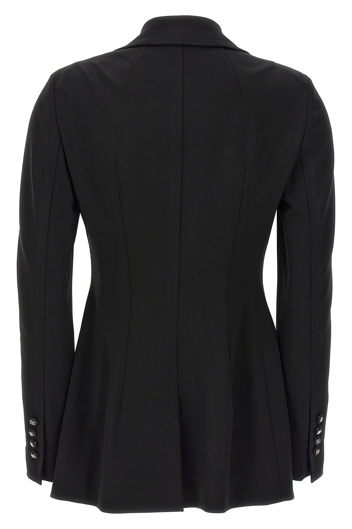 Single-breasted Turlington blazer in viscose stretch silk blend with logo button closure, flap pockets, peak lapels, and single split on the back.