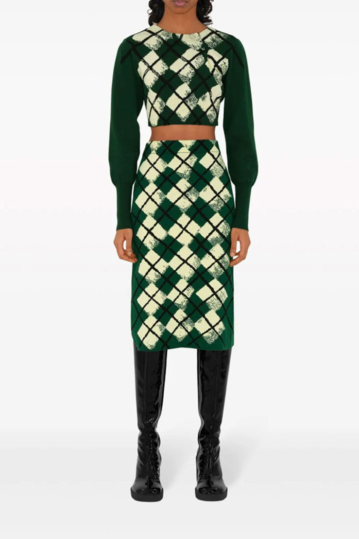 Sweater with argyle pattern in cotton, crop model with safety pin detail.