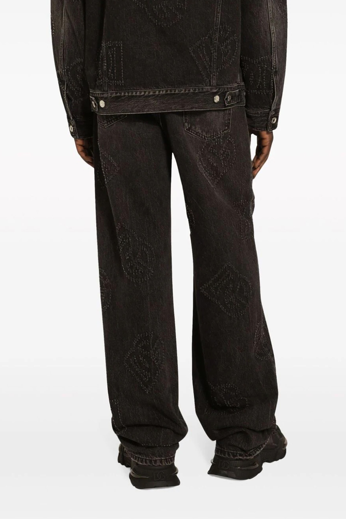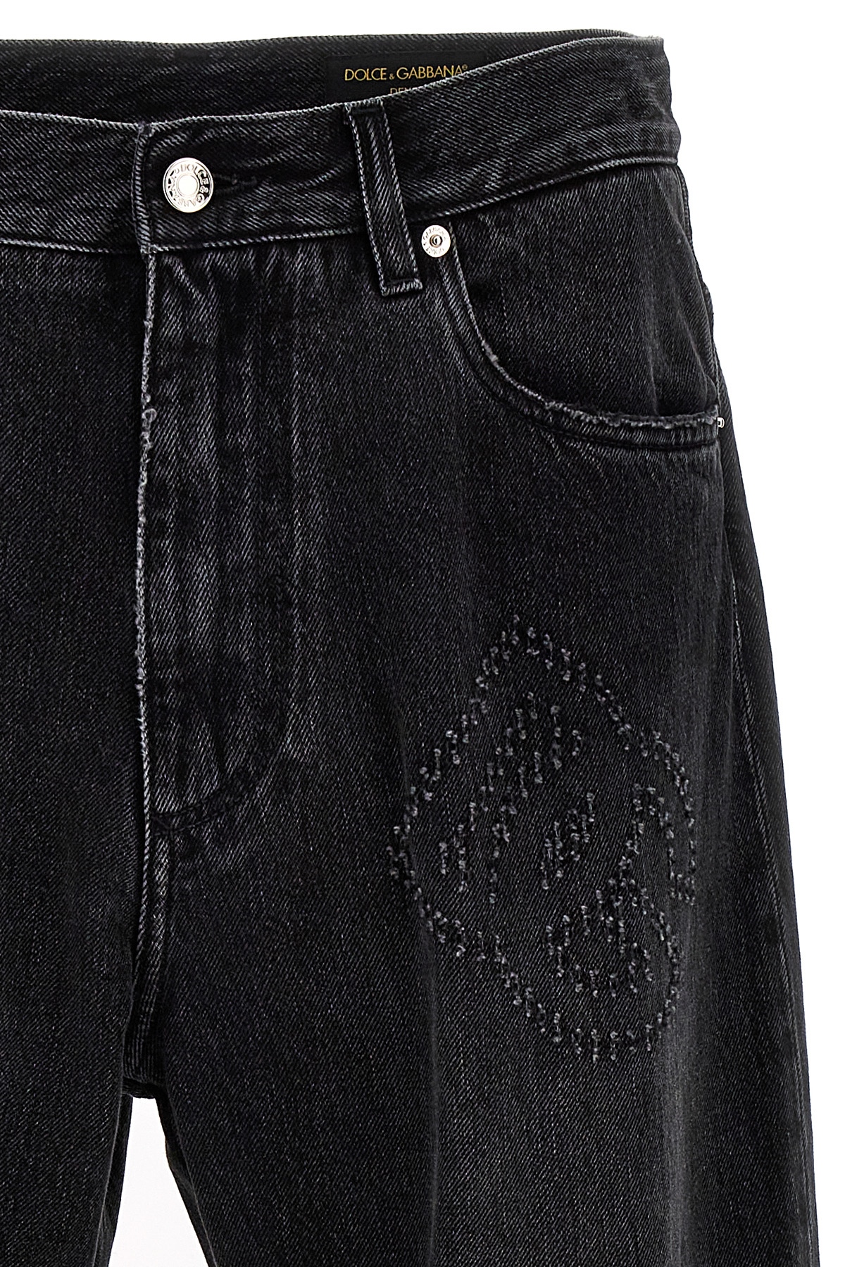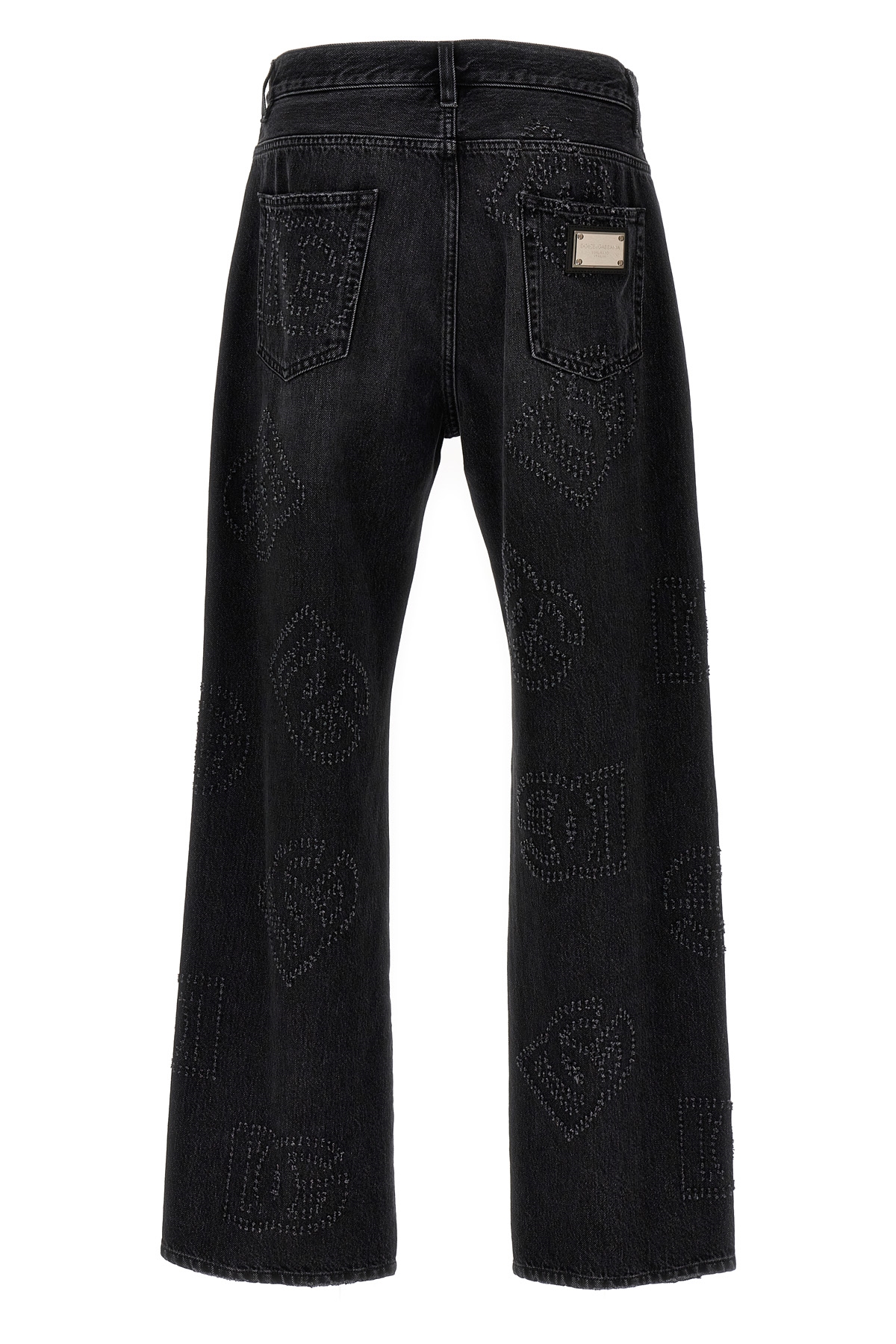 'DG' cotton denim jeans with maxi tear-effect logo, button and zip closure.