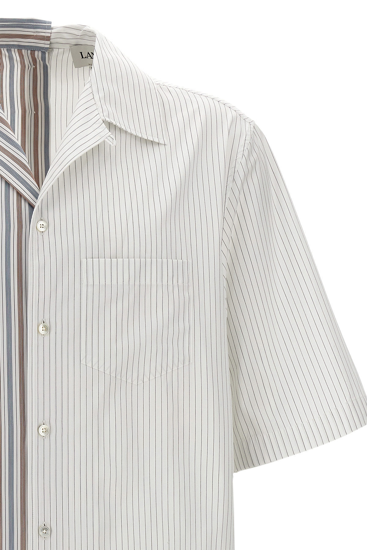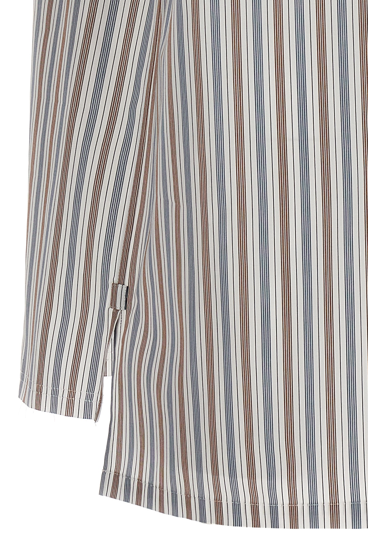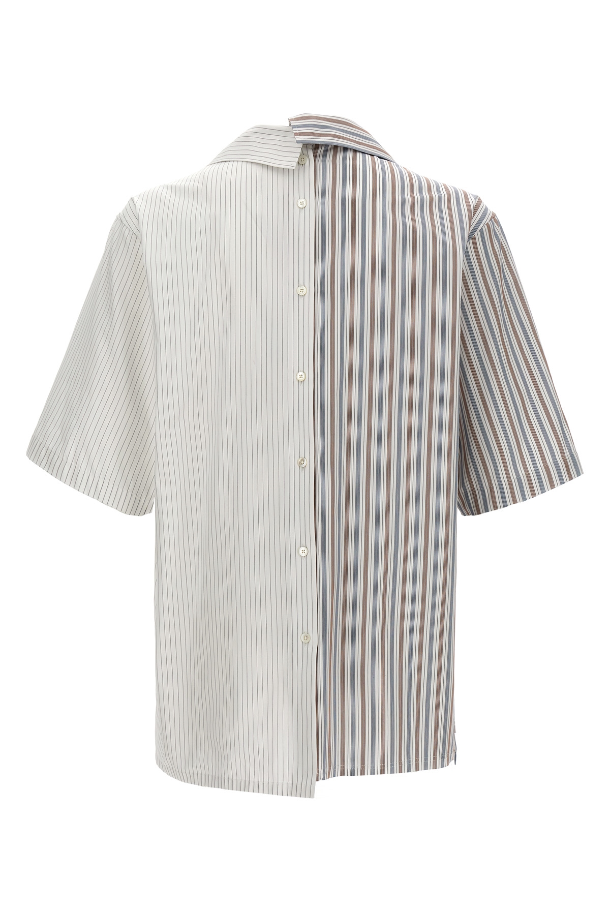 Asymmetric striped cotton shirt, front and back button closure, front pocket, and short sleeves.