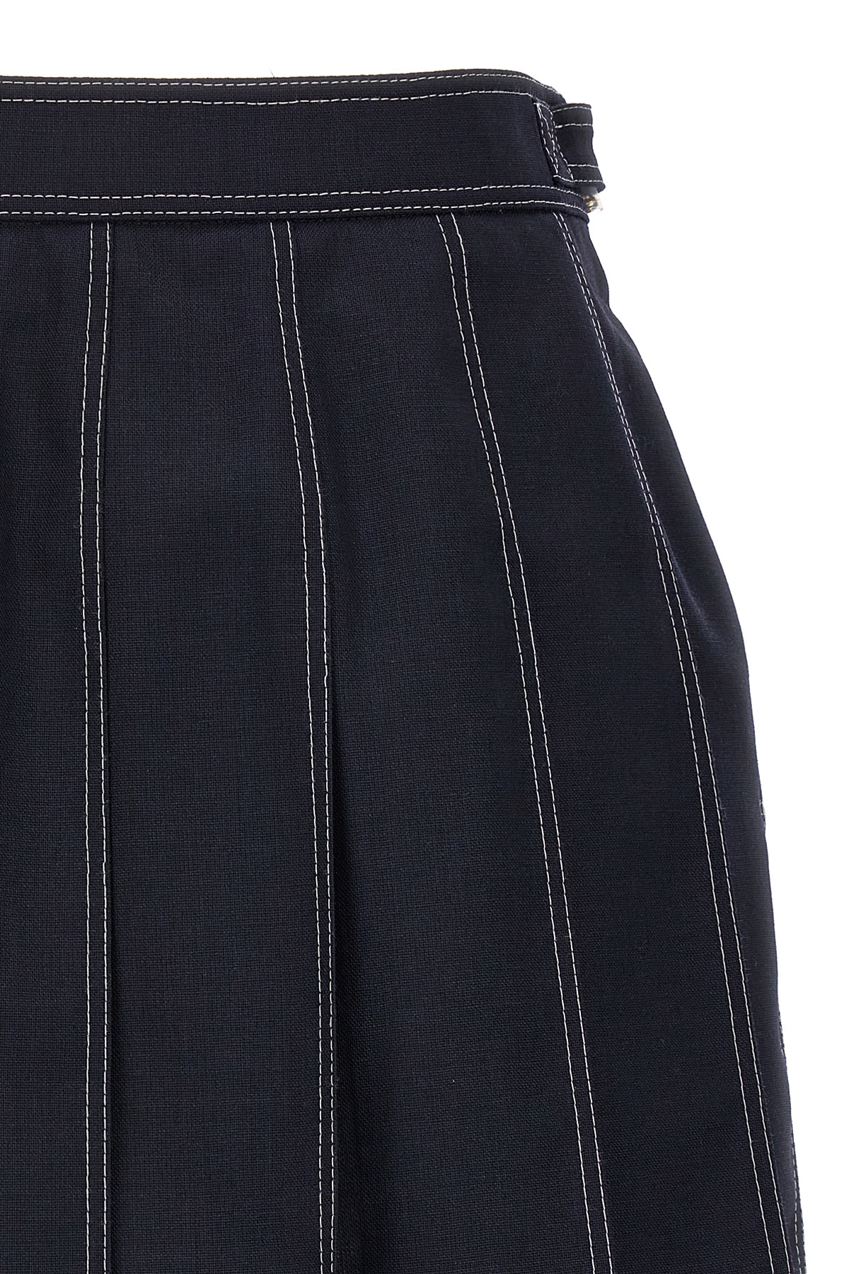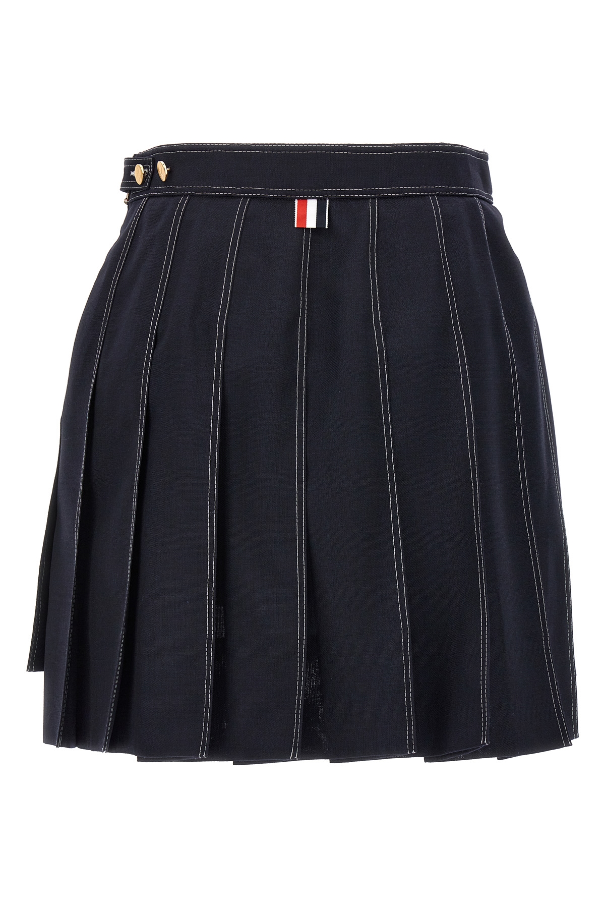 Mini pleated skirt with contrast stitching and asymmetrical hem.