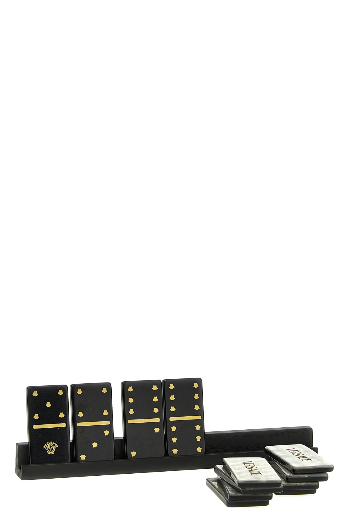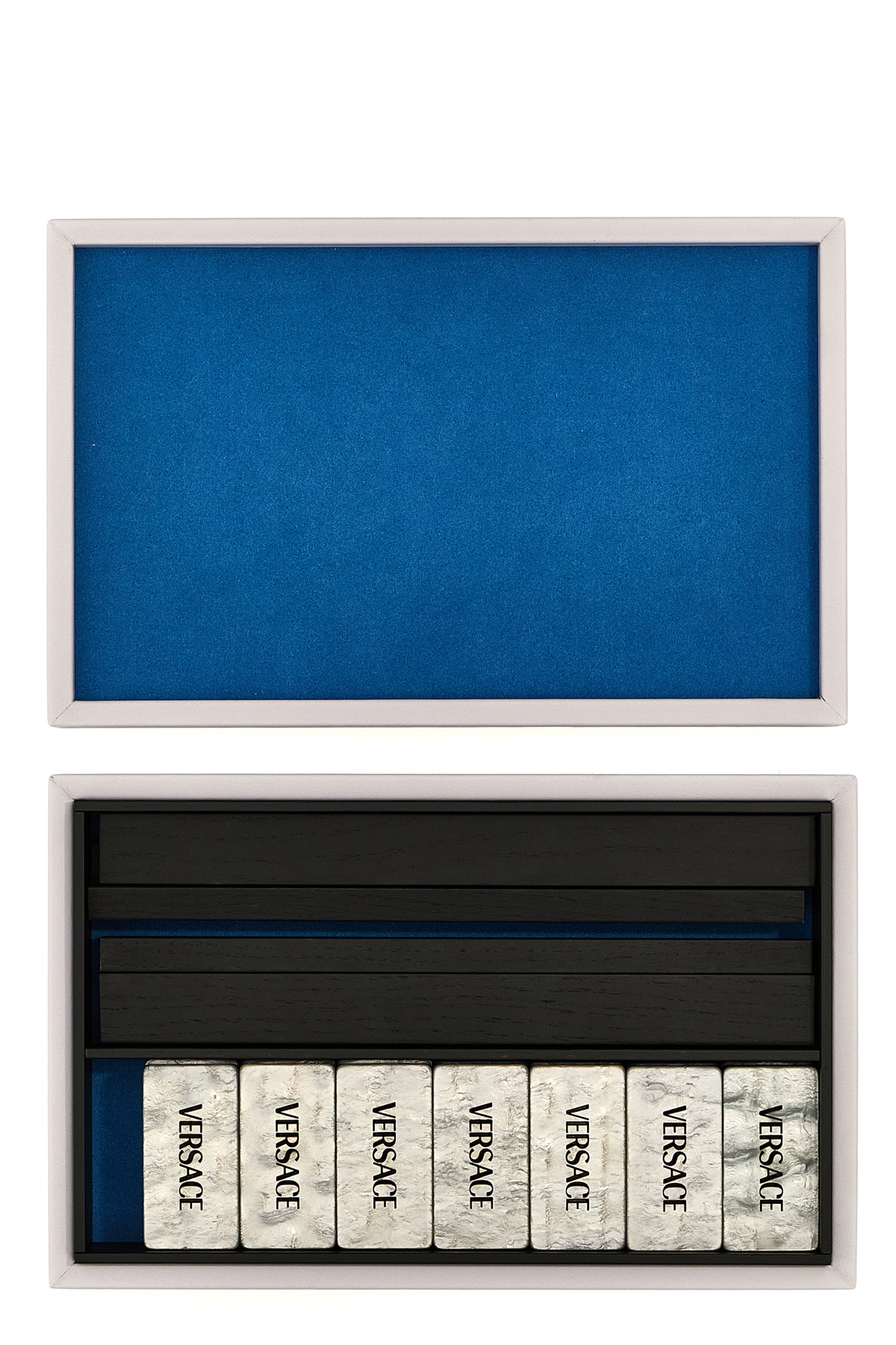 Domino board with Barocco print characterized by leather exterior and suede and wood interior. The pieces are embellished with a logo engraved on an iridescent background on one side and Medusa-shaped dots on the other.