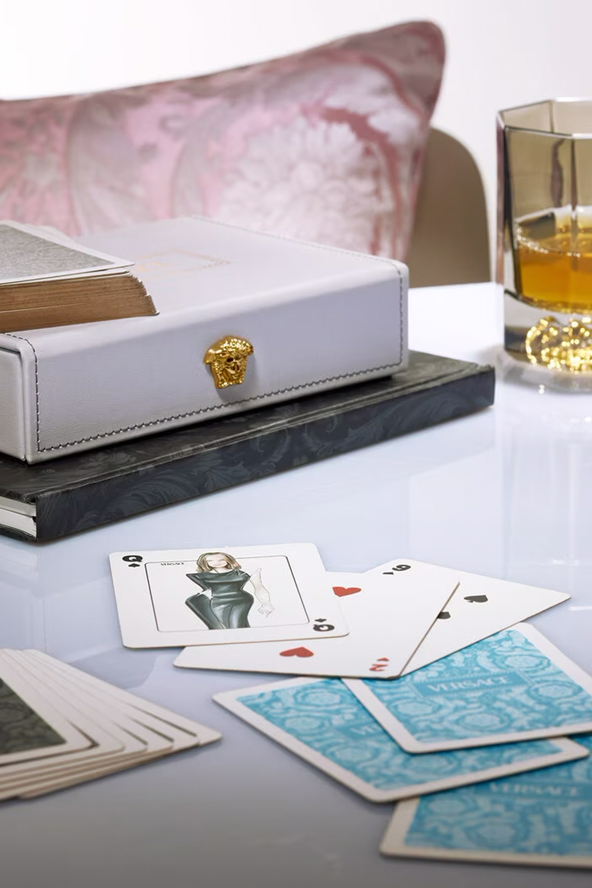 The playing card set contains two decks of 54 cards in paper boxes with Barocco print and a leather case with suede interior and a Medusa stud detail on the folding magnetic closure. The figures on the cards wear iconic Versace models.