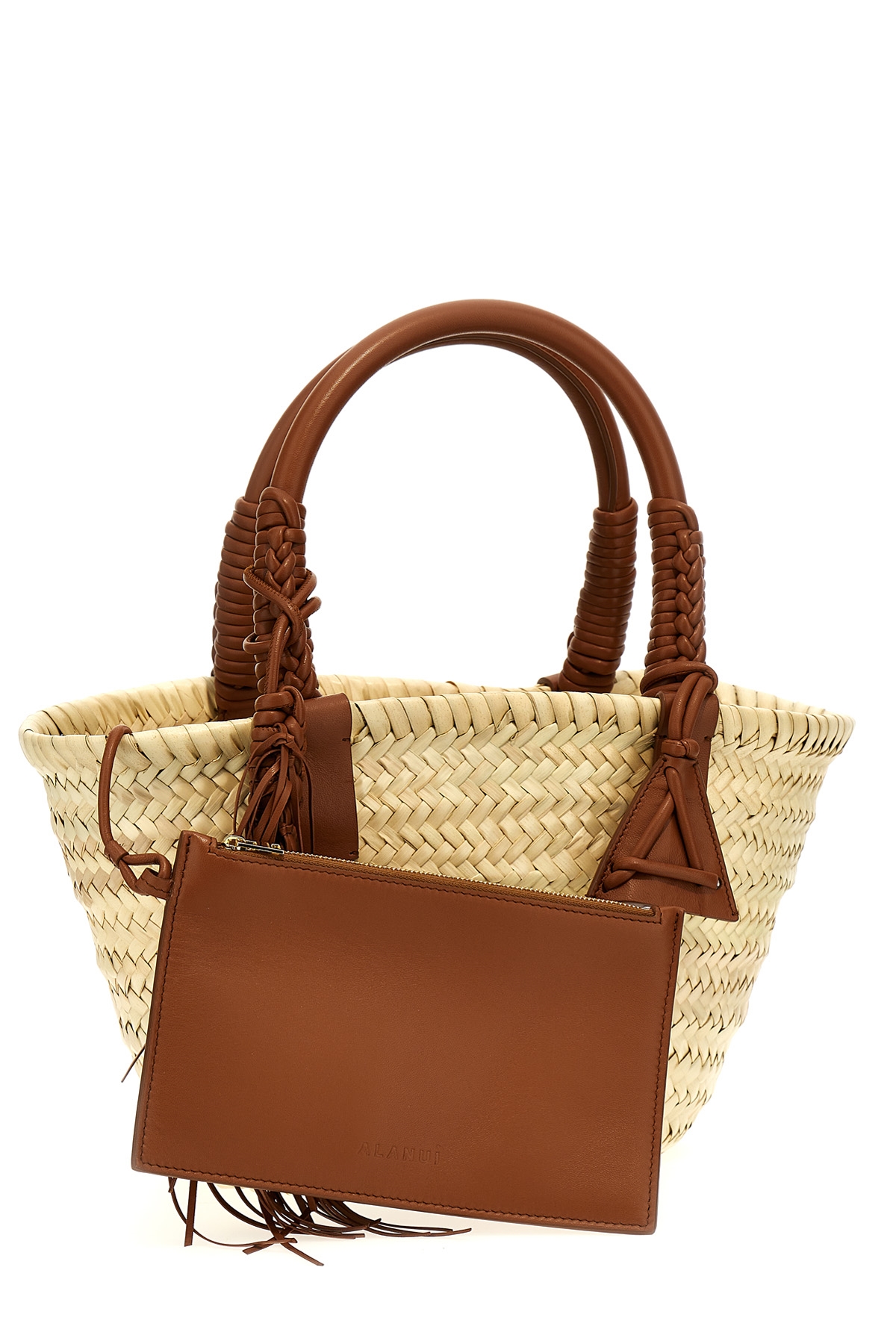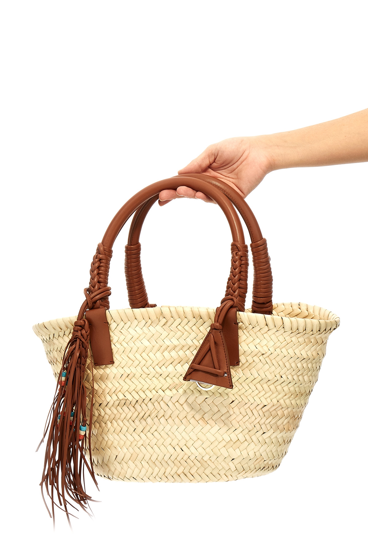 'Icon Palm Leaf Small' woven straw handbag, double leather handle, fringed detail with beads, removable inner leather clutch.