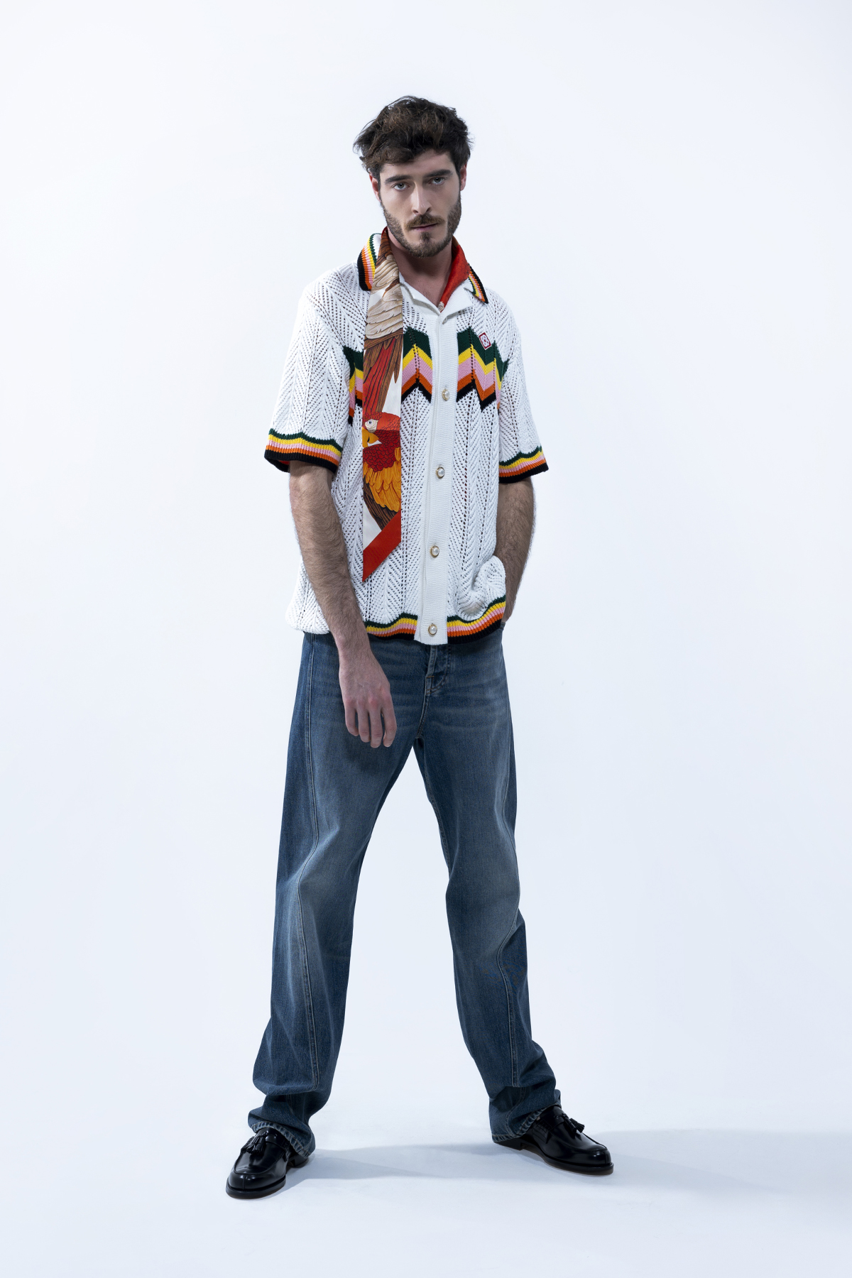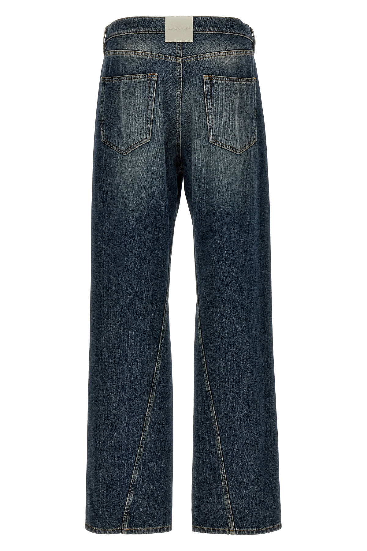 'Twisted Leg' cotton denim jeans with button closure, five pockets, leather logo tag.