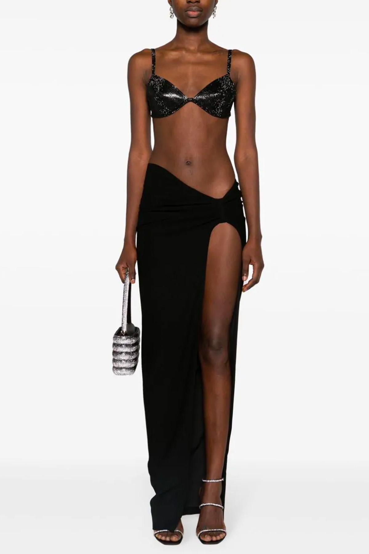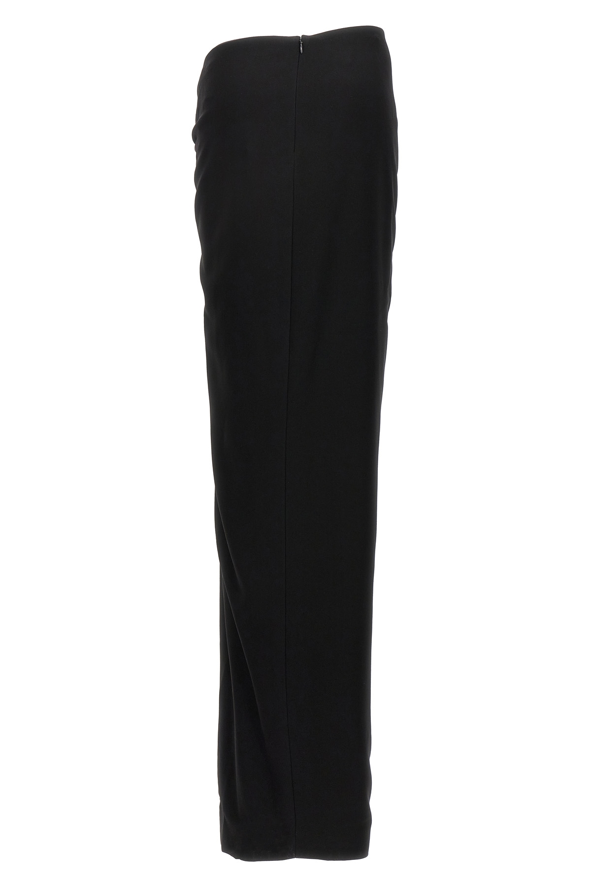 'Torpedo' long skirt with maxi front split, asymmetric waist, draping detail.