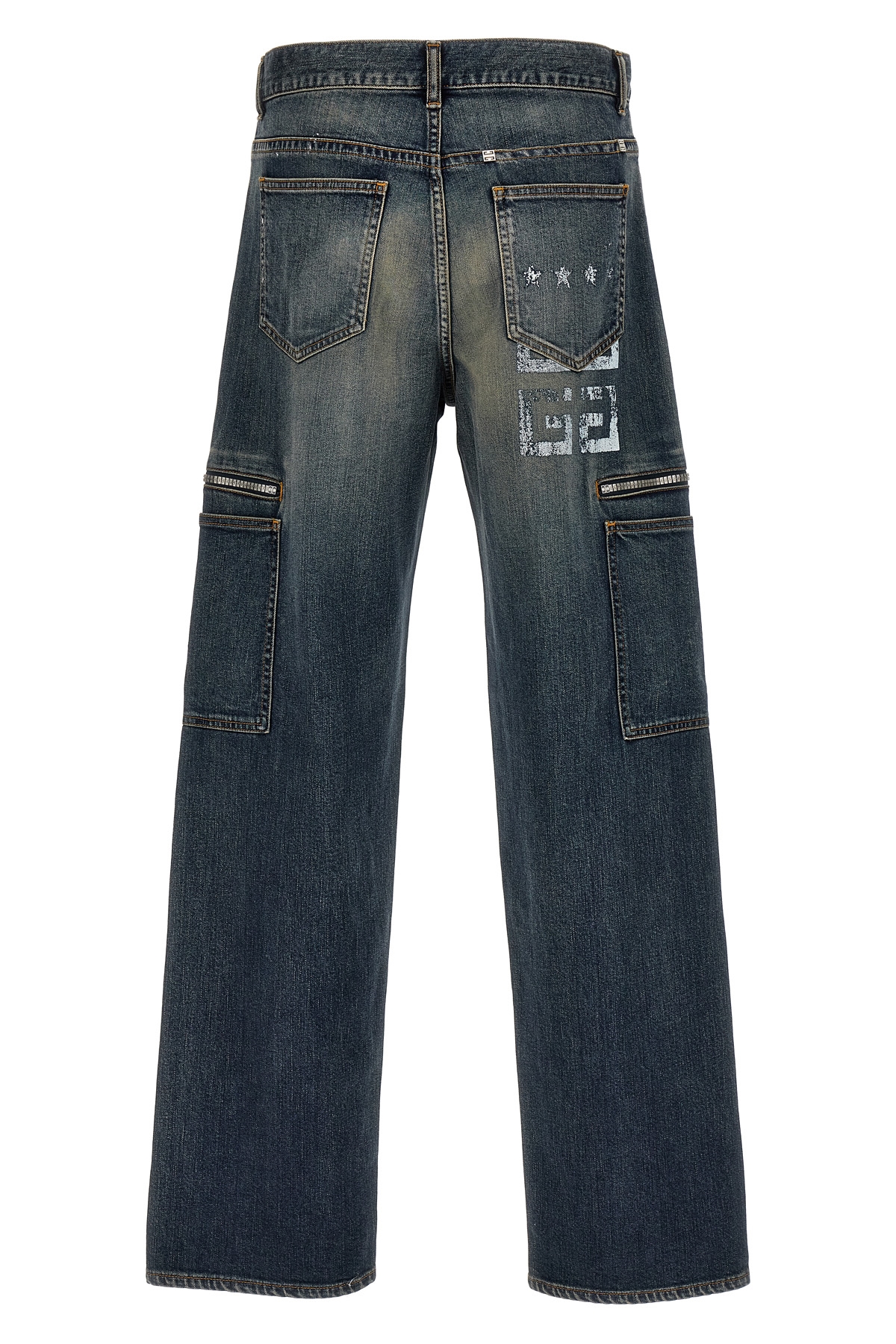Cargo denim jeans with zipped pockets and pockets, 4G print on the back, paint splashes.