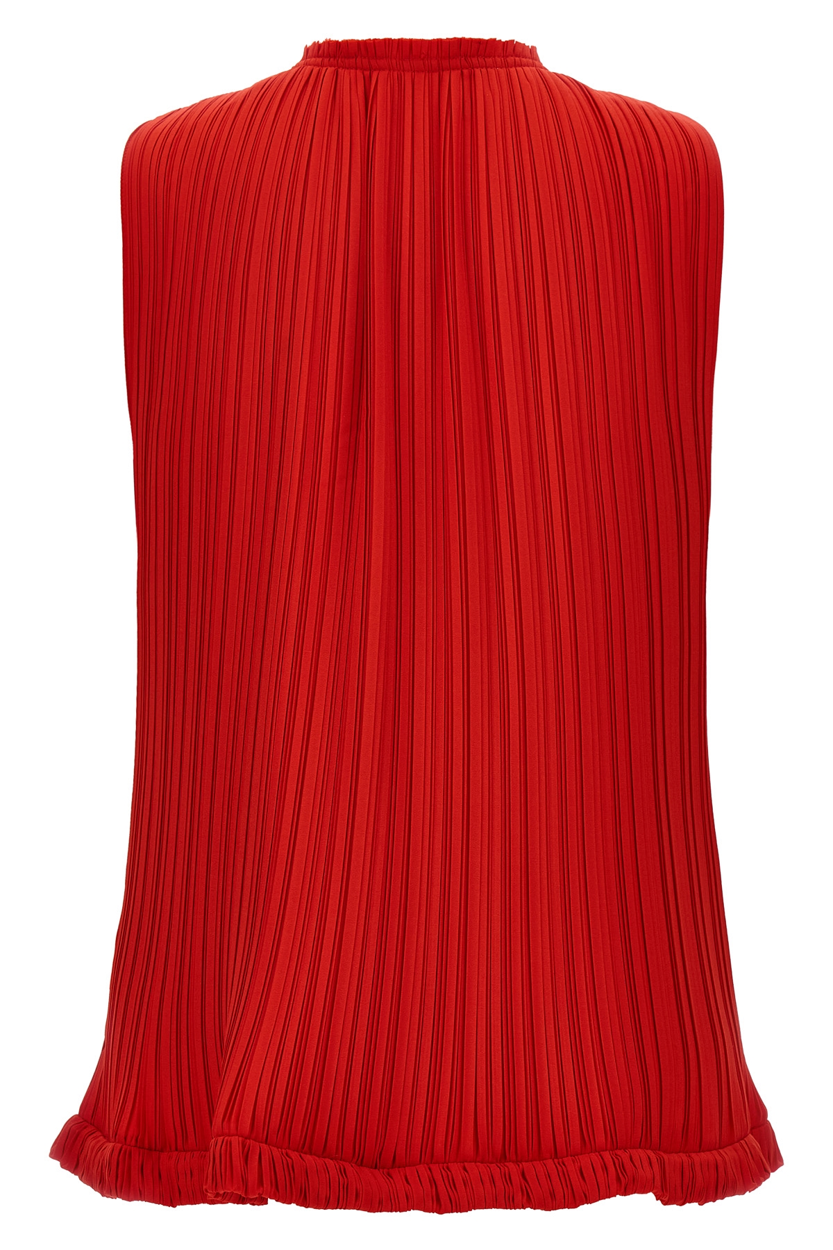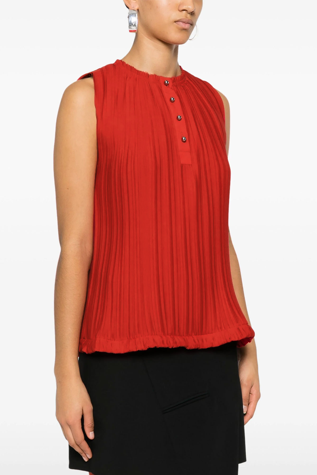 Pleated fabric top, round neckline with buttons, sleeveless.