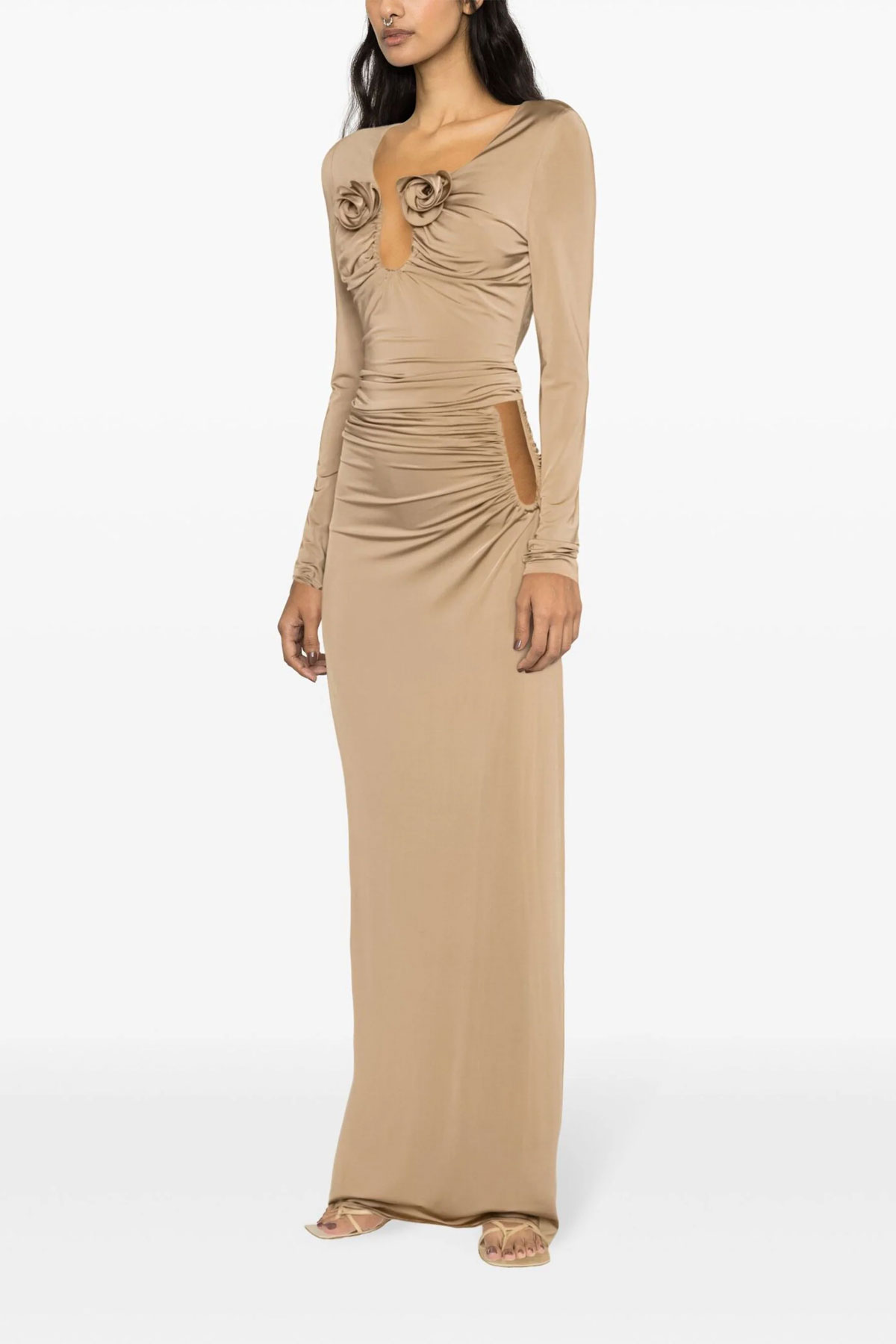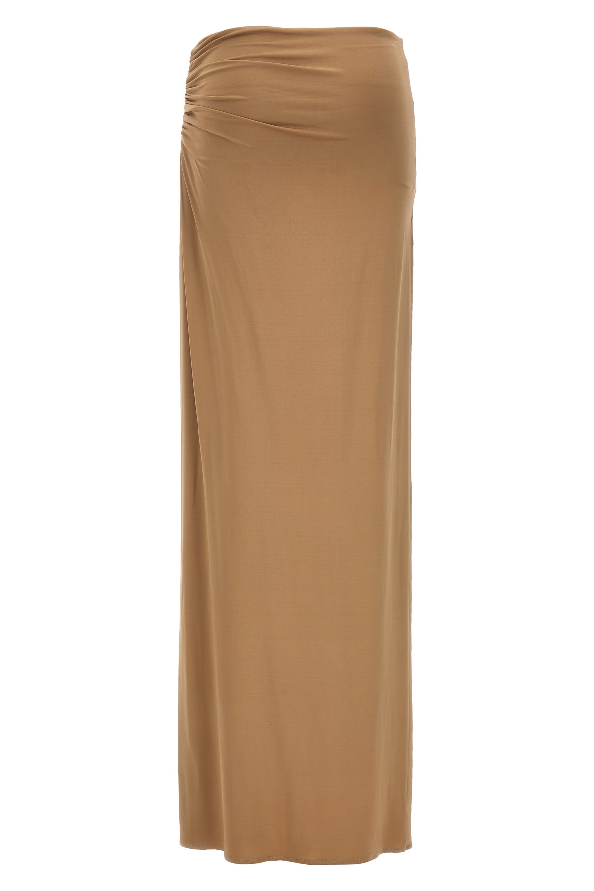 Long '01' skirt in stretch viscose with side draping detail with metallic shape that creates a cut out.