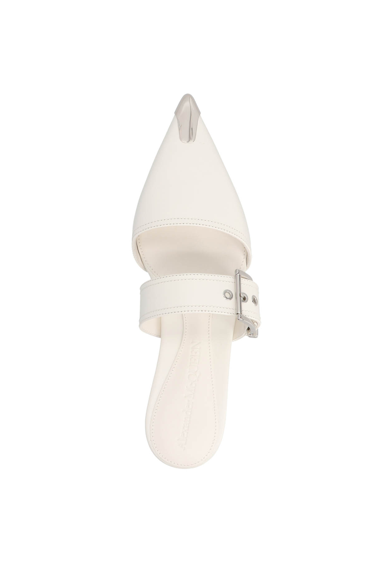Punk' leather mules with strap detail with buckle, pointed toe and a silver metal toe cap.