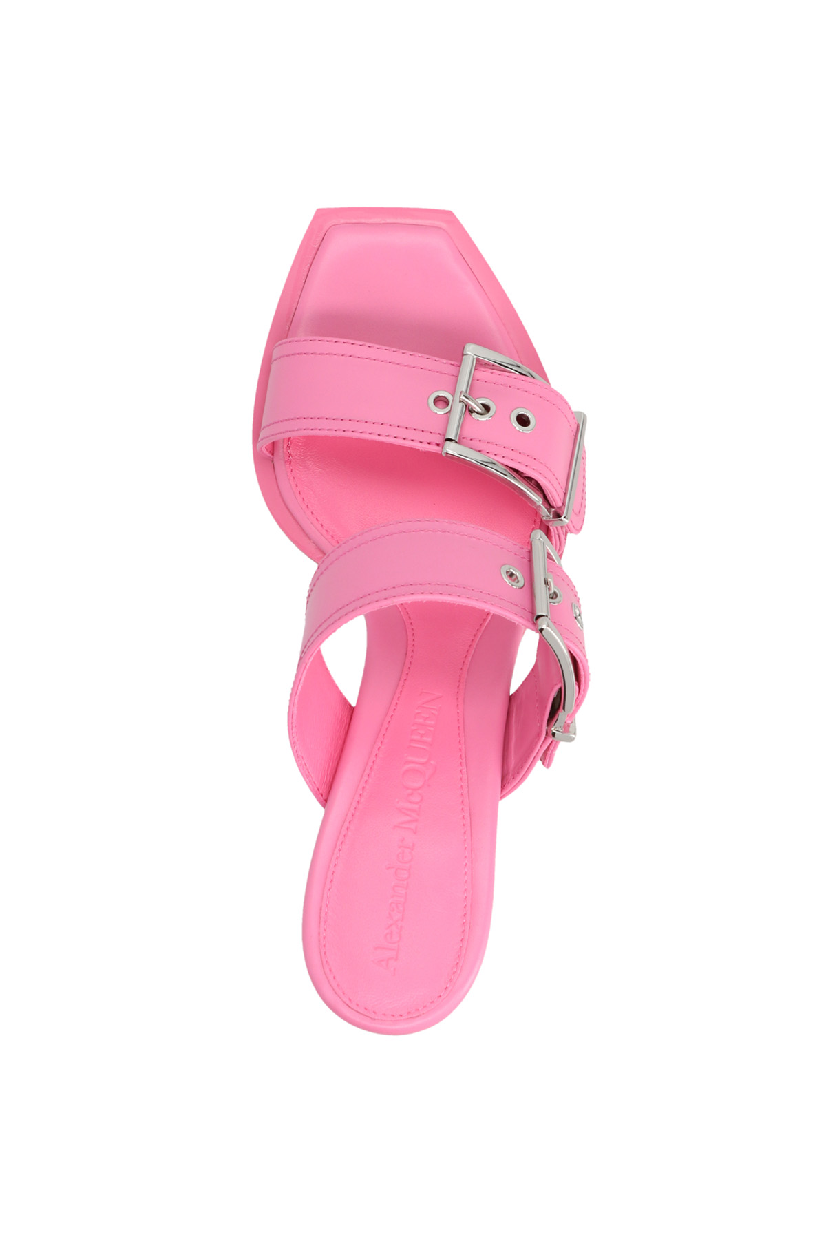 'Punk' leather sandals with silver finish buckles, and a square toe, a eadded leather insole, a logo, and shiny stiletto heels.heels.