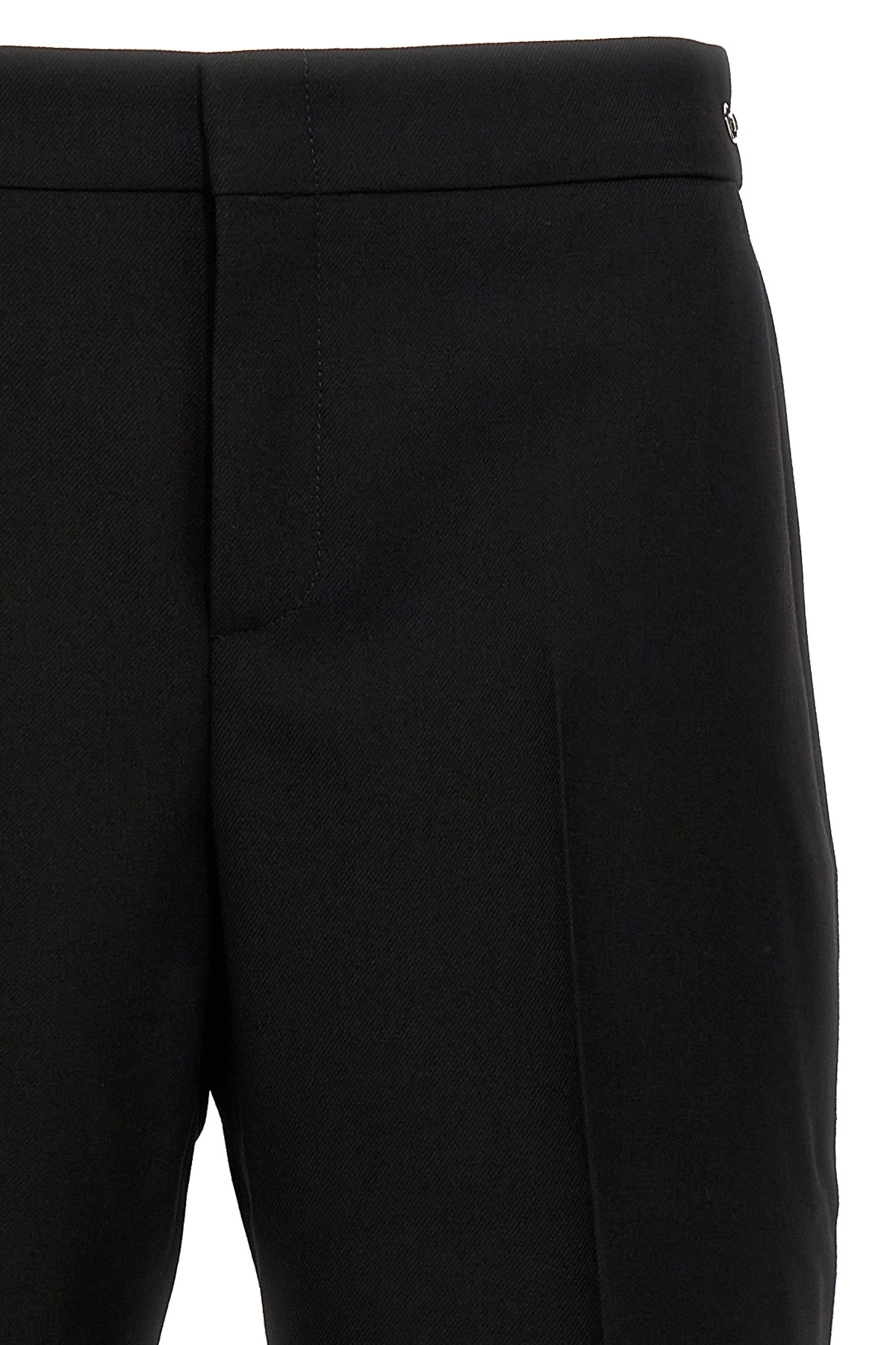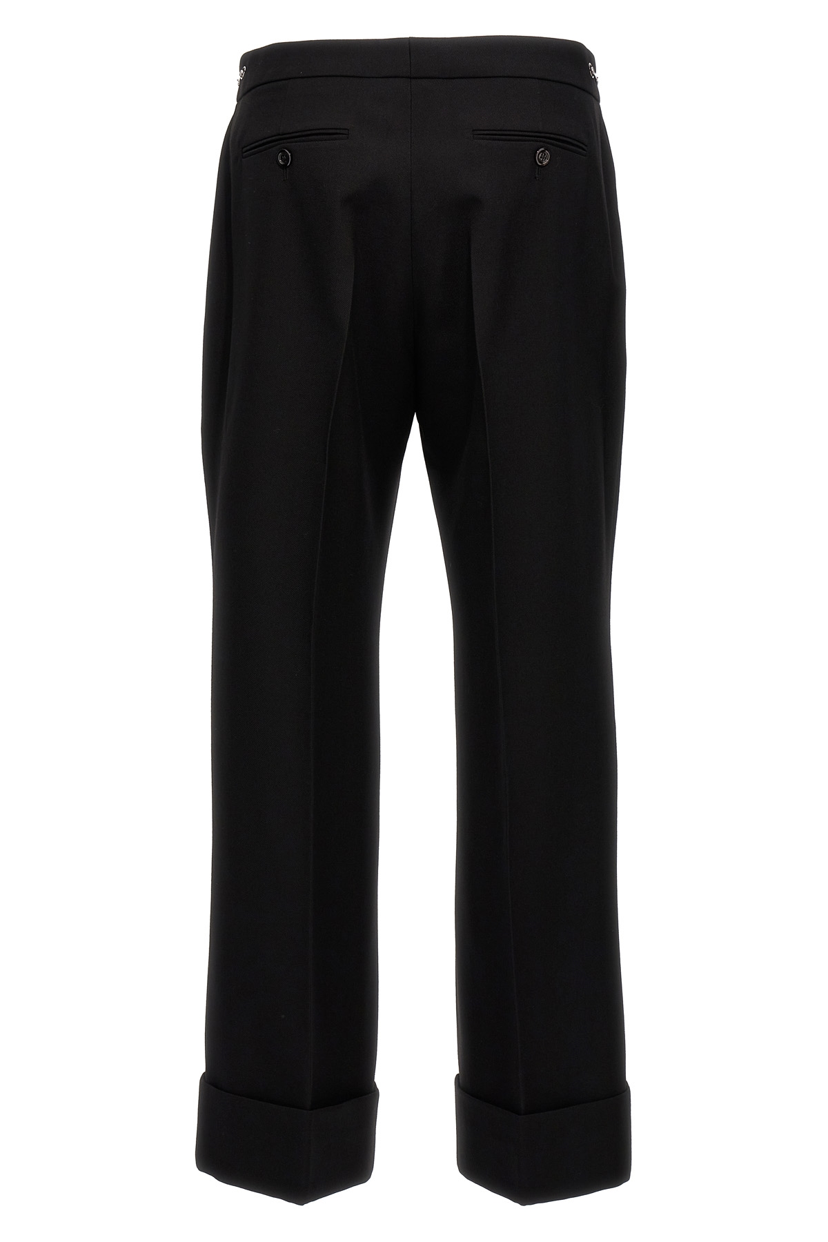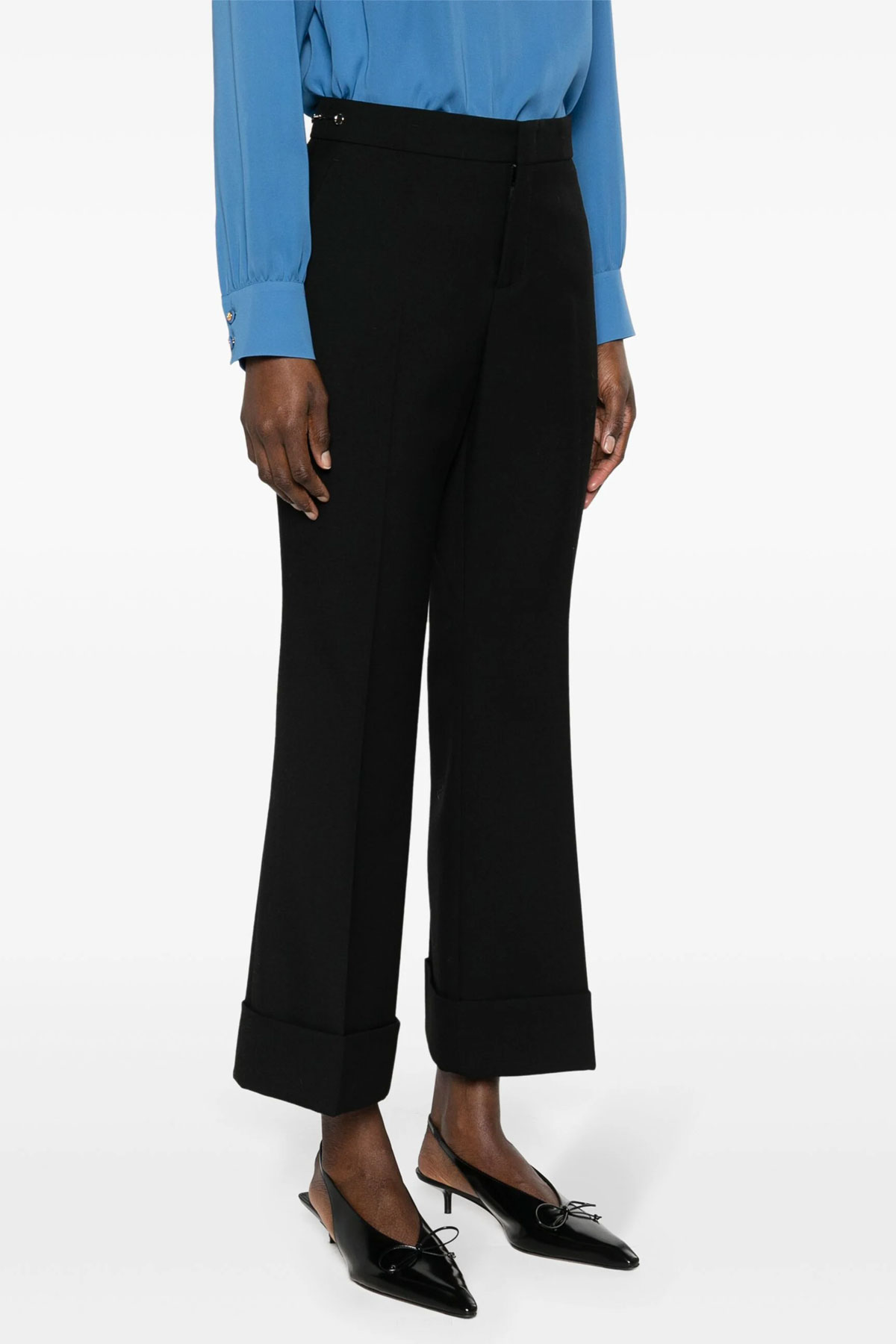 Wool pants with 'Morsetto' detail at the waist, hook and button zip closure, pockets, flared leg with turned-up hem.