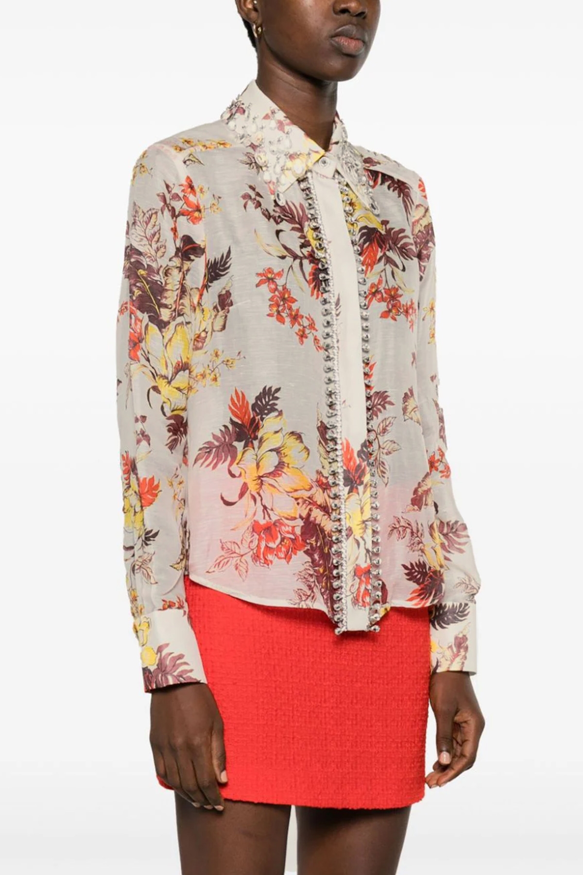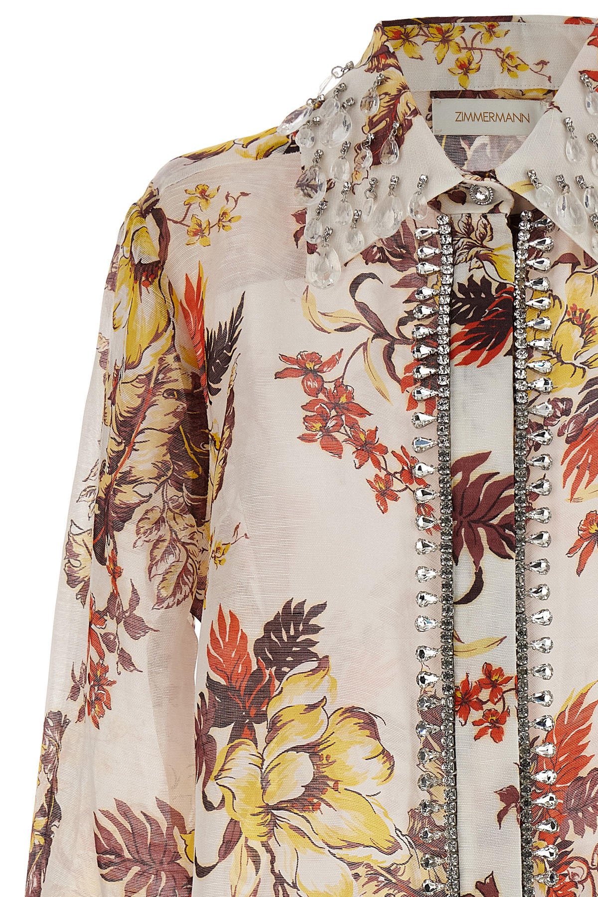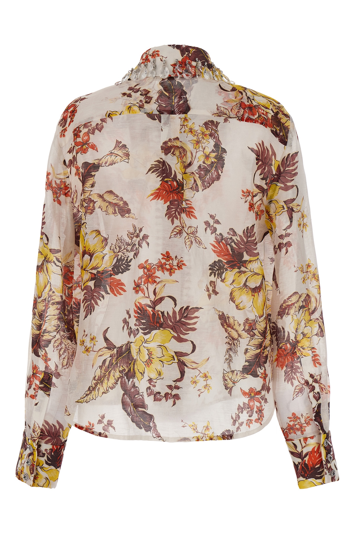 'Matchmaker Tropical' linen and silk shirt with all-over print, button closure and jewel detail, long sleeves with cuffs.