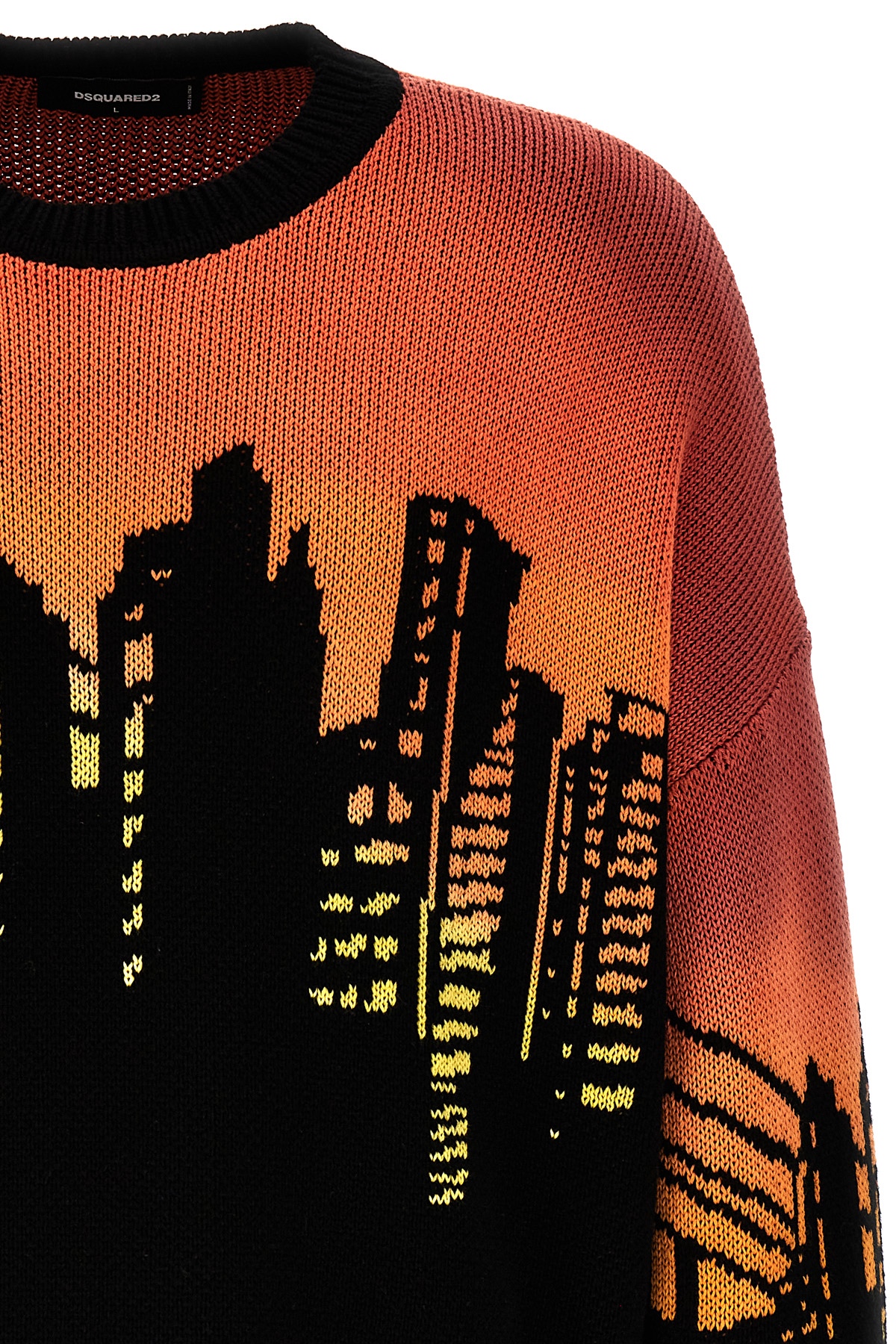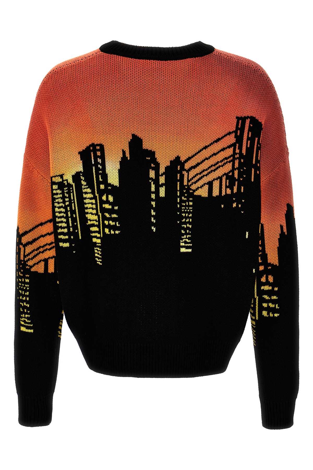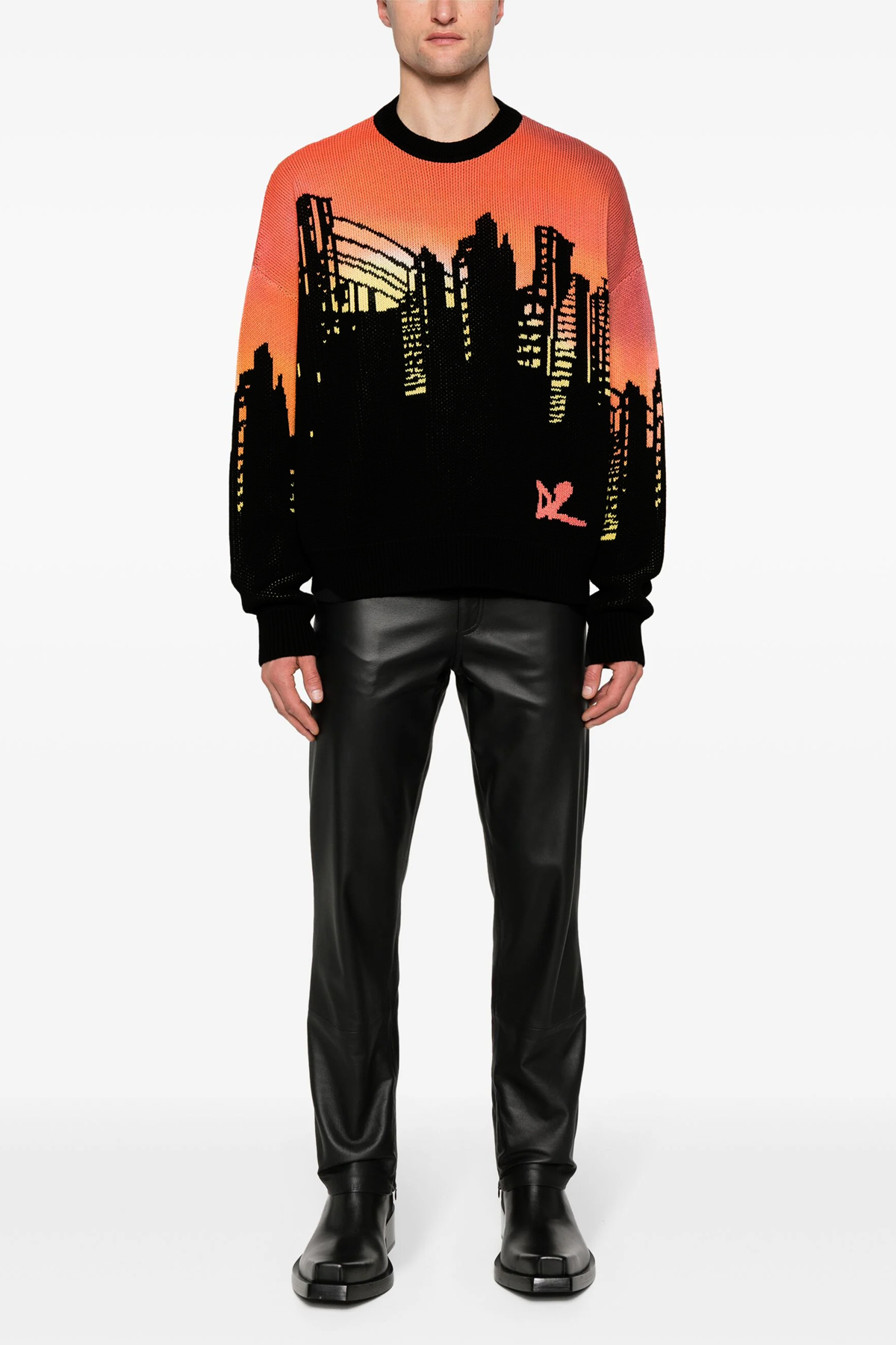 Cotton sweater with skyline intarsia at sunset, crew neck model.