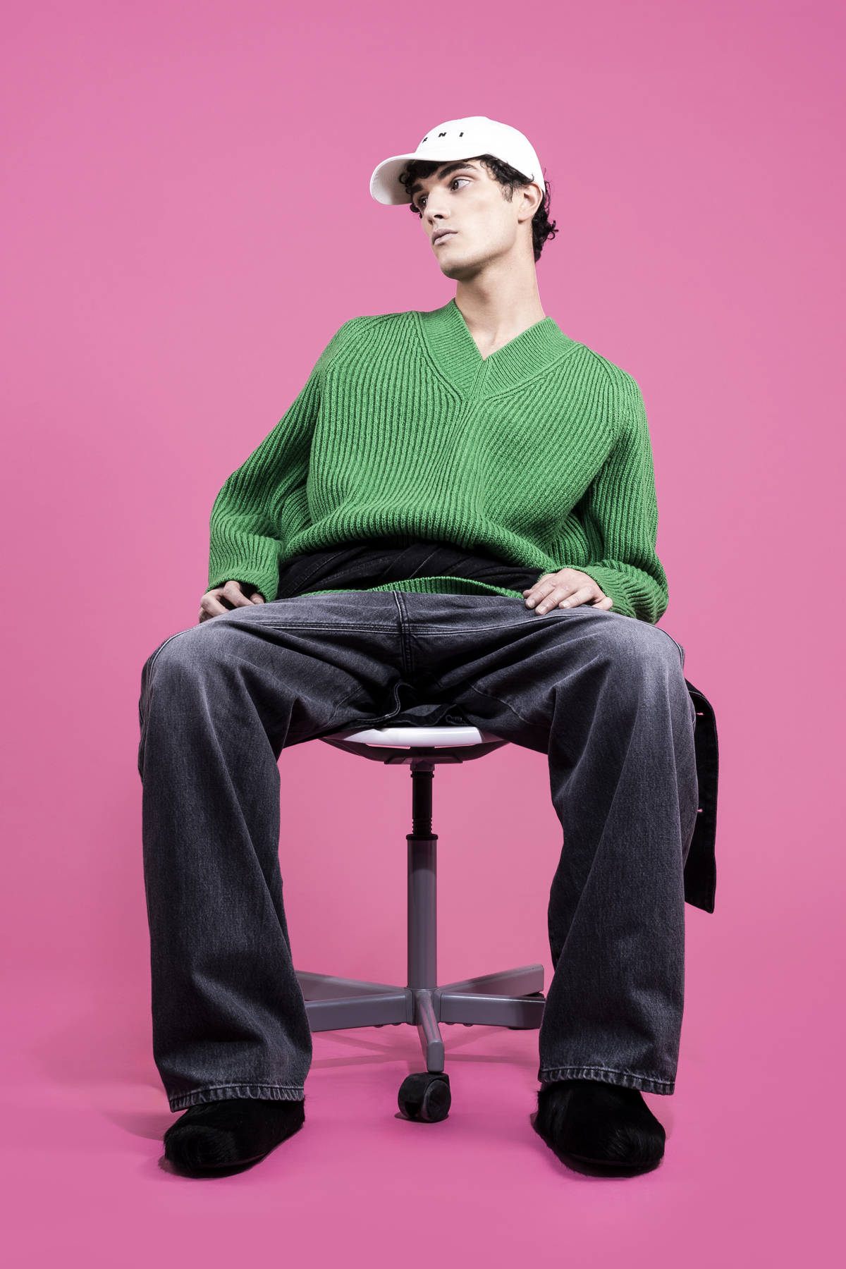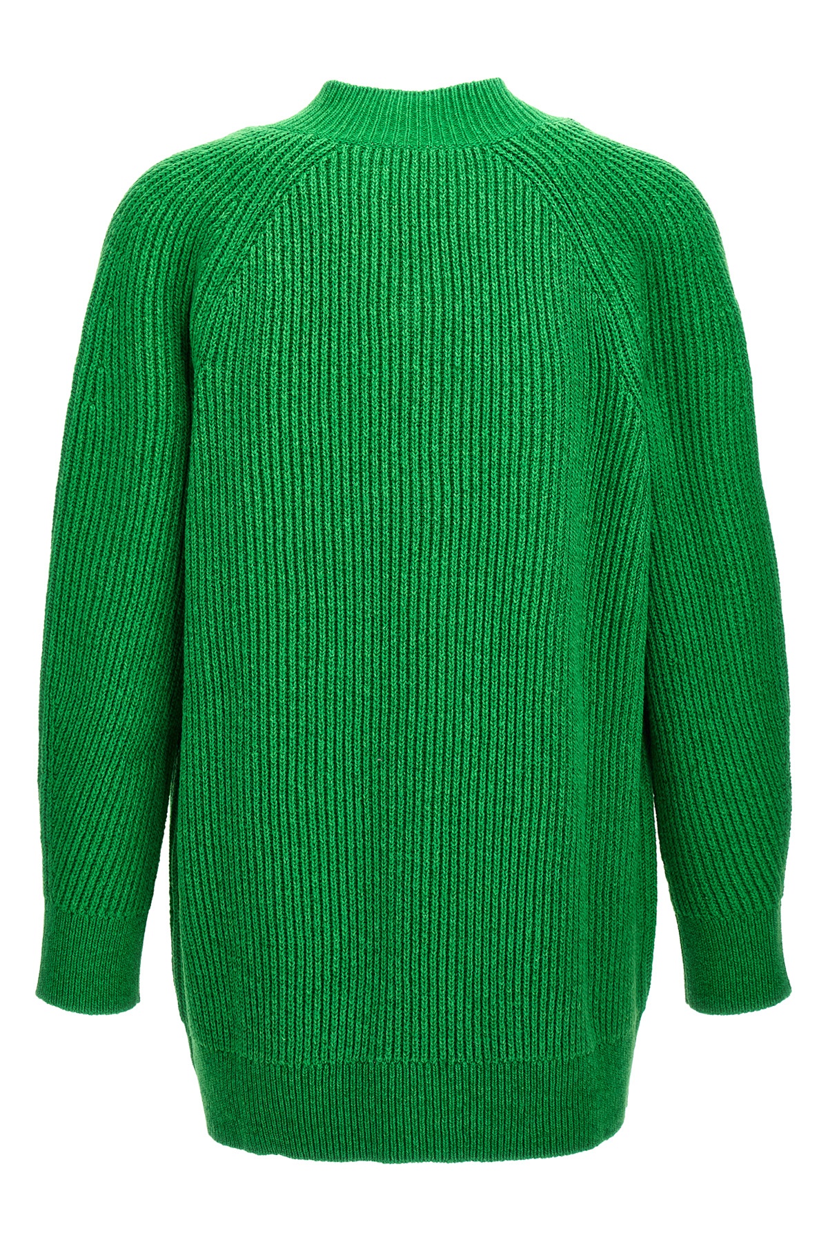 Oversized cotton blend sweater with V-neck, long cuffed sleeves.