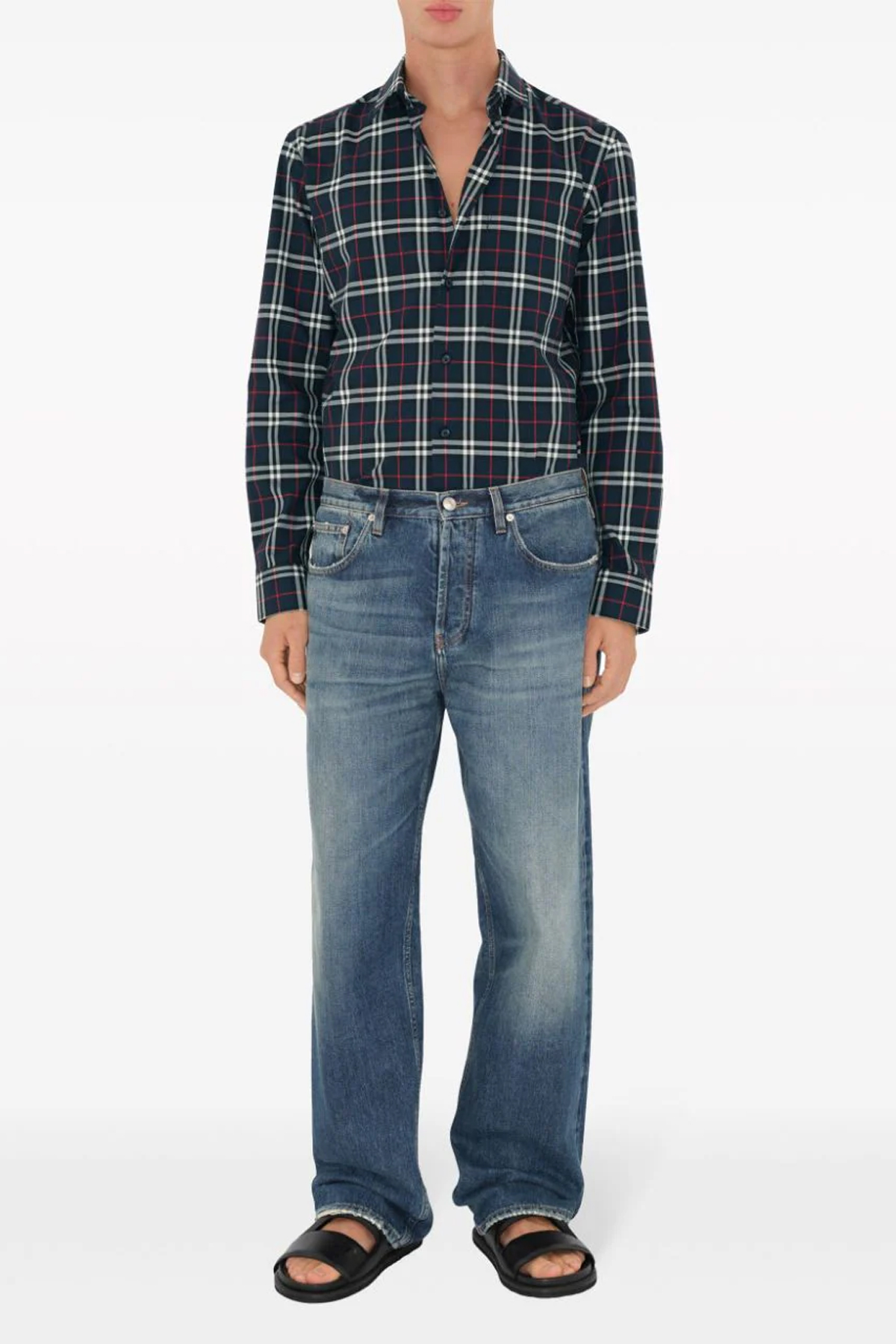 Check print cotton shirt, front pocket, button closure, long cuffed sleeves.