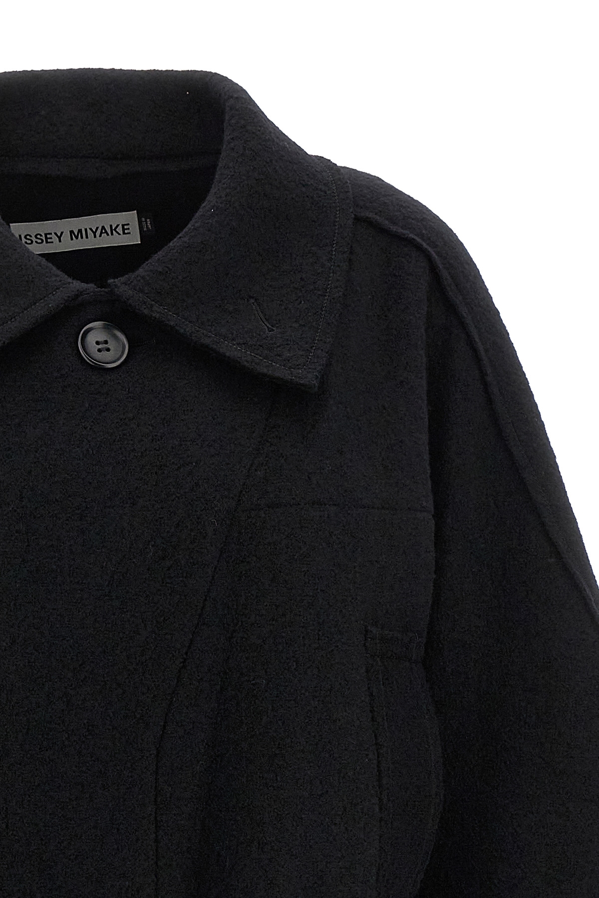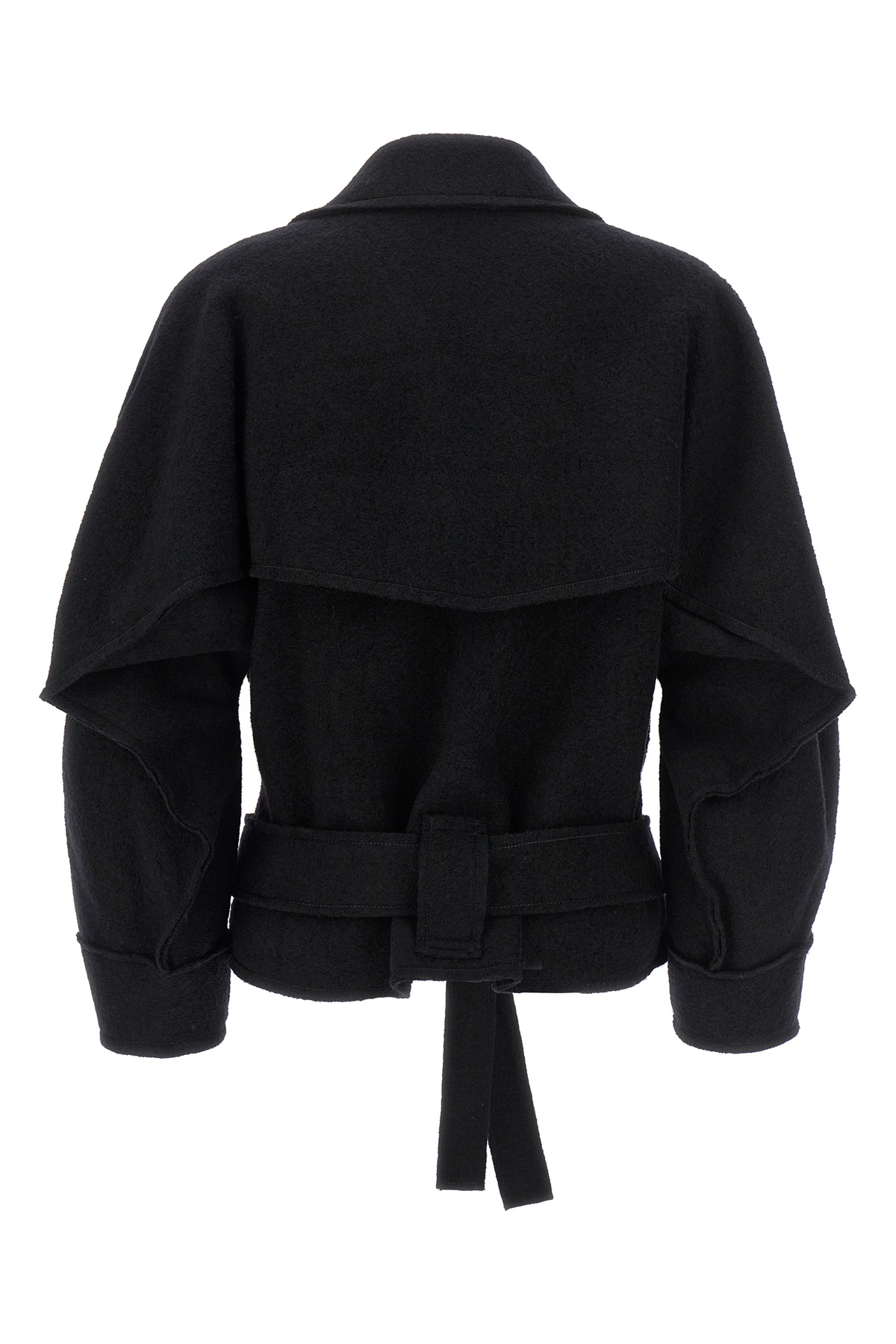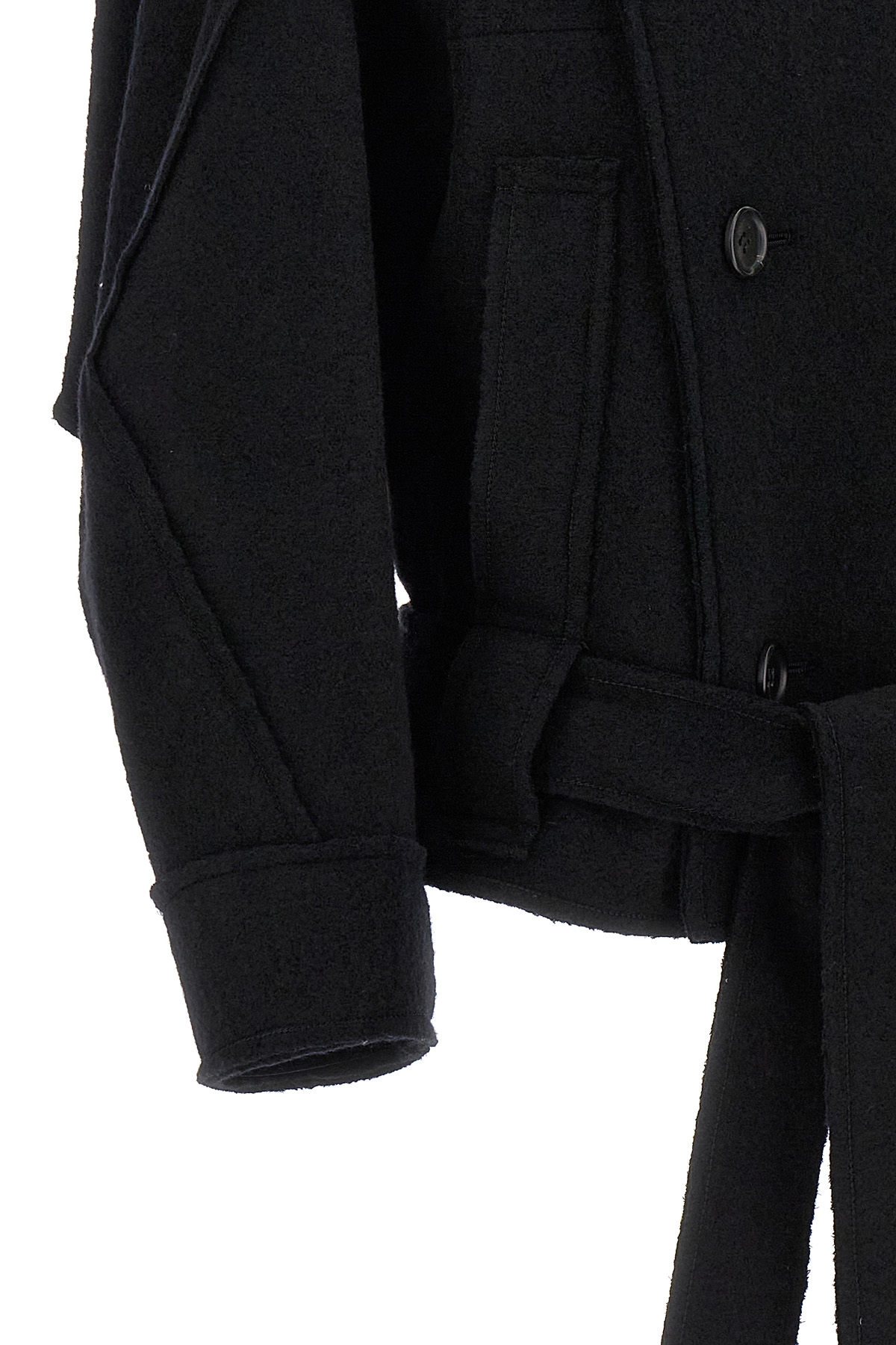 'Out of a Cube' short wool blend coat with button closure and belt at the waist, long sleeves.