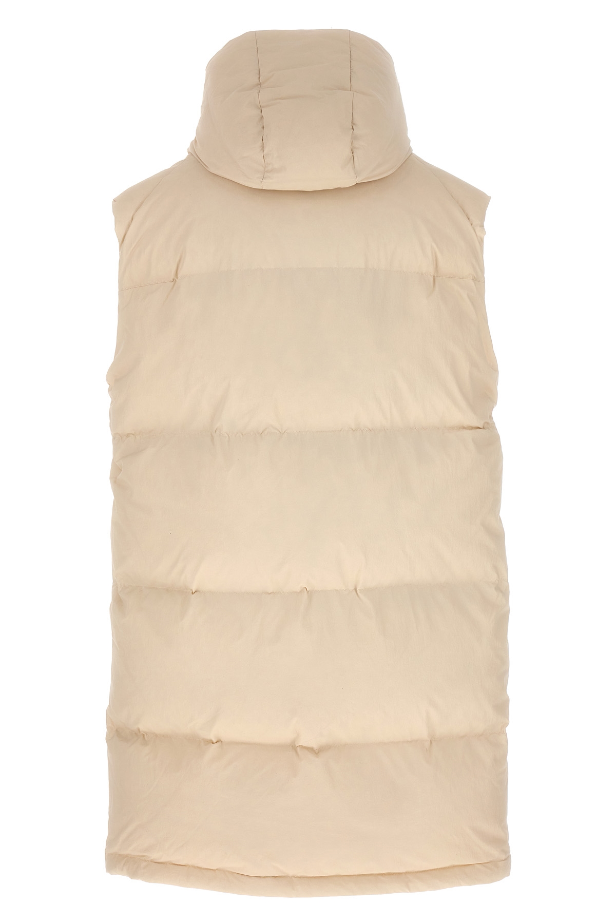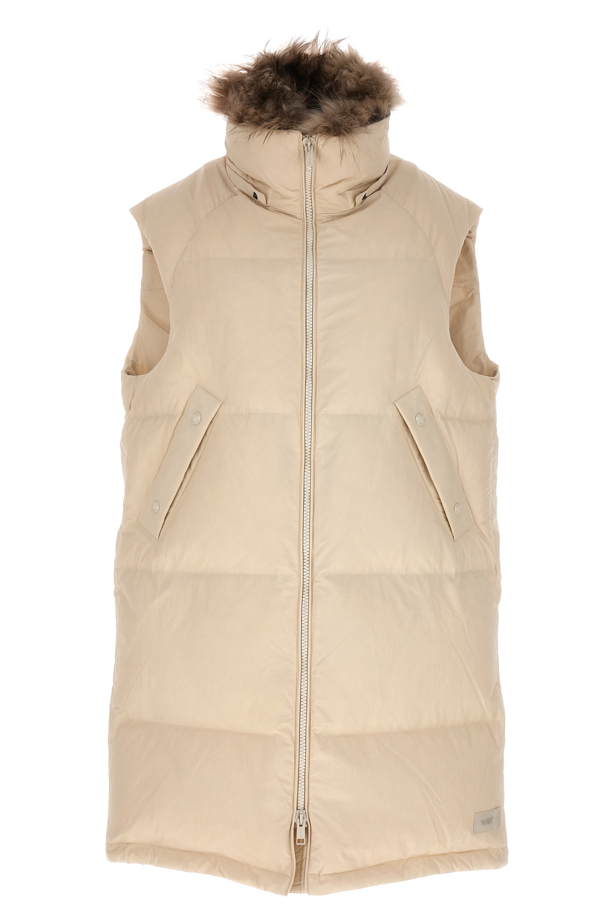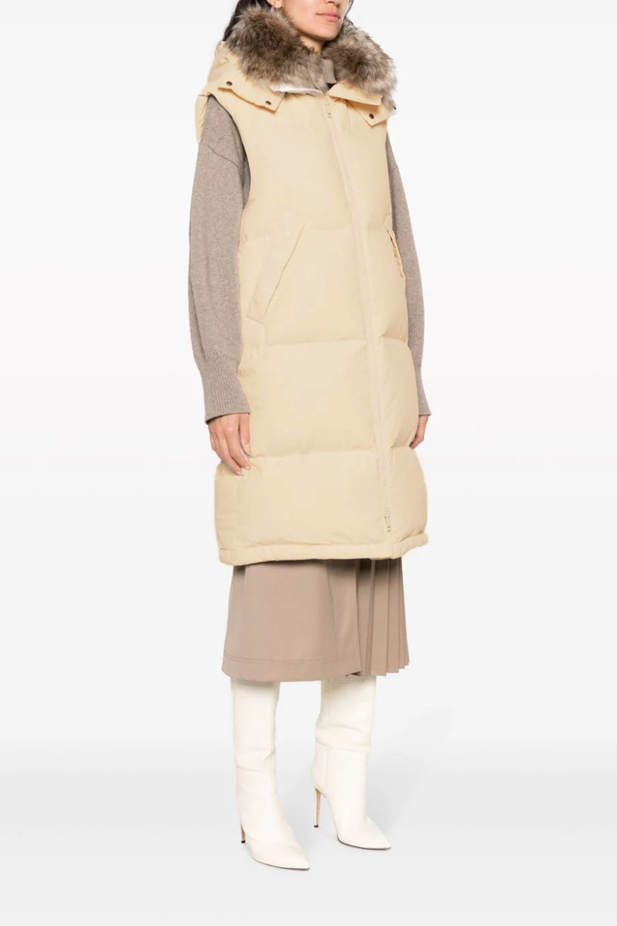 Long vest in nylon blend with down padding, removable hood, removable fur insert, zip closure, pockets, adjustable drawstring on the bottom of the garment.