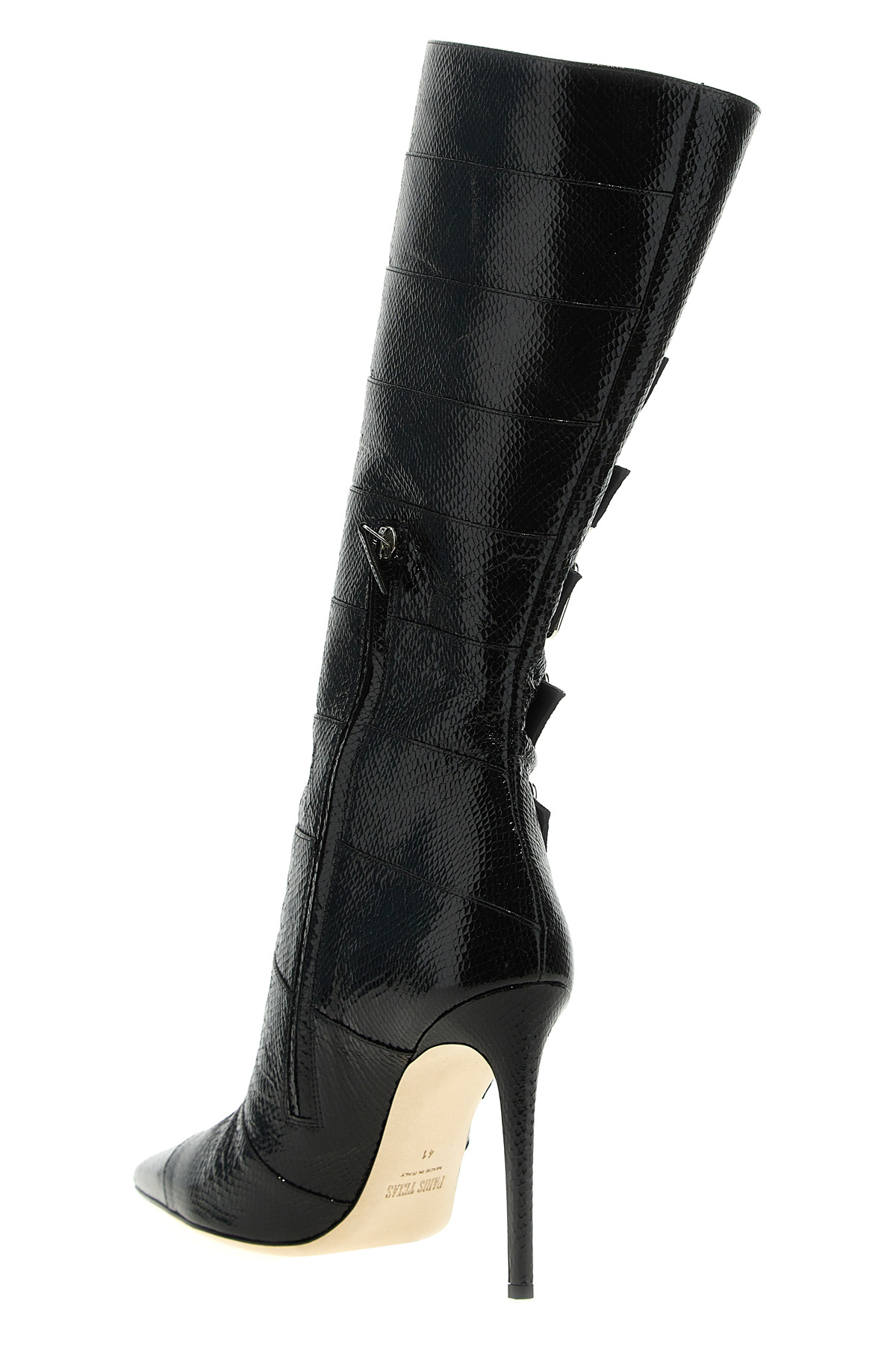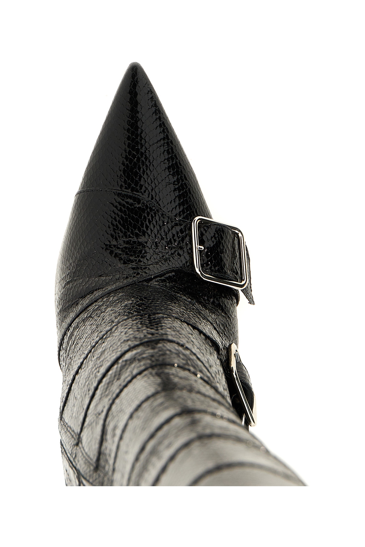'Tyra' metallic leather boots with viper print, stiletto heels.