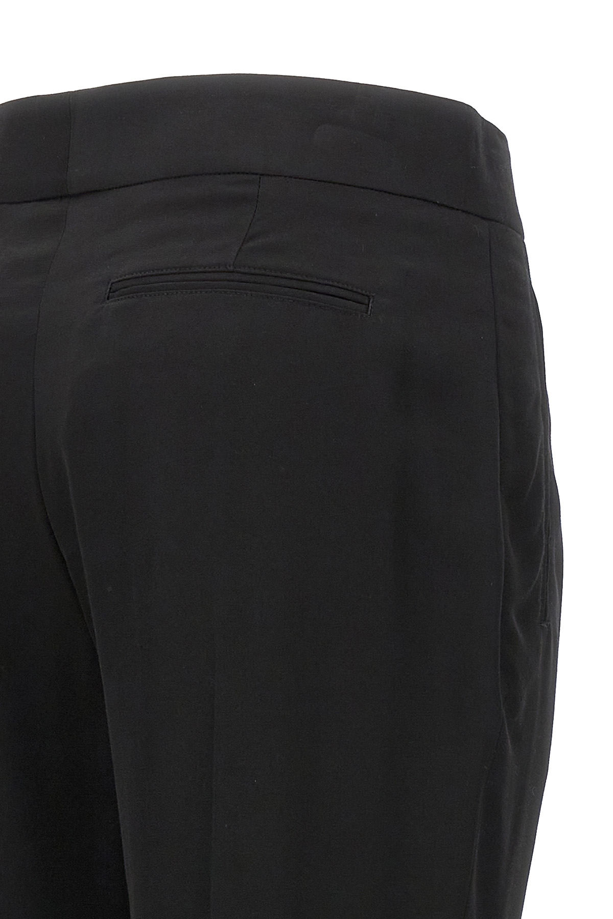 Viscose pants, zip and hook closure with gold metal bar detail with engraved logo, pockets, pences and central crease.