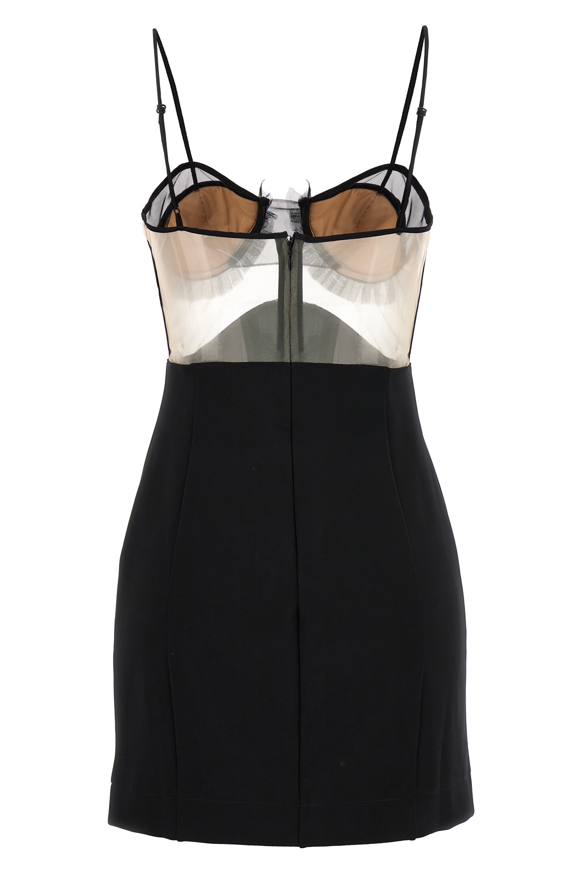 'Explosive Flower Bra' dress in stretch fabric with tulle inserts, padded cups, thin adjustable straps, and back zip closure.
