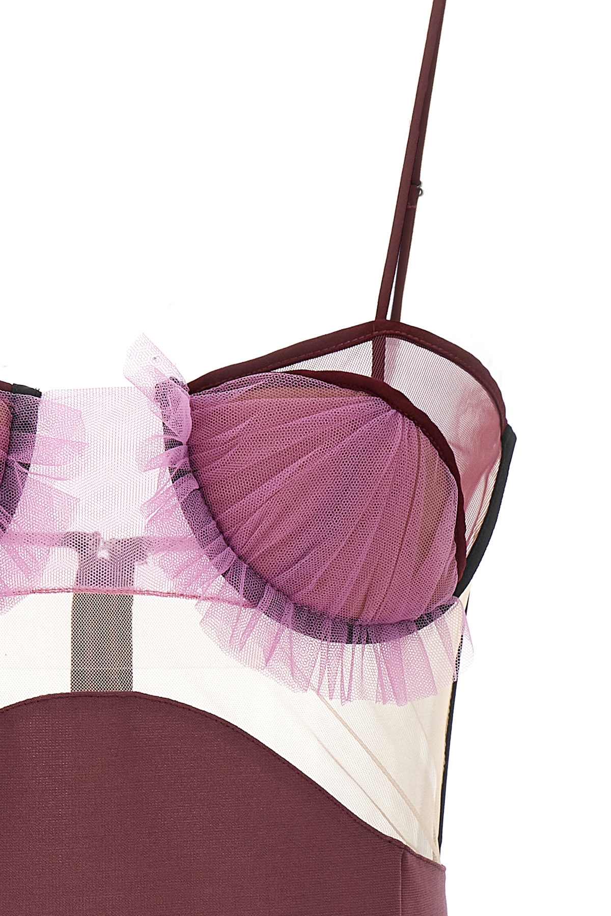 'Explosive Flower Bra' dress in stretch fabric with tulle inserts, padded cups, thin adjustable straps, and back zip closure.