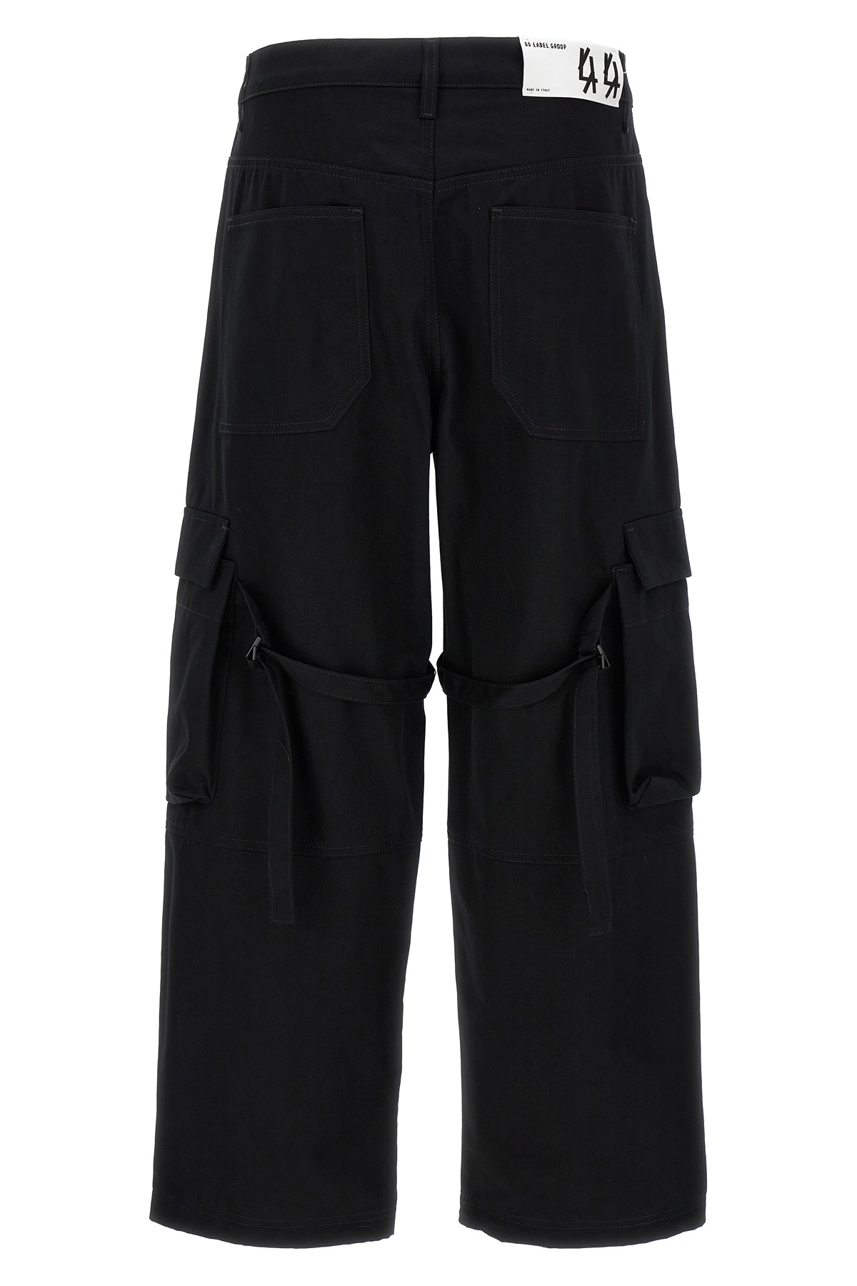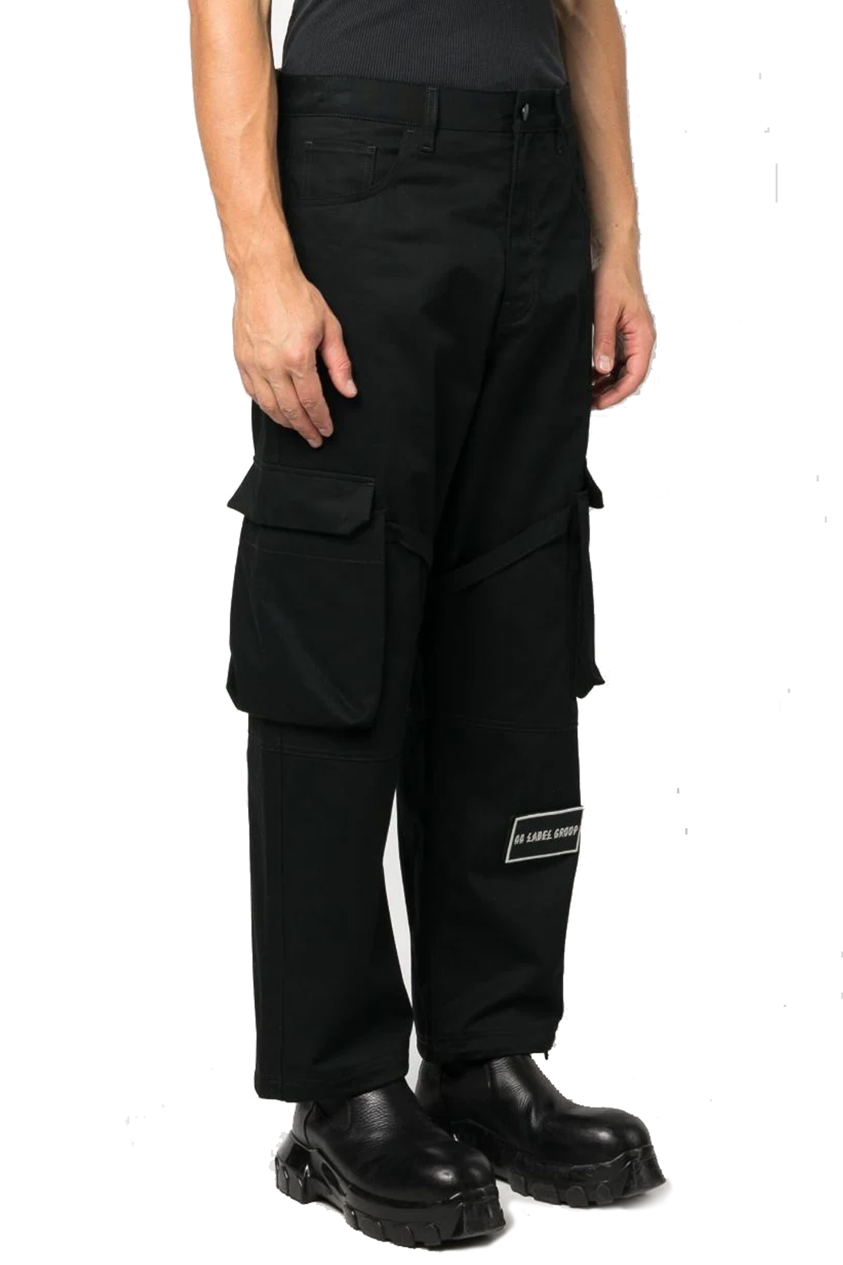 Cotton cargo pants, front logo patch, zip and button closure, pockets.