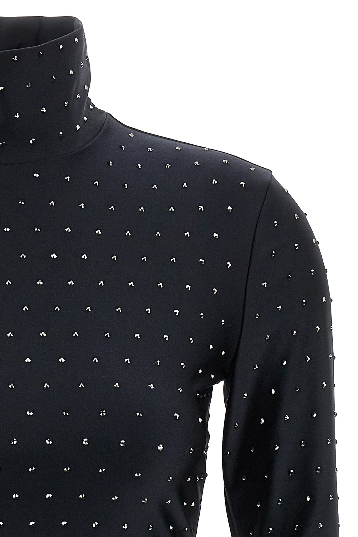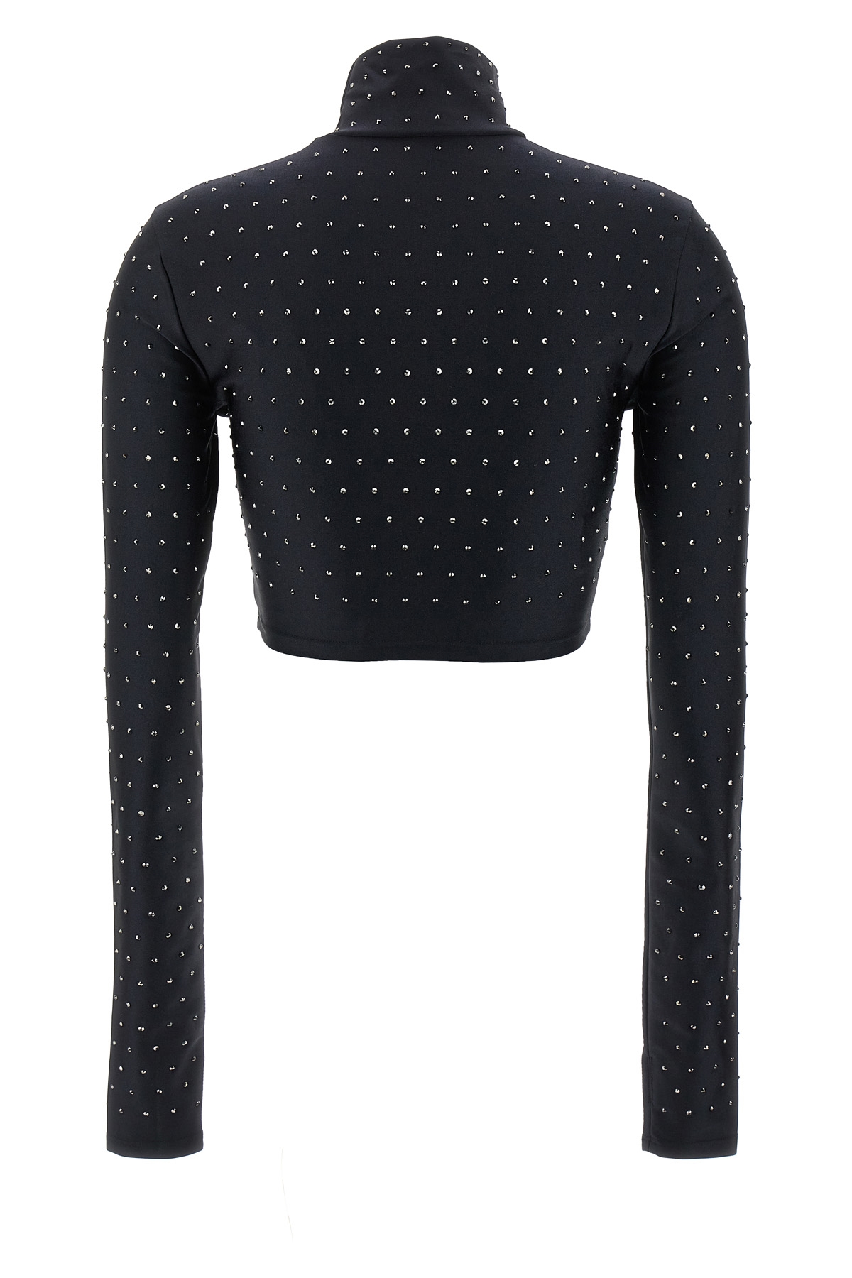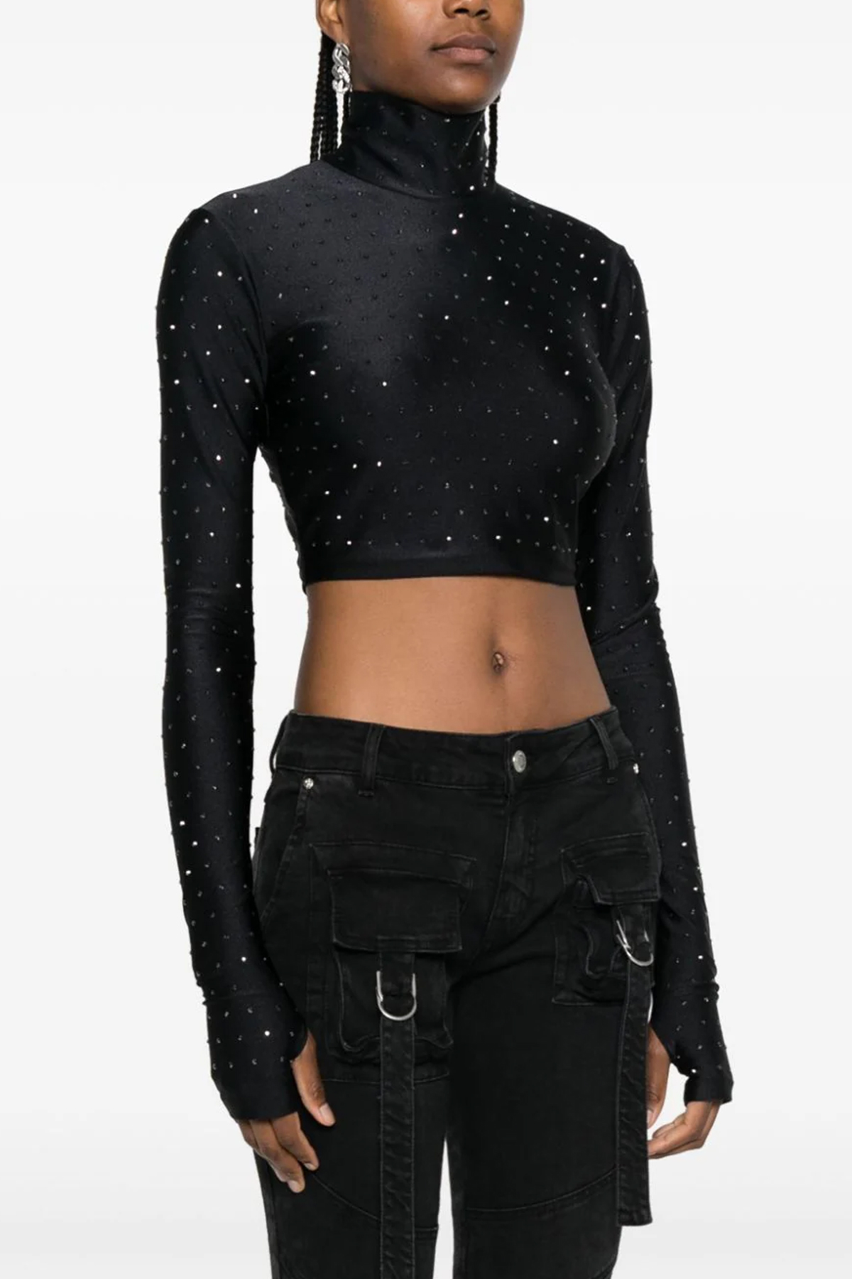 'Orchid Crystal' shiny lycra cropped top with rhinestone applique, high neck, and long sleeves.