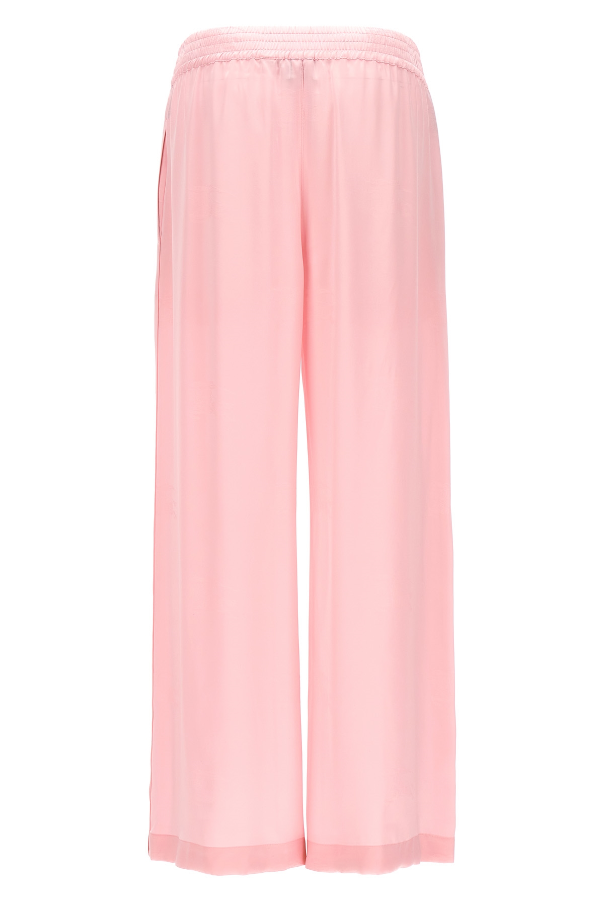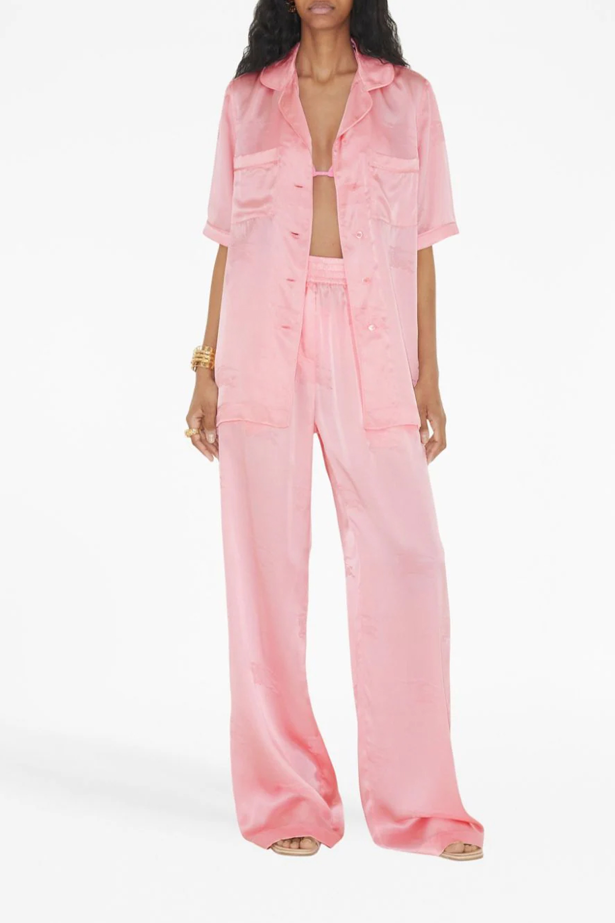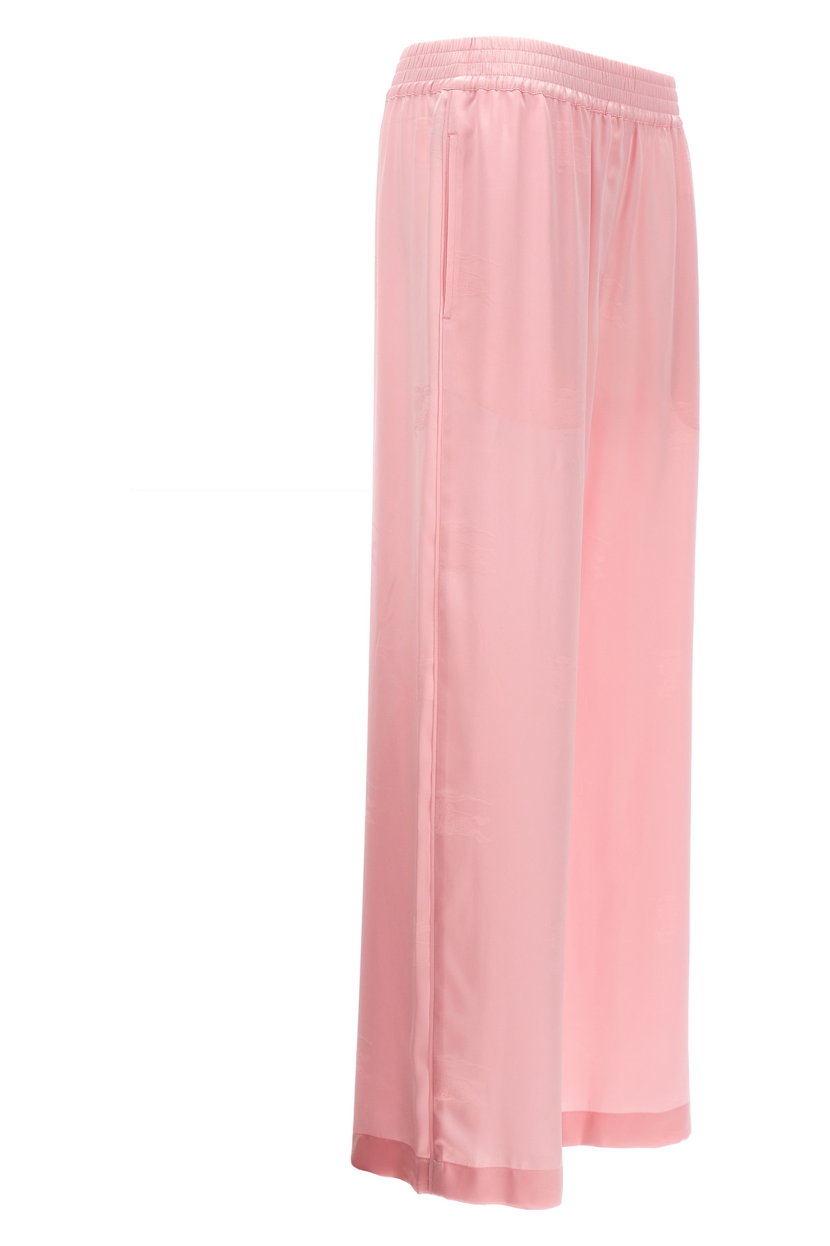 Summer capsule silk pants with all-over logo pattern, elastic waistband and pockets.