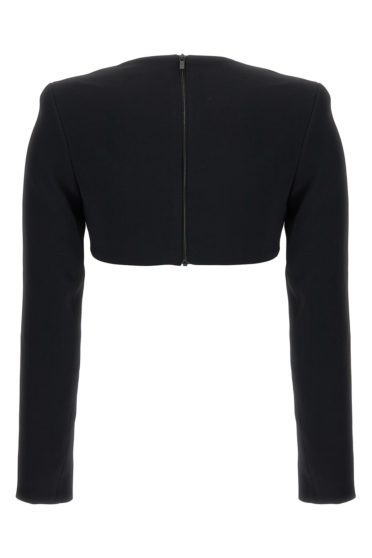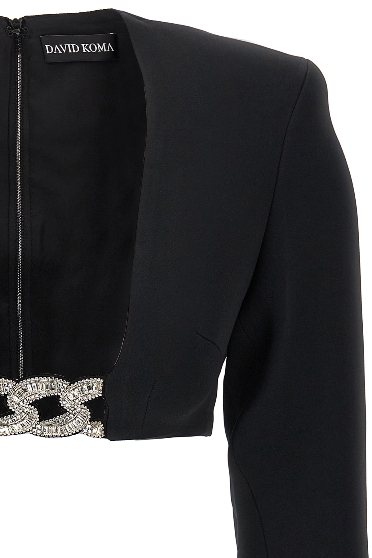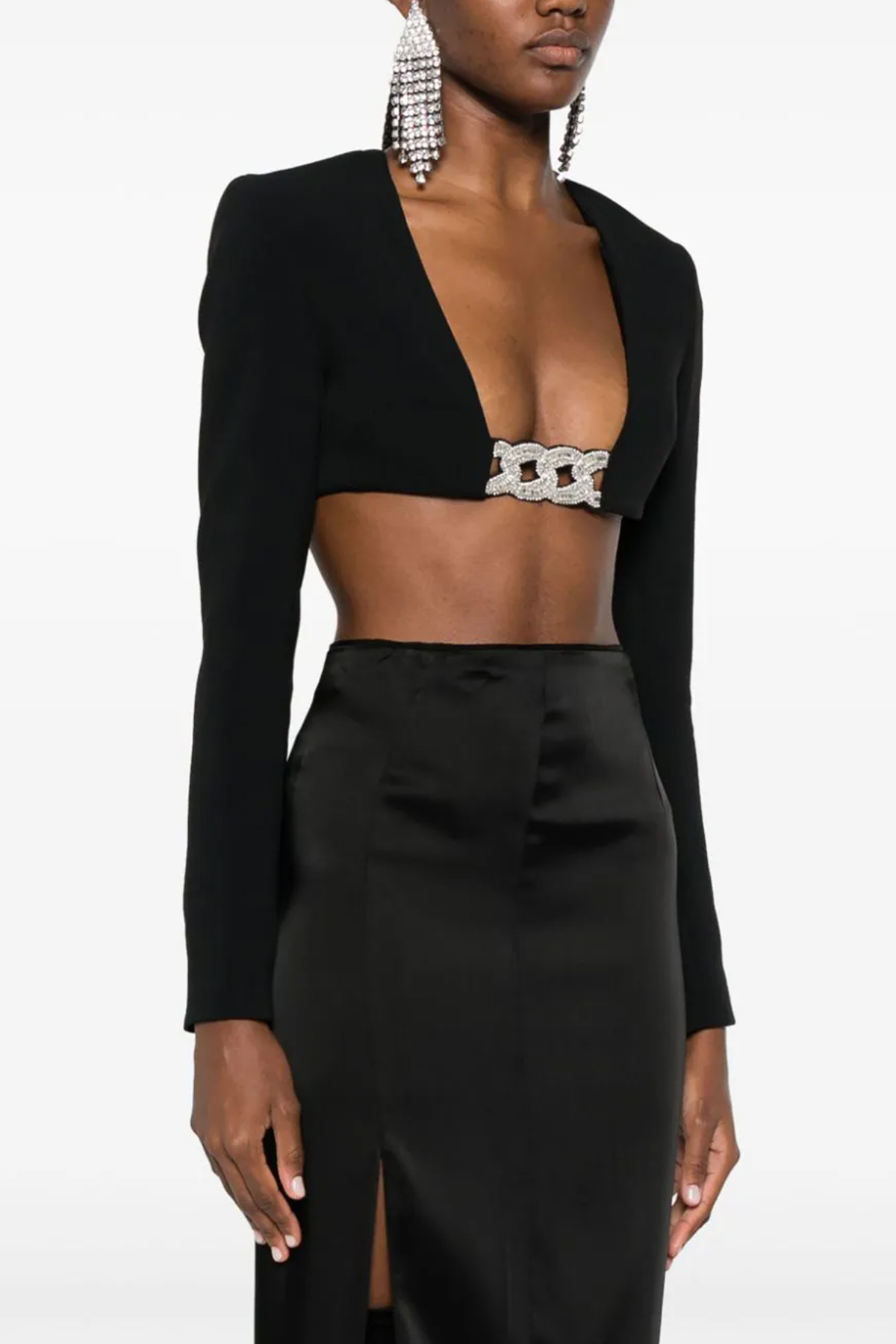 '3D Crystsal Chain and Square Neck' top in stretch cady with jewel chain detail on the front, cropped model with back zip closure, and long sleeves.
