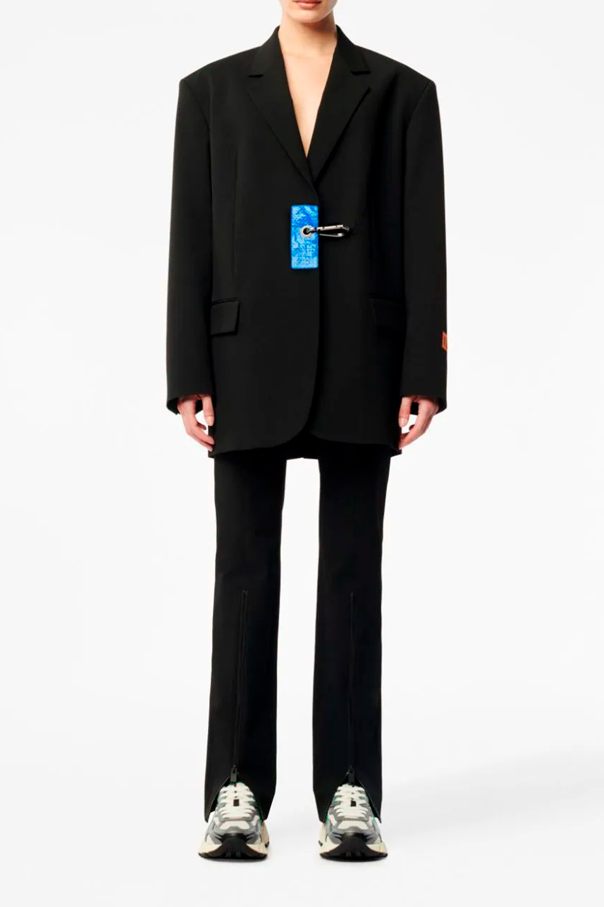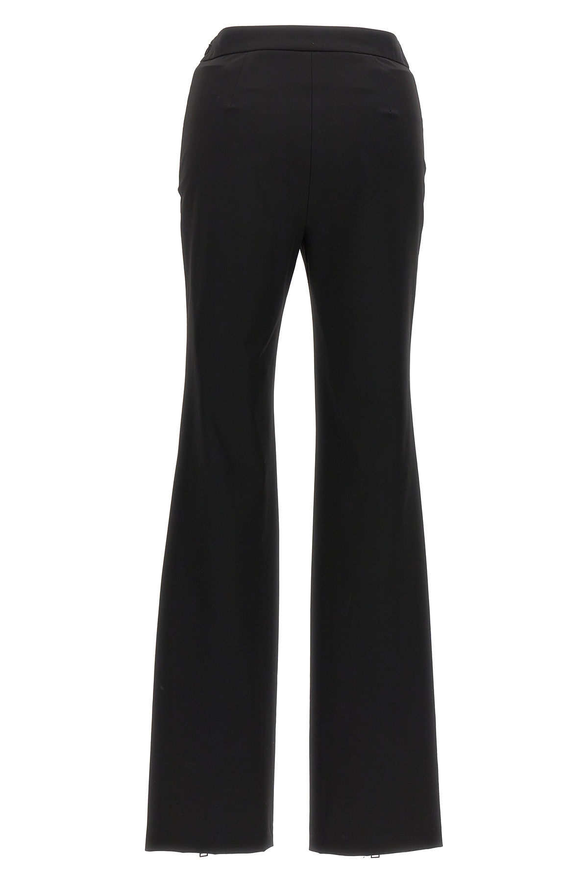 'Gabardine zip' stretch fabric pants with tone-on-tone maxi front zip from the knee down, and logo patch detail at the waist.