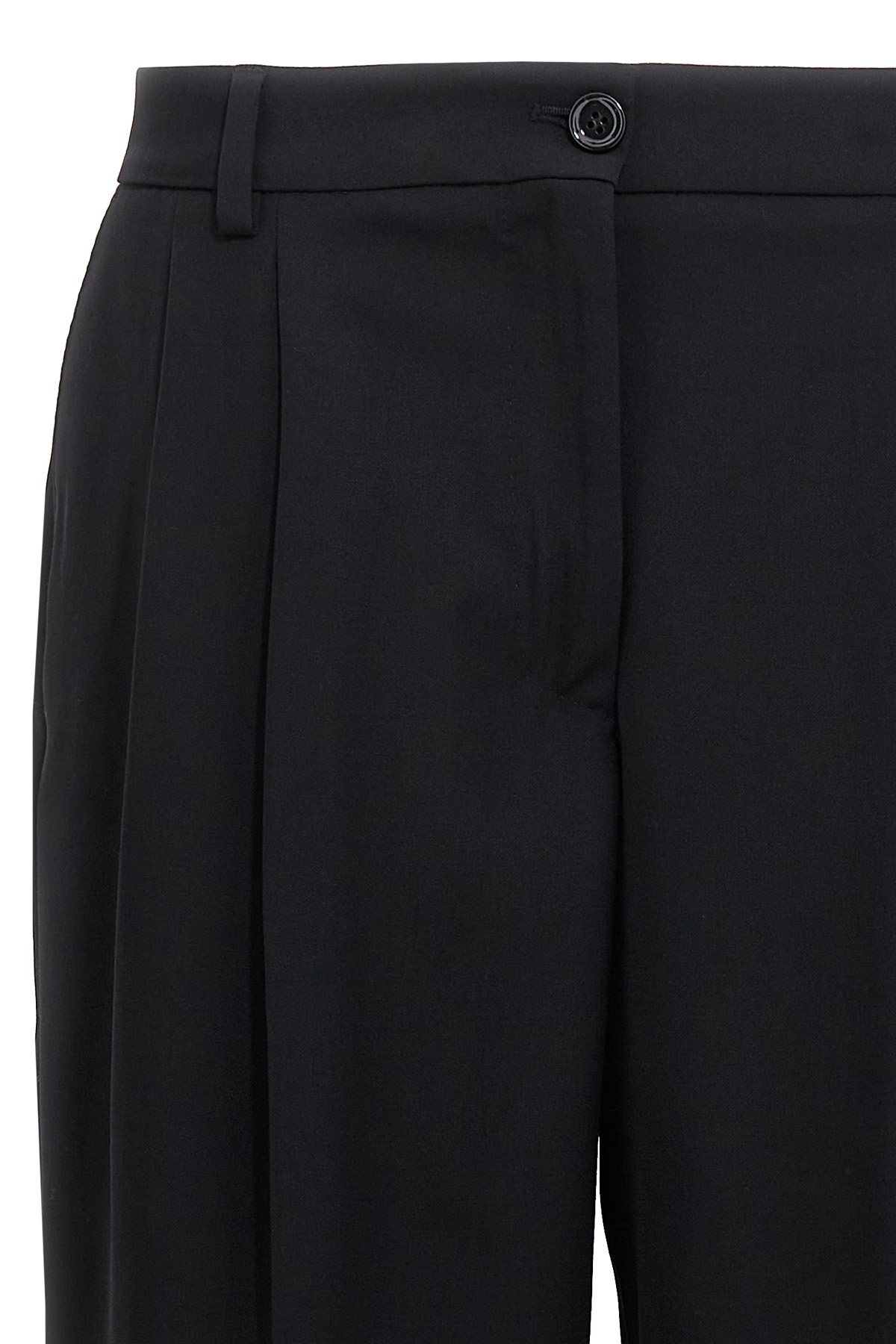 Flared pants in stretch wool canvas, pleats, zip and button closure, pockets.