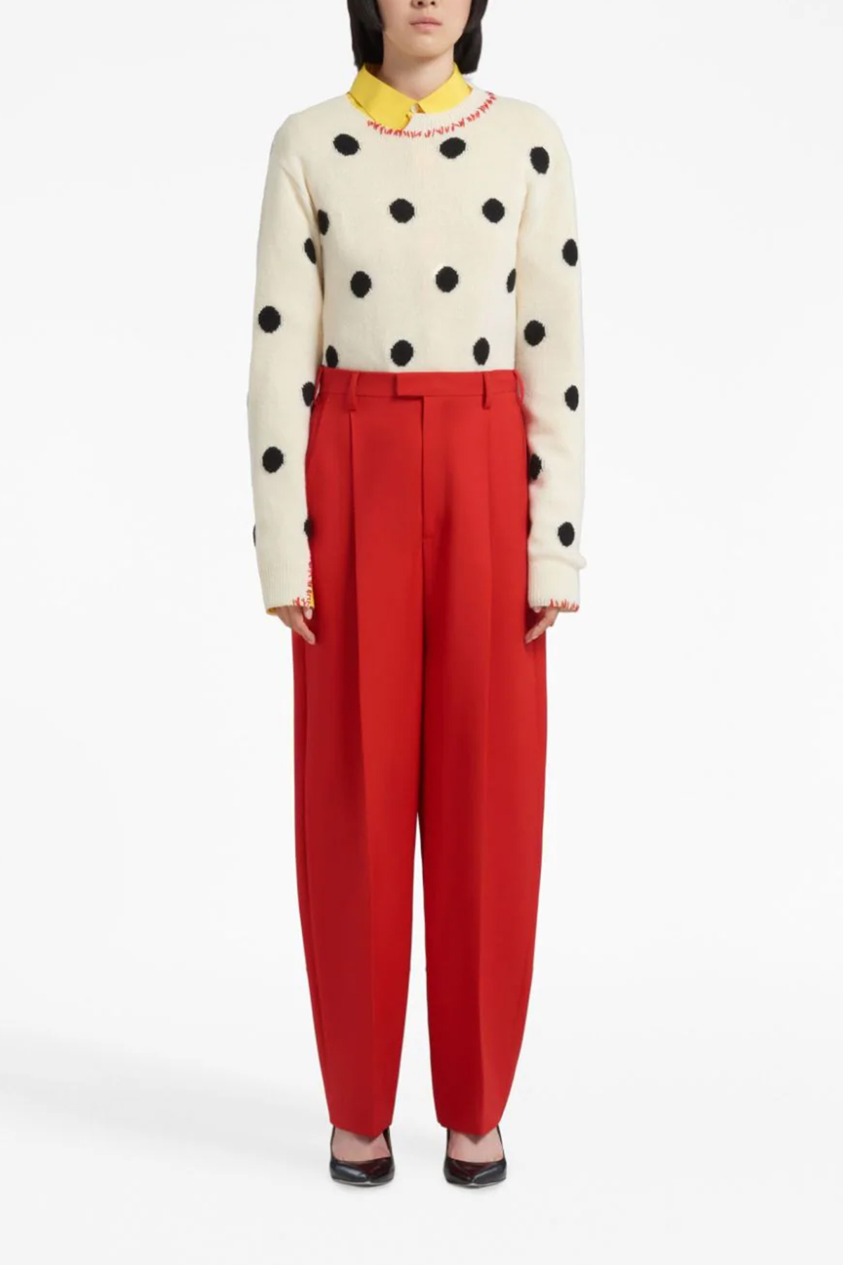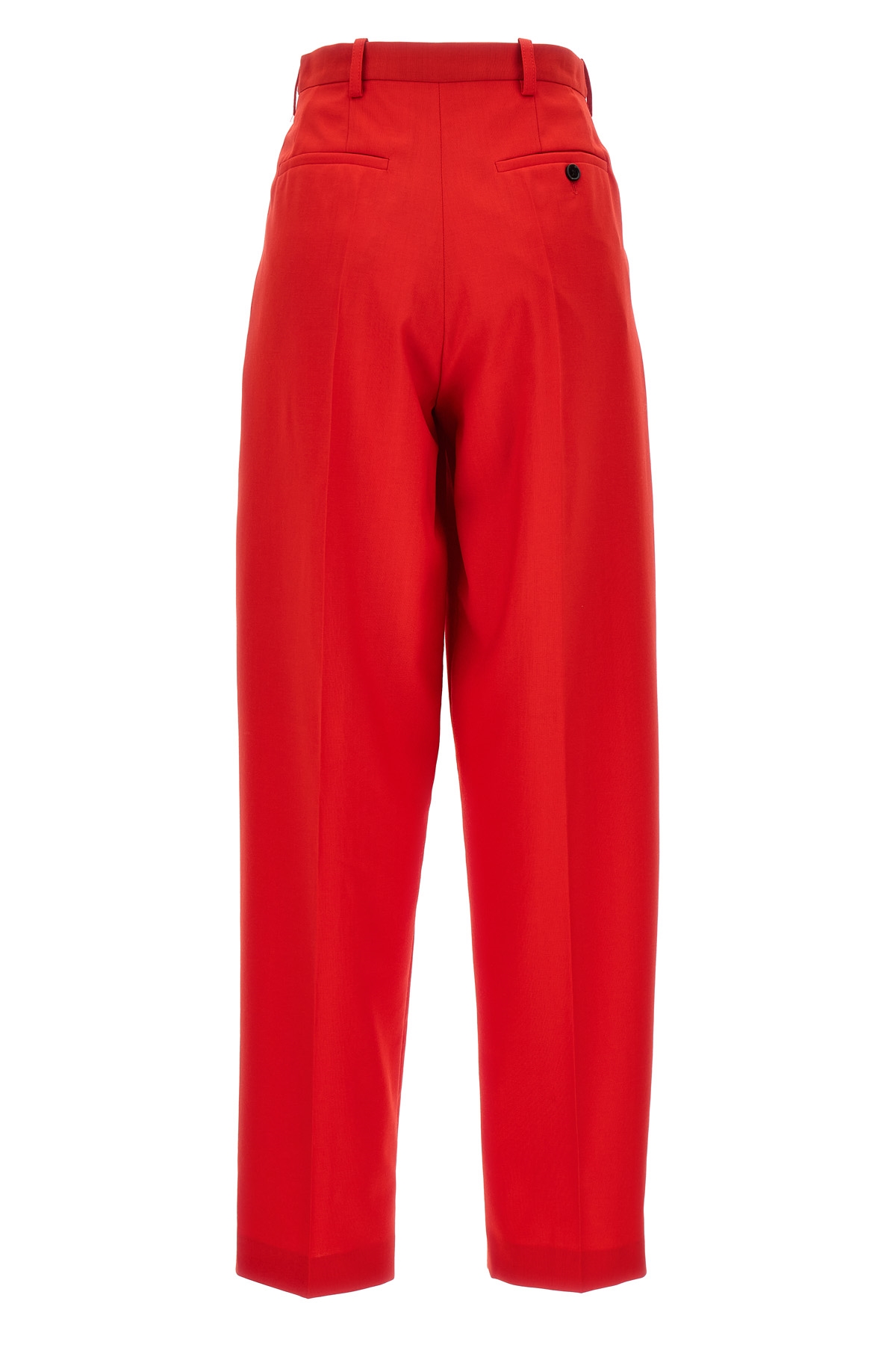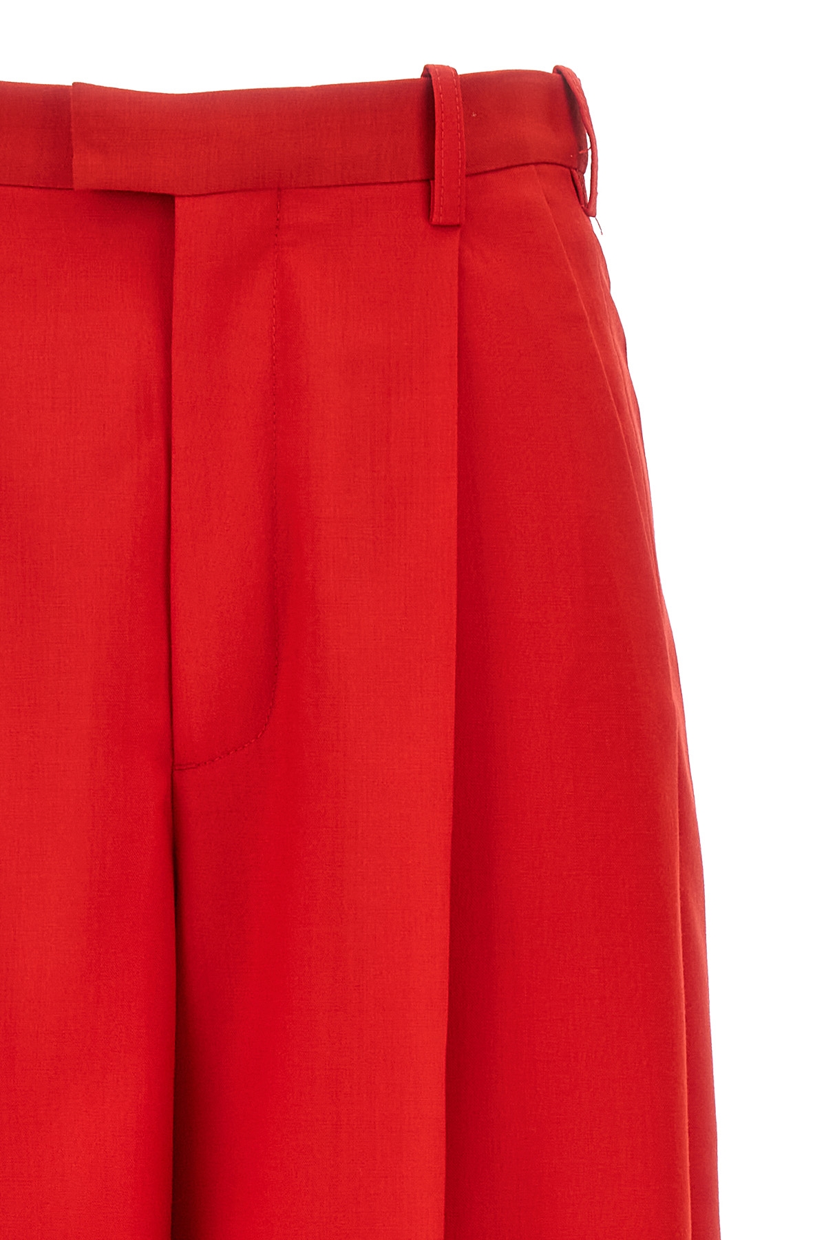 Wool pants, leg with pence and pleat, zipper, hook and button closure, pockets.