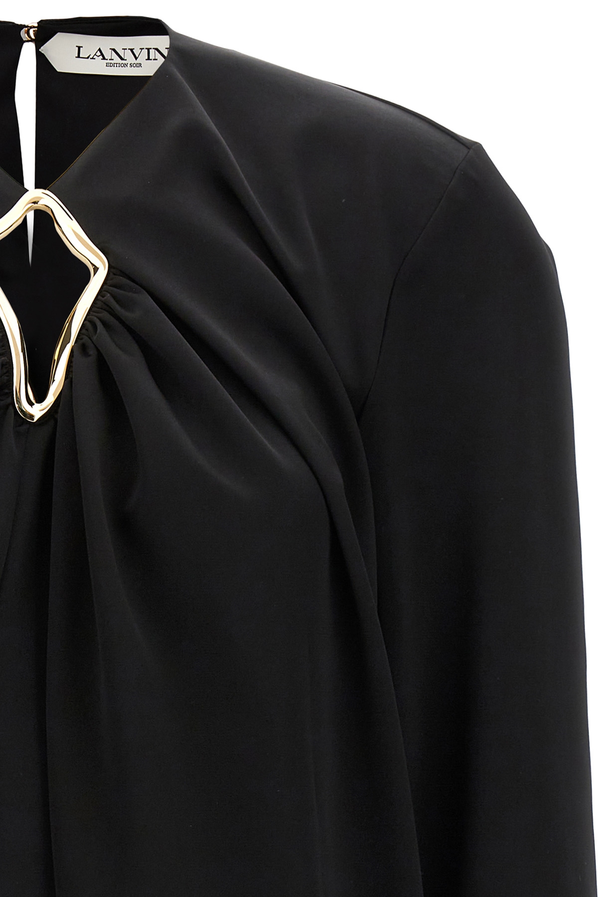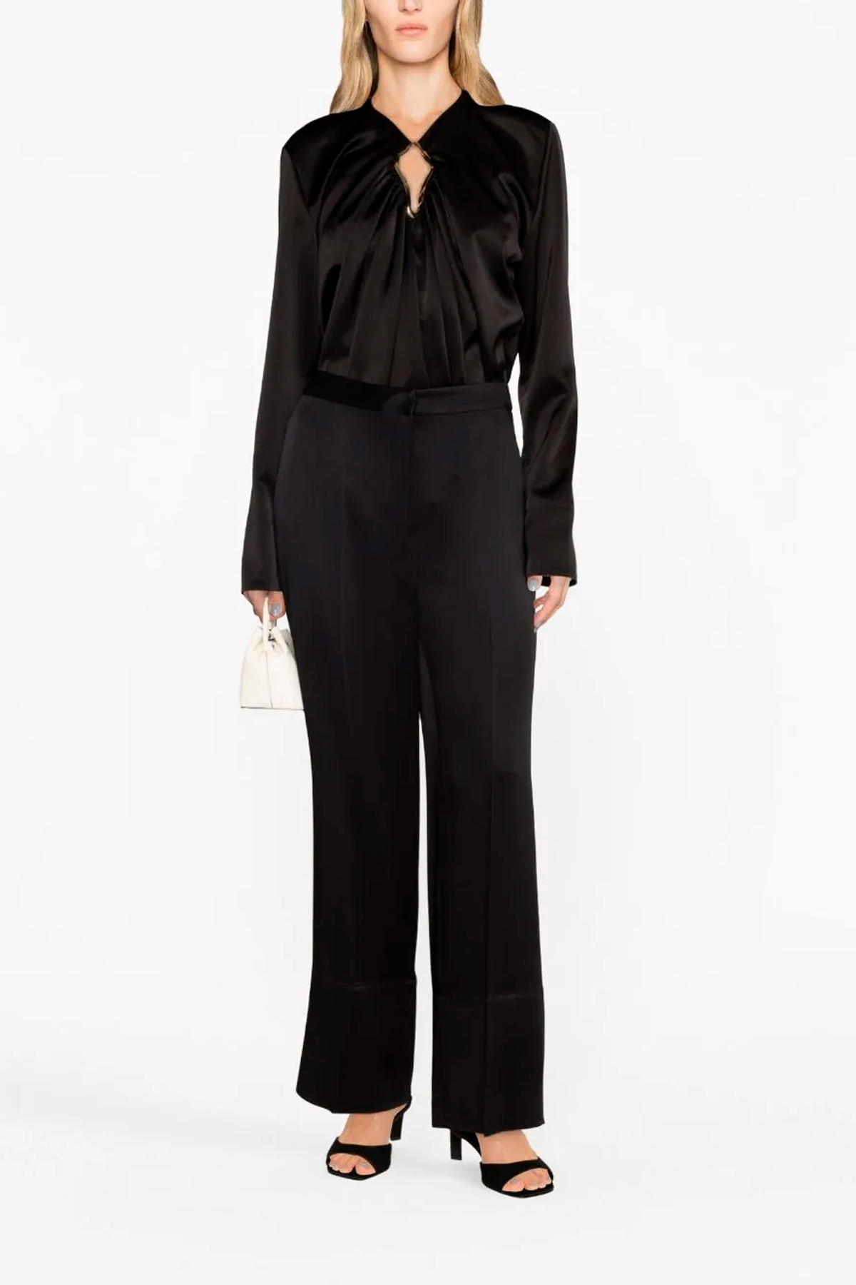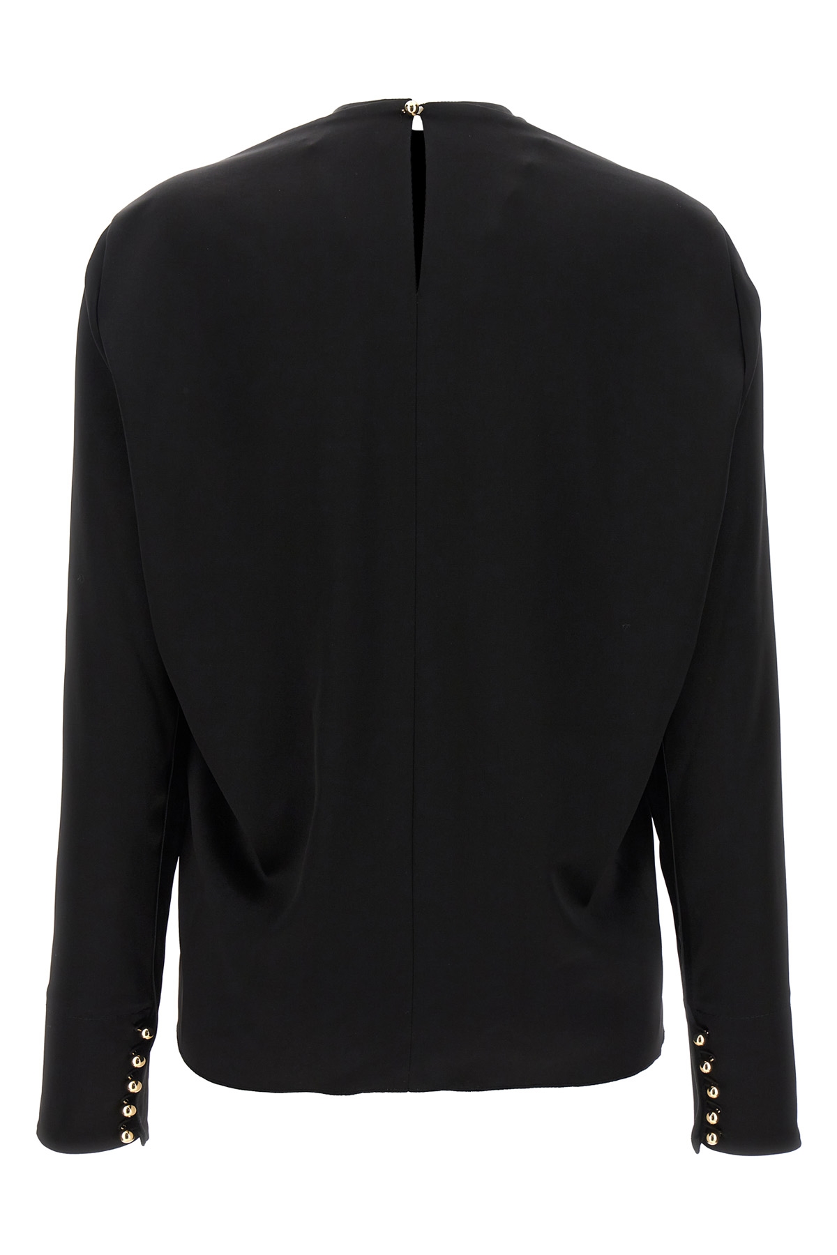 Satin blouse, neckline with metal detail, long sleeves, cuffs with buttons.