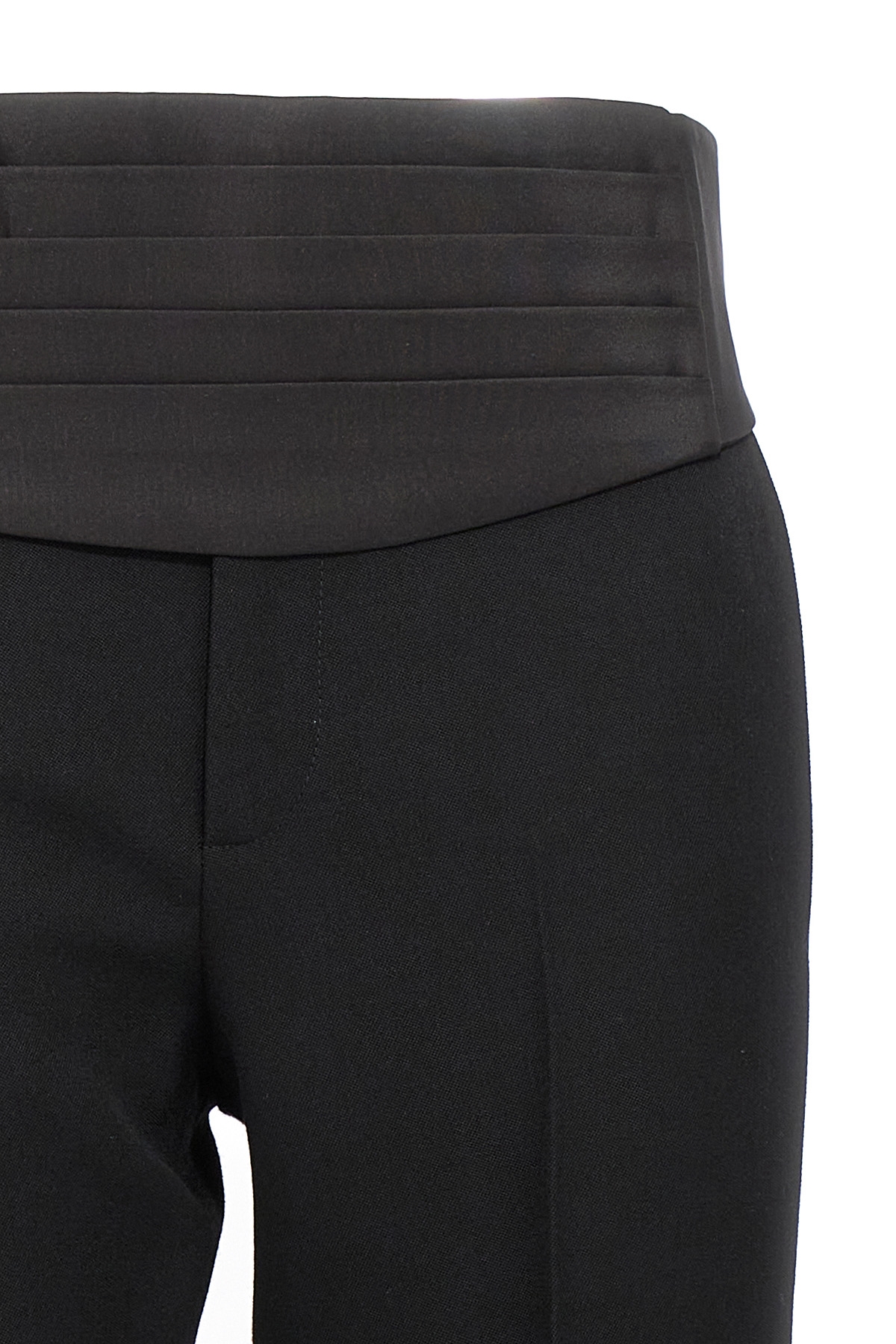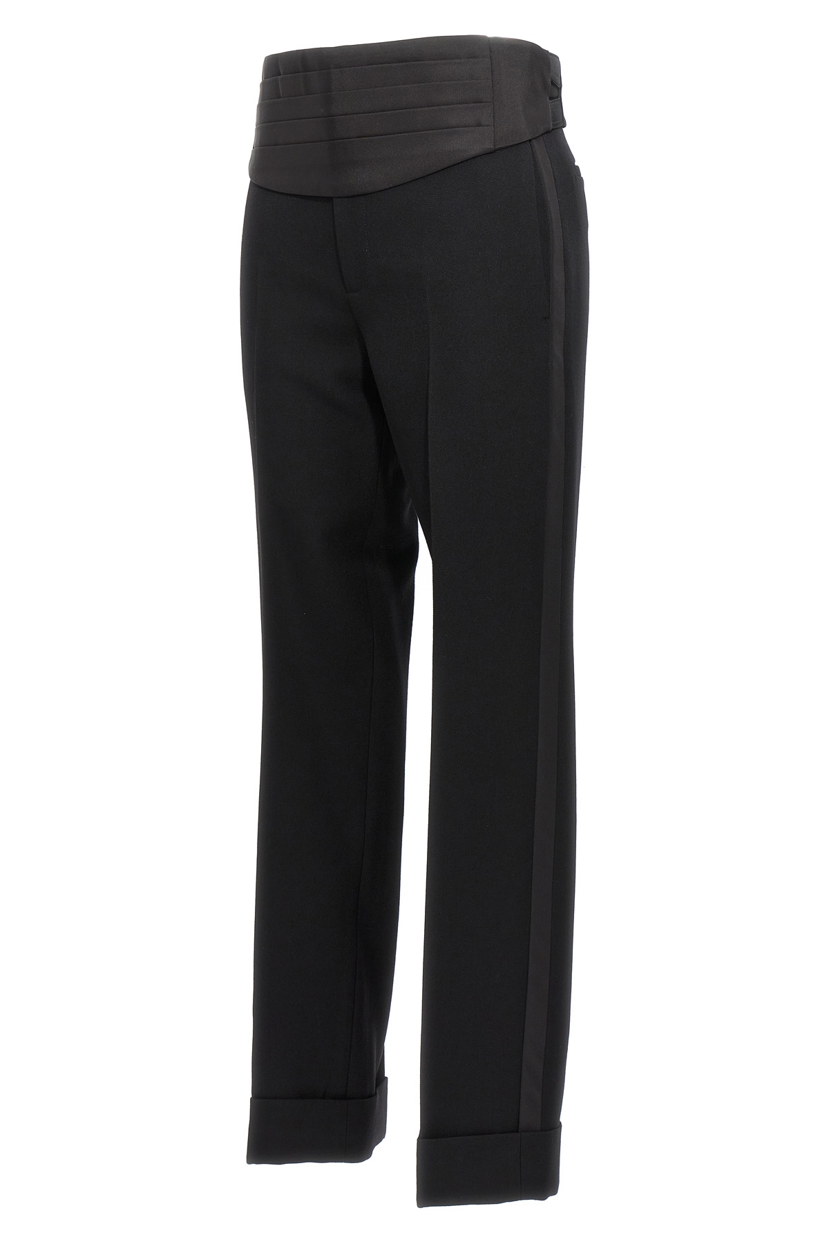 'New Barethea' wool pants with satin side bands, central pleat leg, hook and button zip closure, pockets and turned-up hem. Removable matching belt.