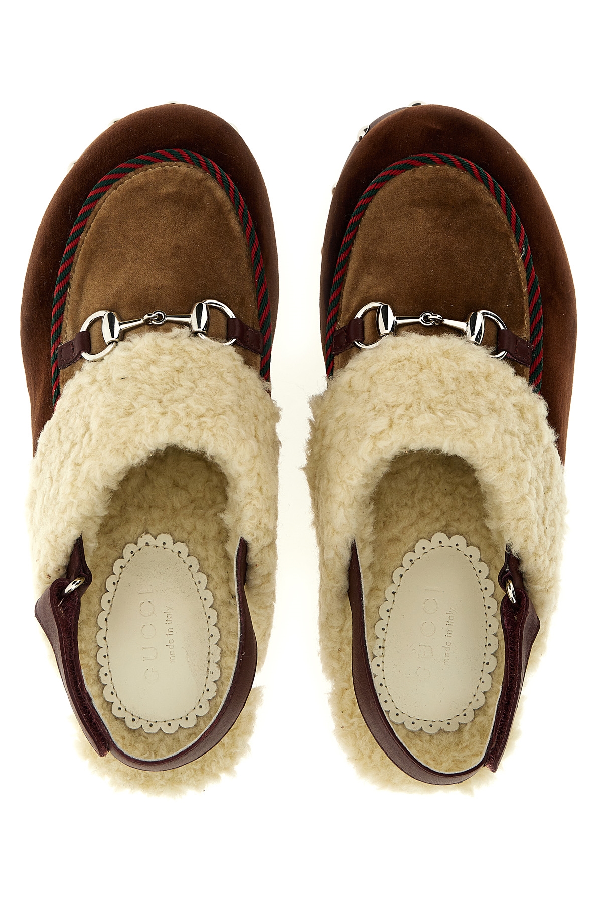 JULIAN KIDS Velvet clog, wool details, torchon embroidery with red and green Web pattern, front 'Morsetto' detail, back strap with velcro, rubber sole.