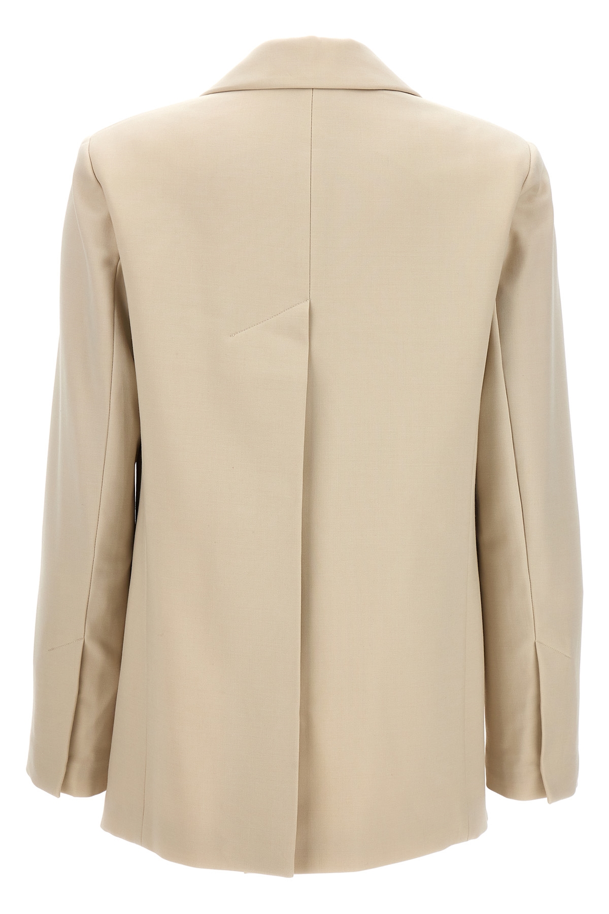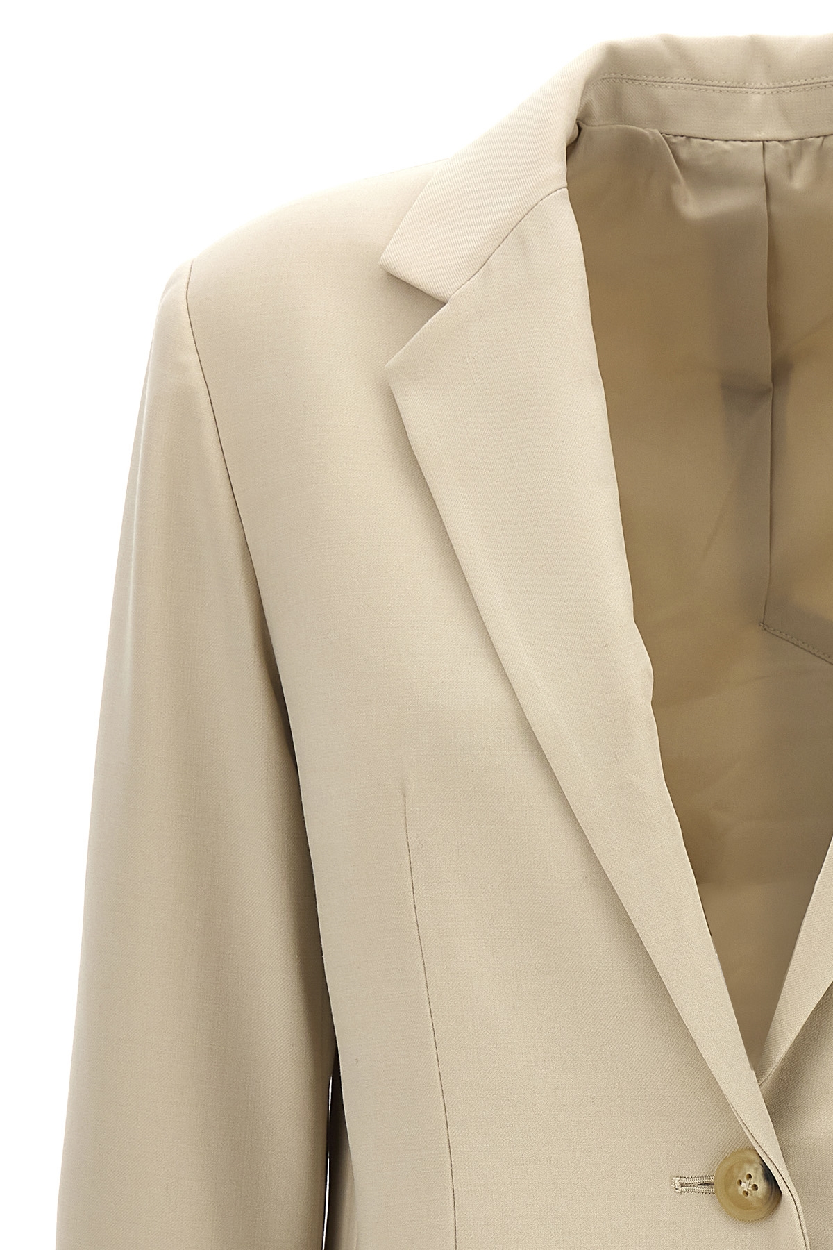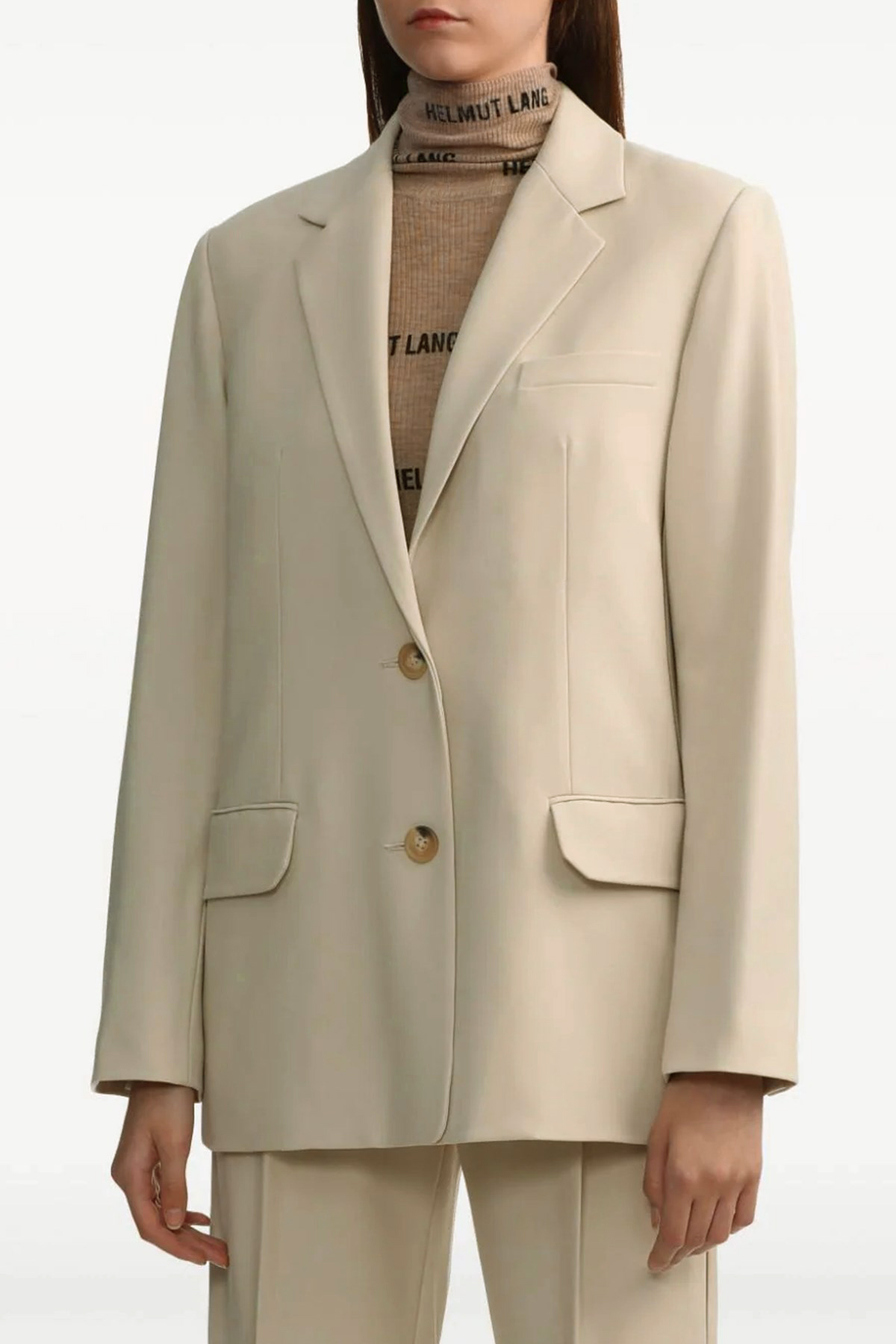 Single-breasted wool blend blazer with button closure, contrasting logo band, pockets, long sleeves, and back split.