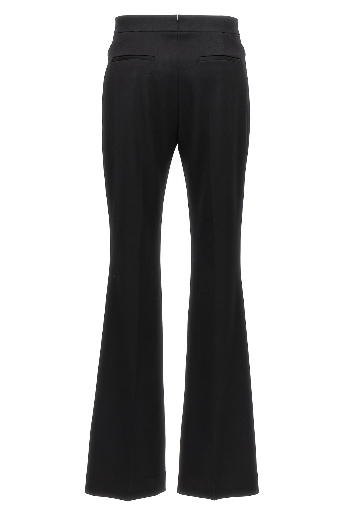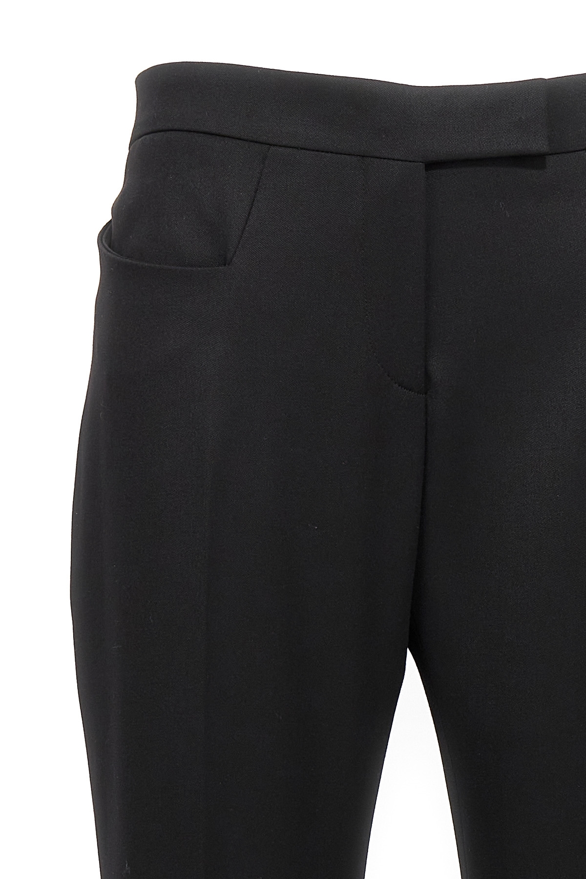 Wool pants with flared leg and central pleat, zip, hook and button closure, pockets.