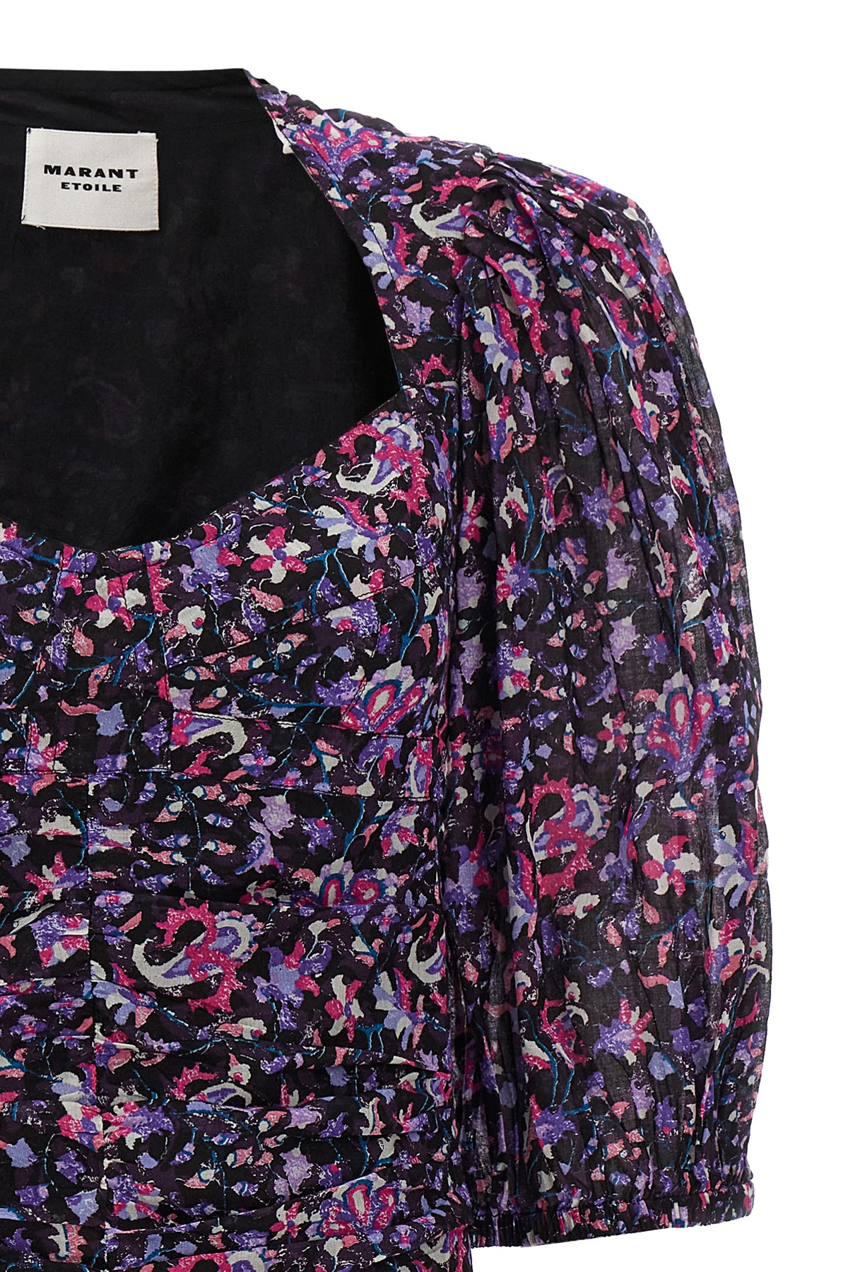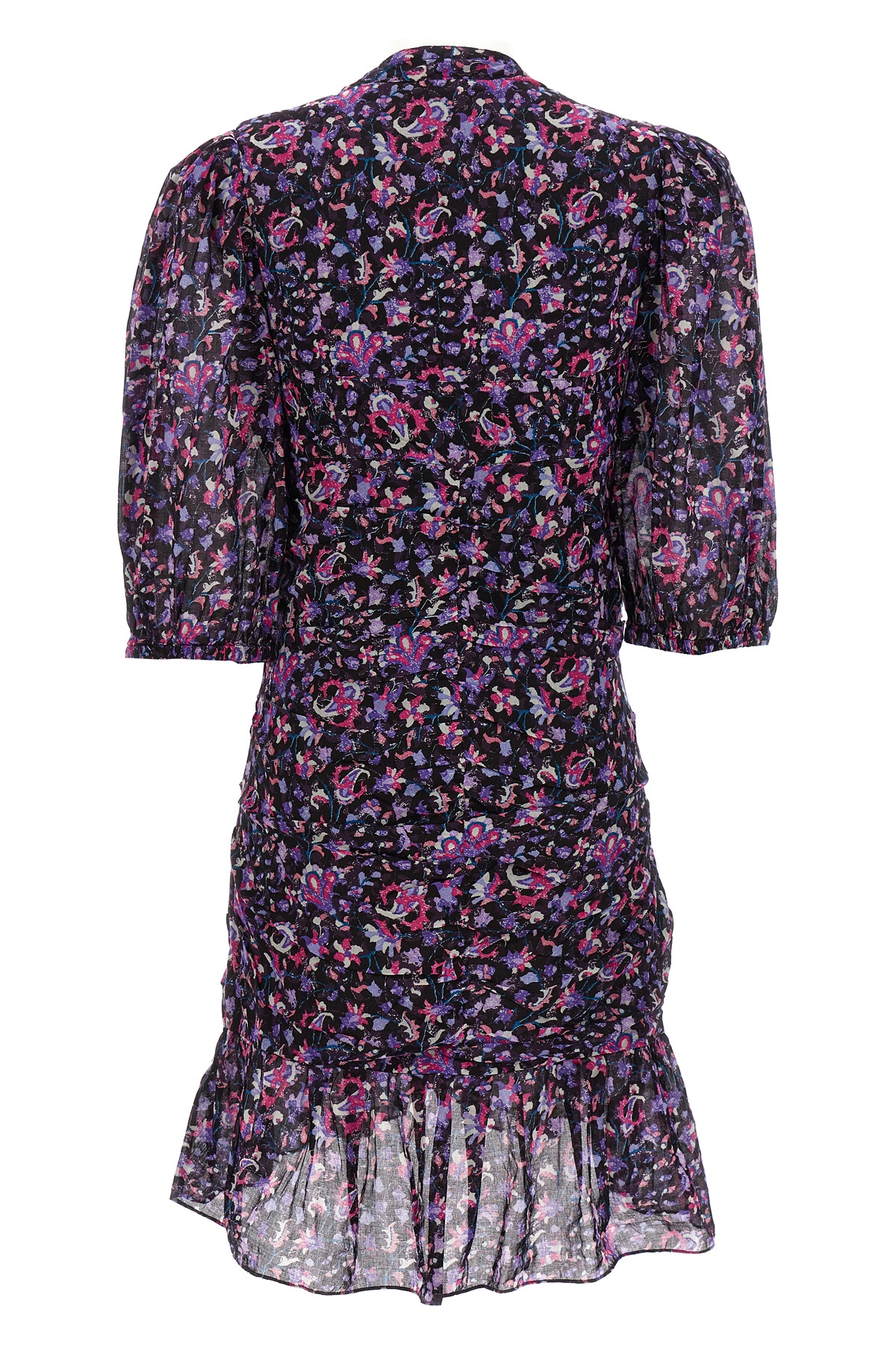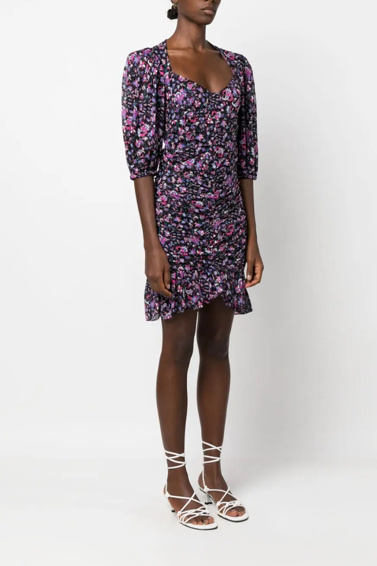 'Lunesa' floral print cotton dress with sweetheart neckline, 3/4 sleeves with elastic cuffs, draped skirt.